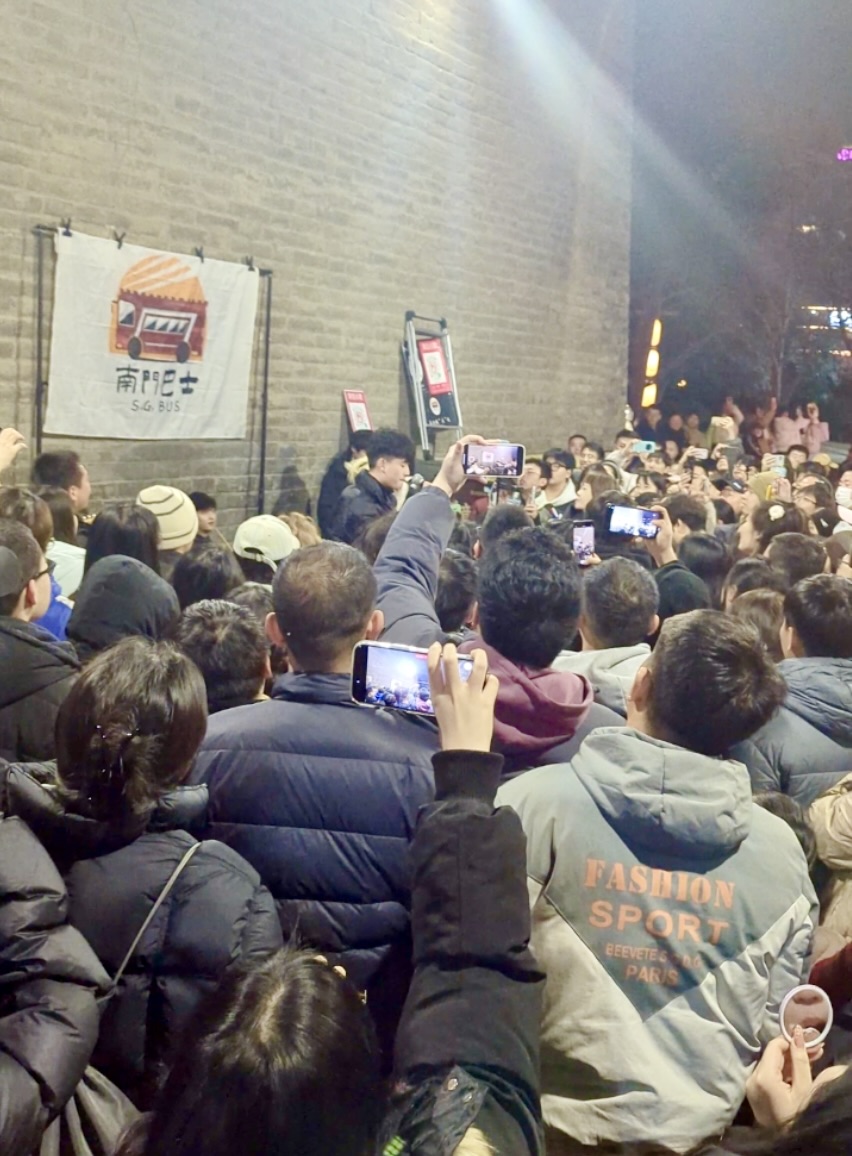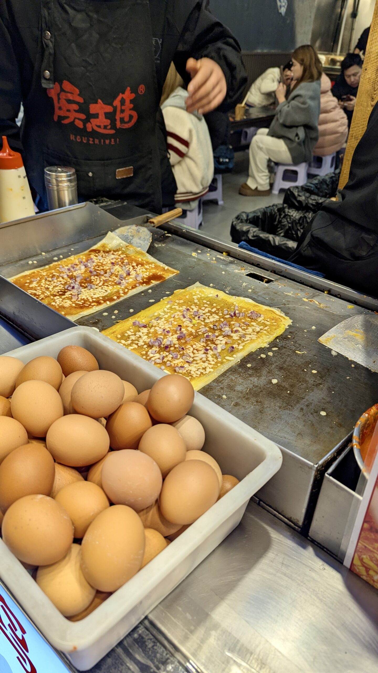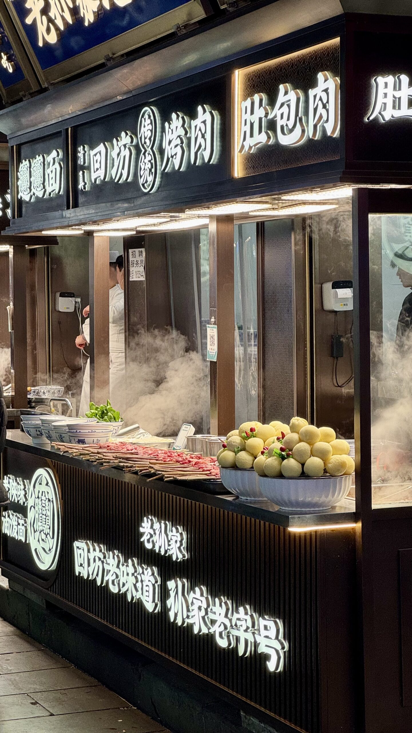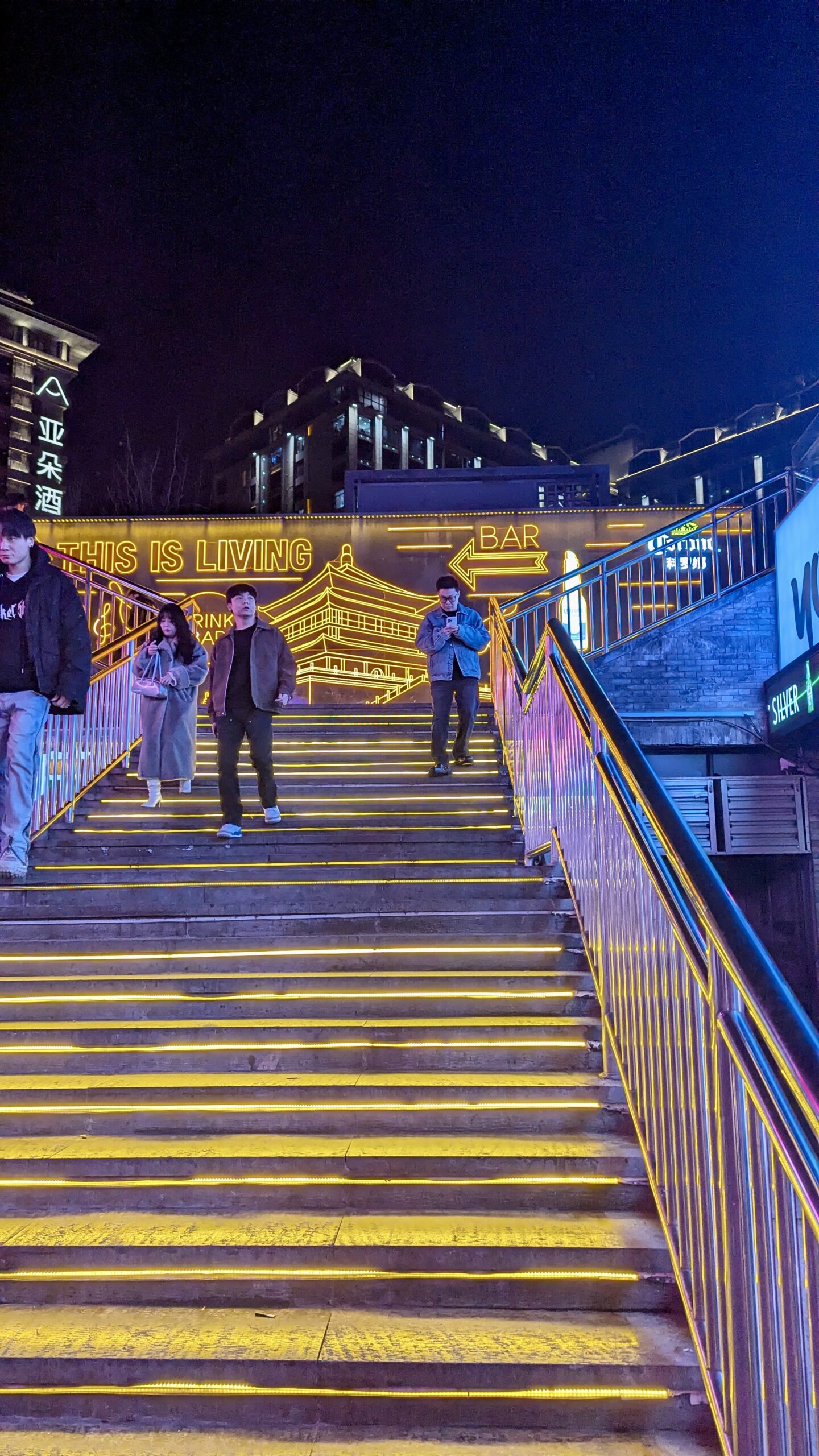Nachts war die Straße besonders beeindruckend – wunderschön beleuchtet und voller Leben. Man konnte das pulsierende Nachtleben förmlich spüren. Während wir noch ein wenig durch die Straßen schlenderten, halfen wir Xinyang, ein Mitbringsel für seine Freundin in Harbin zu finden. Danach führte uns Wang gegen 0:30 Uhr in ein chinesisches BBQ-Restaurant.