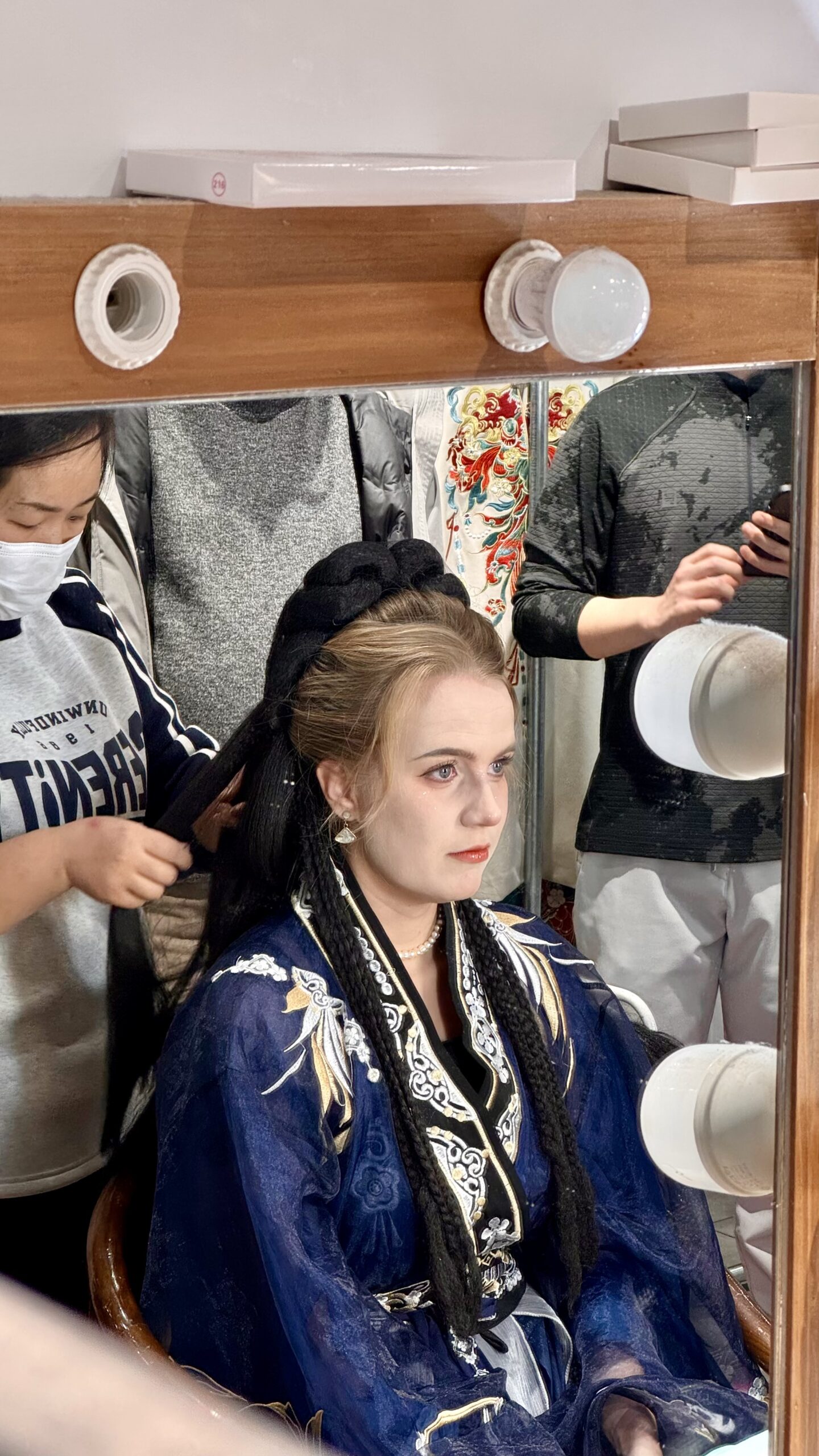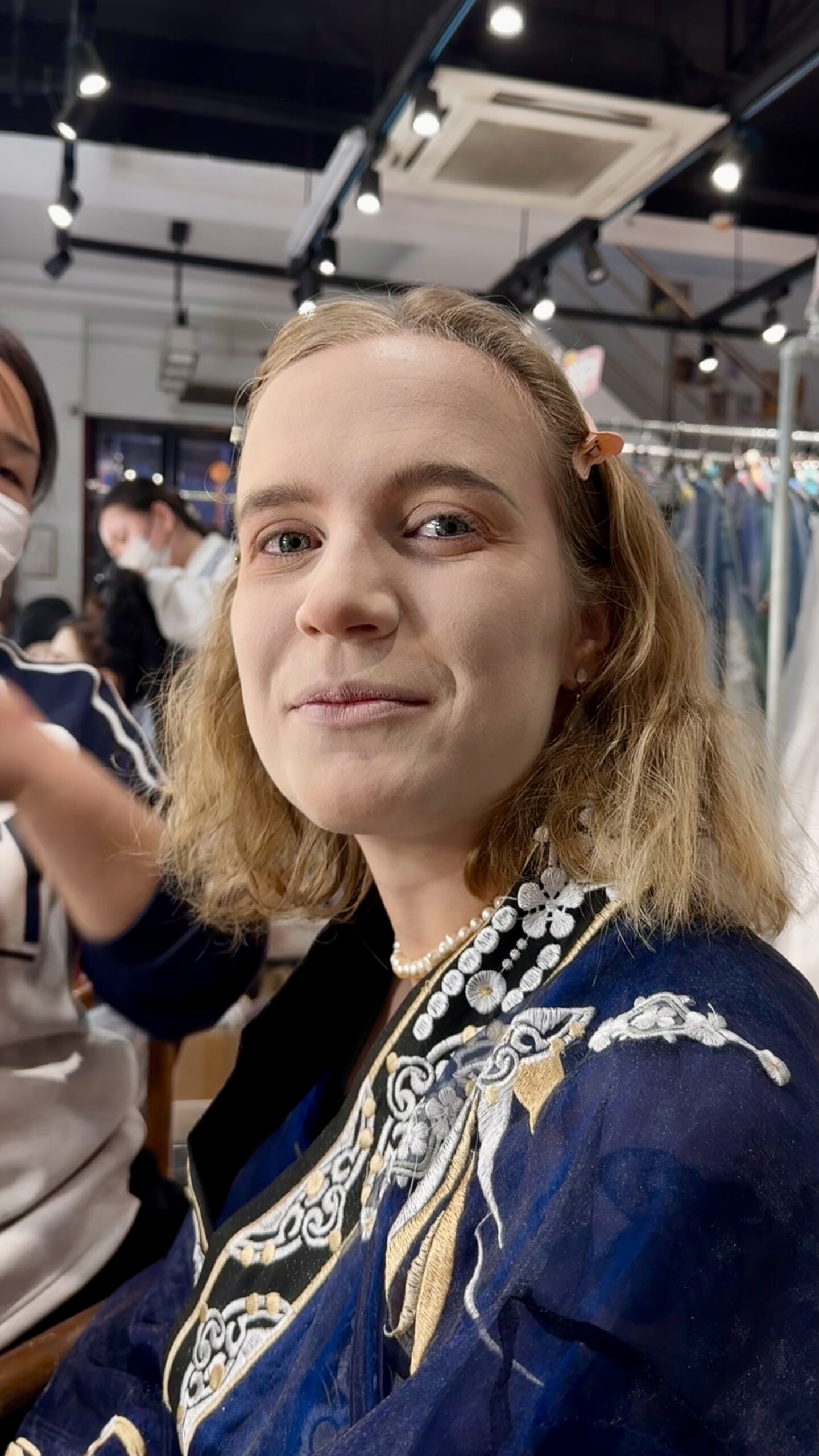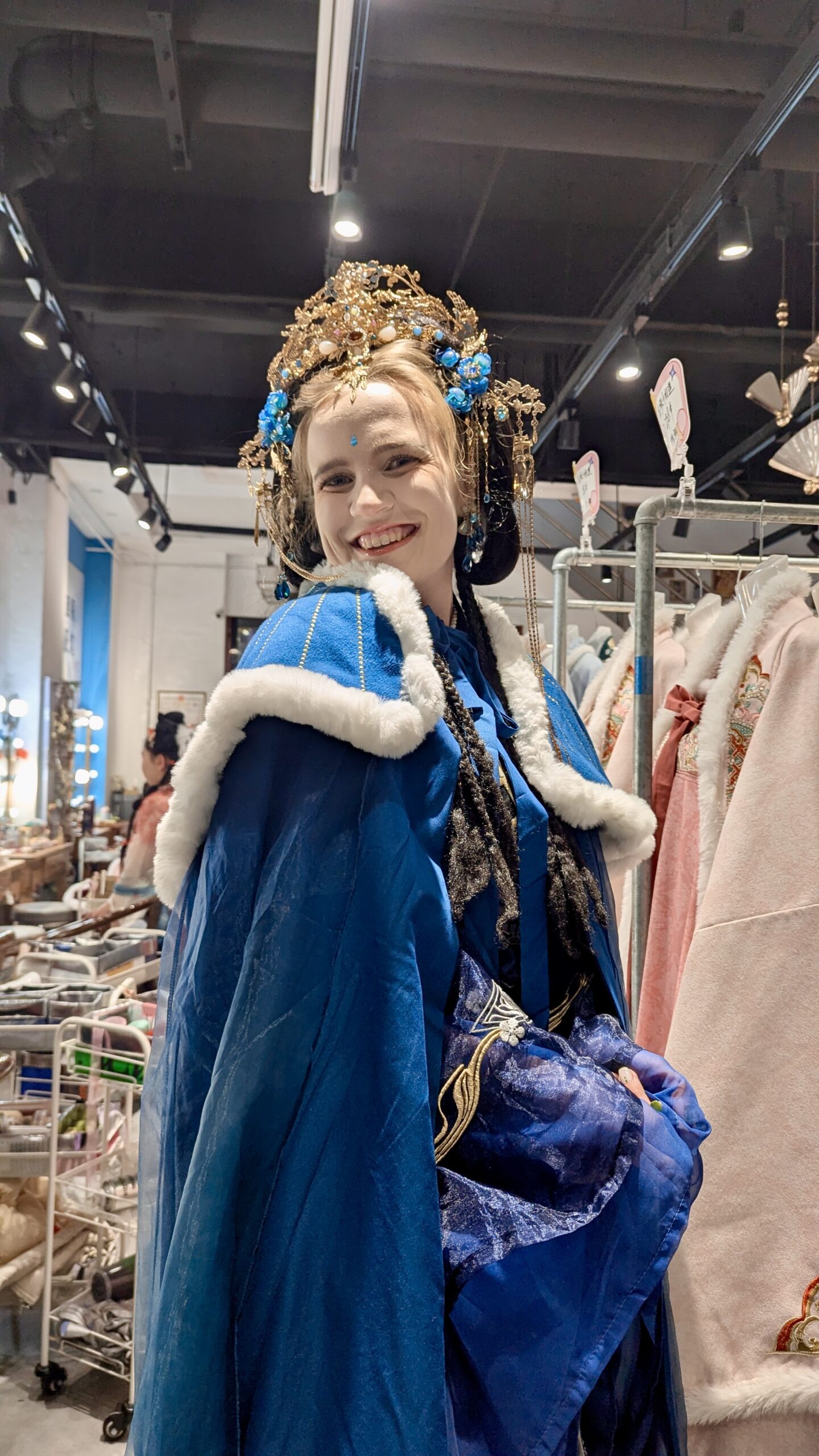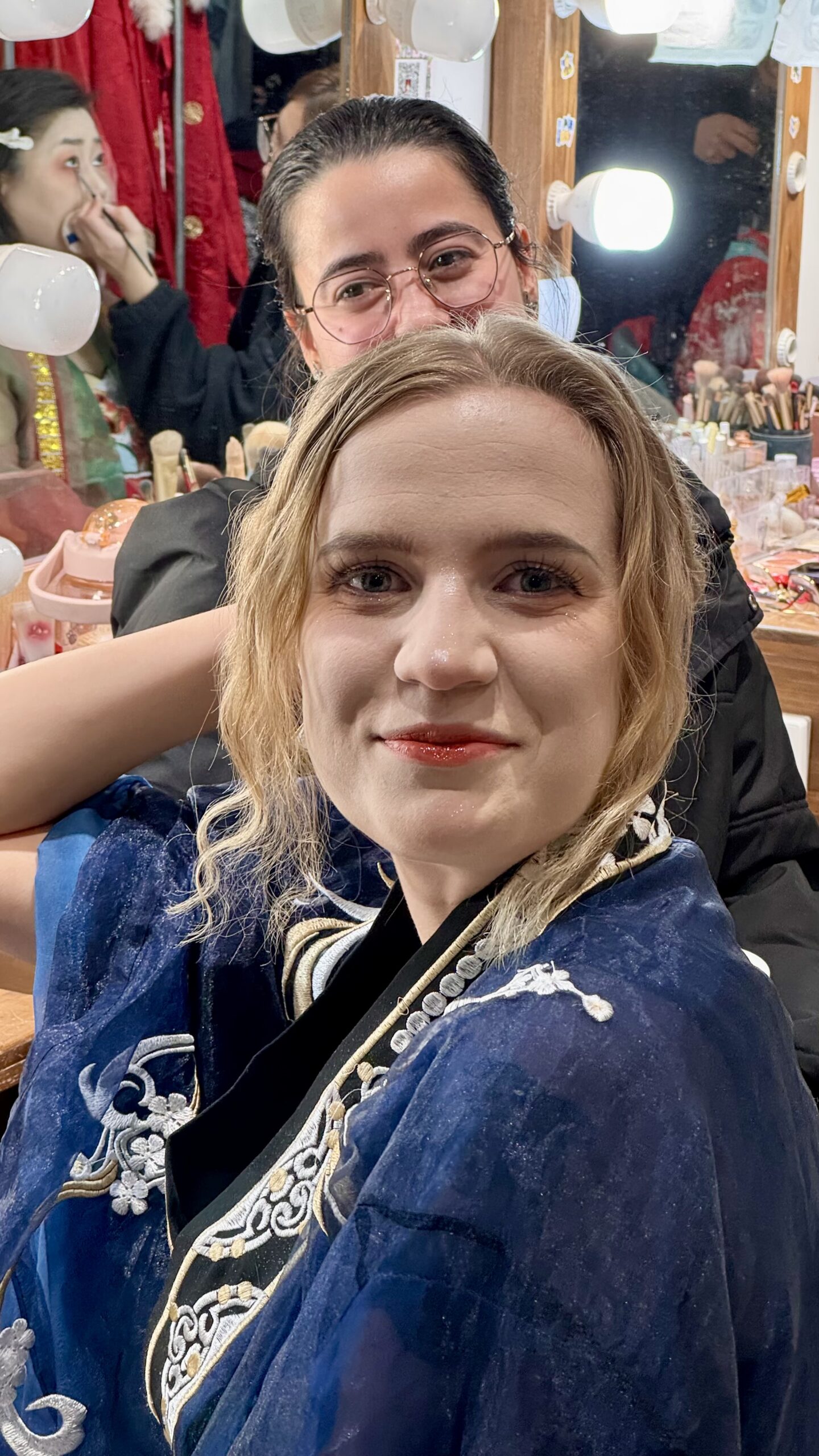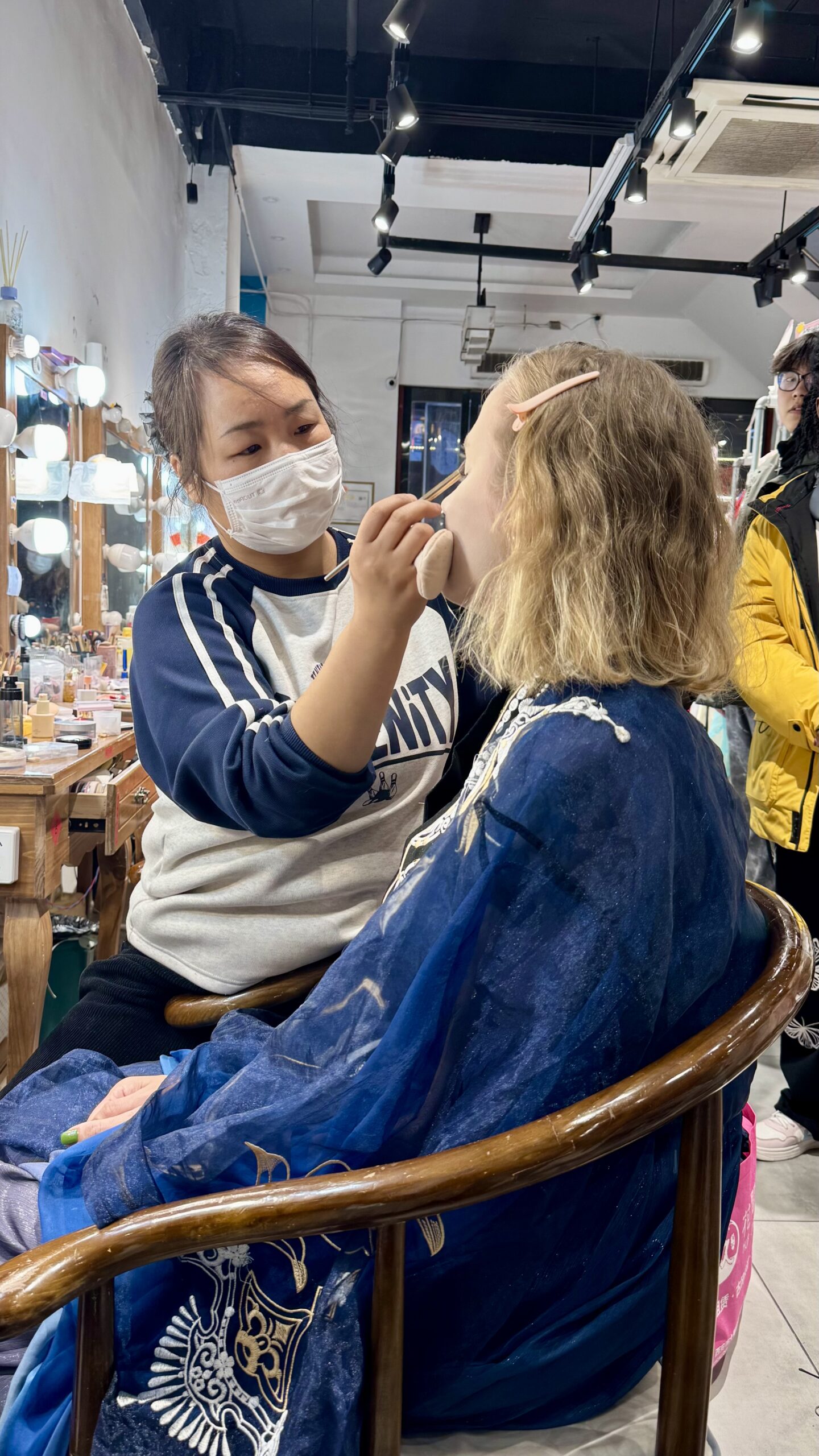 Zuerst suchte ich mir ein wunderschönes blaues Kleid aus der Han-Dynastie aus und ließ mich schminken. Ich wusste, dass viele Asiaten sich gerne etwas heller schminken, als ihr natürlicher Hautton ist. Aber ich dachte, ich wäre schon blass genug – und dann: Holy Shit. Ich bekam so viel Make-up ins Gesicht geklatscht! Ich glaube, ich hatte noch nie so eine dicke Schicht drauf. Immer wieder schaute ich in den Spiegel und dachte mir: „Puh, Jessi, trust the process. Das wird schon gut aussehen am Ende!“