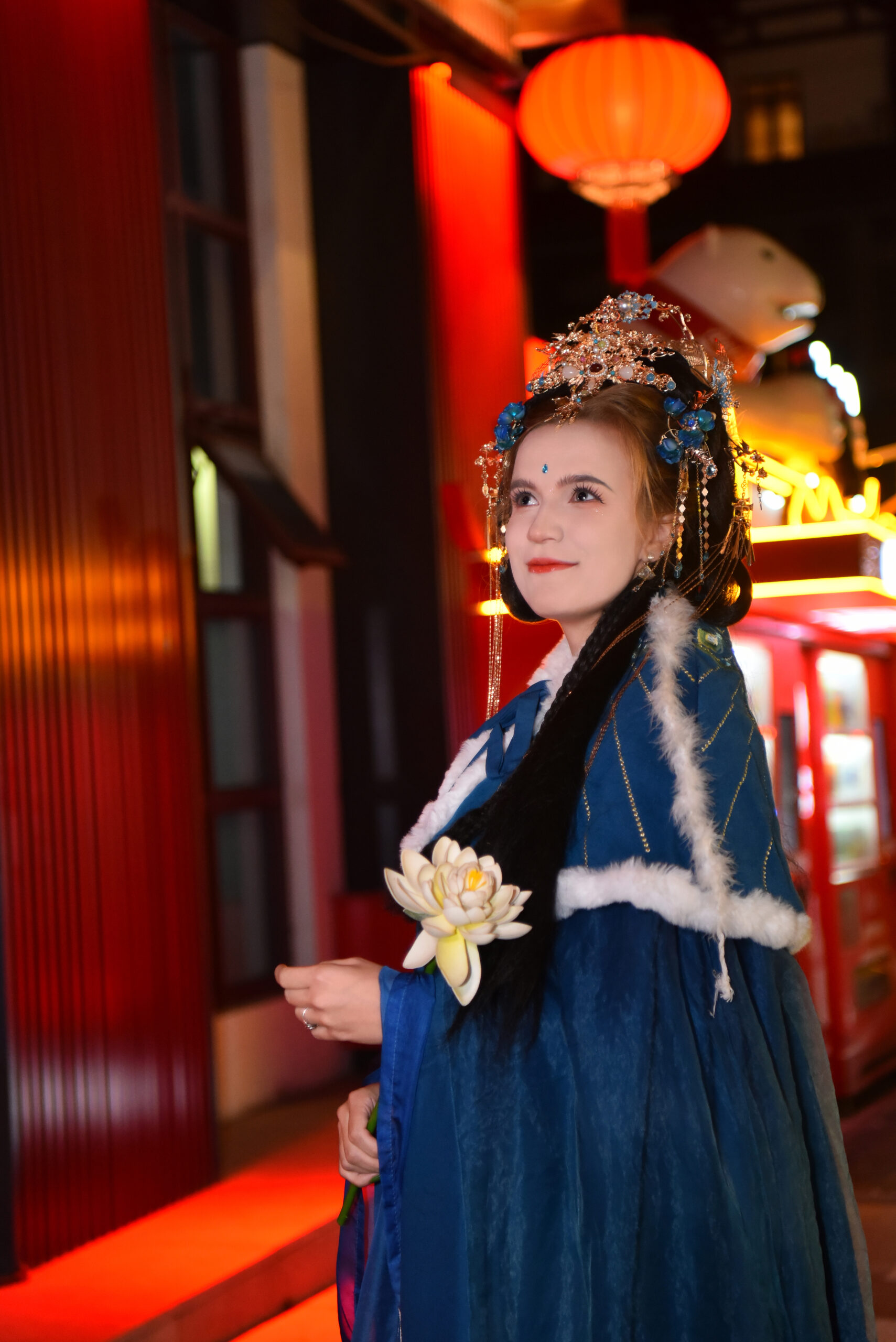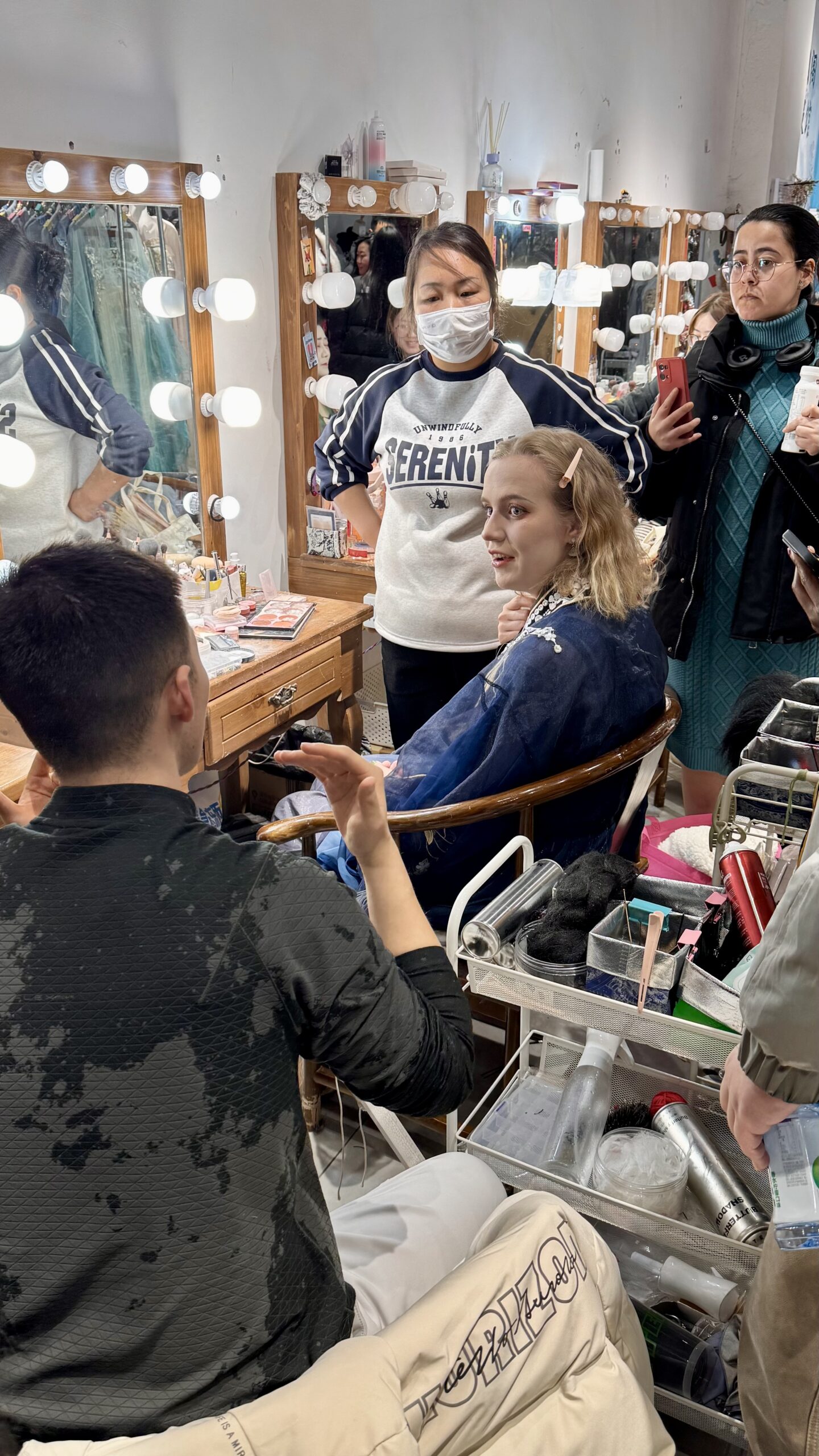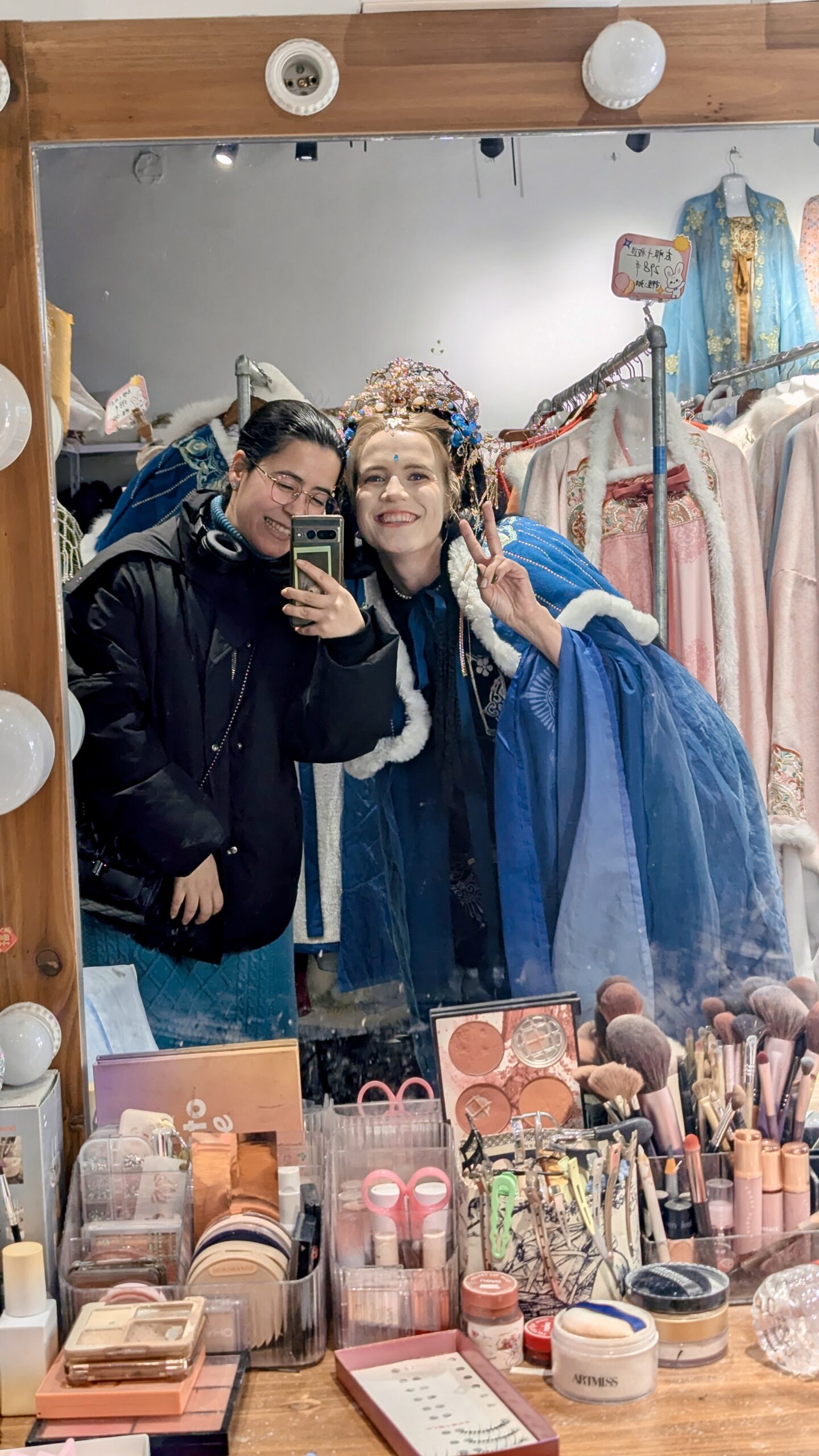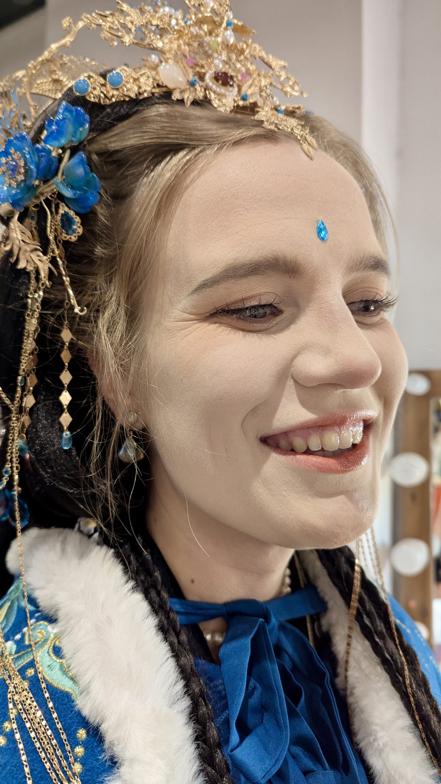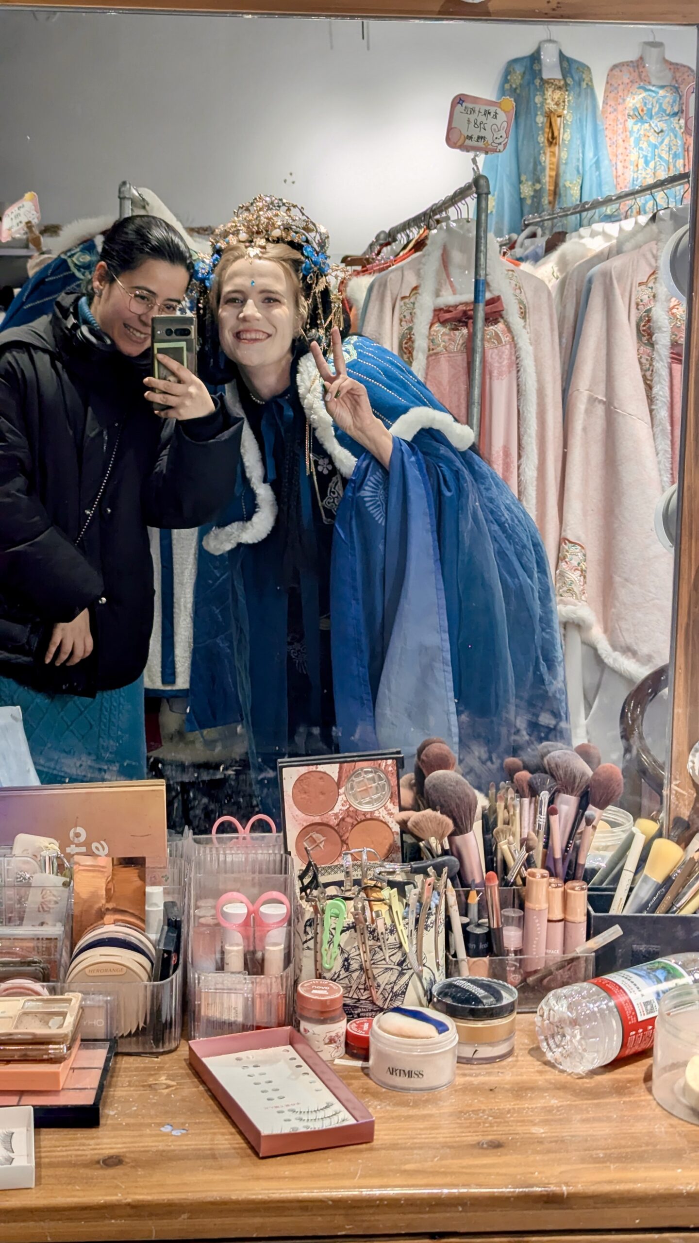 Zuerst suchte ich mir ein wunderschönes blaues Kleid aus der Han-Dynastie aus und ließ mich schminken. Ich wusste, dass viele Asiaten sich gerne etwas heller schminken, als ihr natürlicher Hautton ist. Aber ich dachte, ich wäre schon blass genug – und dann: Holy Shit. Ich bekam so viel Make-up ins Gesicht geklatscht! Ich glaube, ich hatte noch nie so eine dicke Schicht drauf. Immer wieder schaute ich in den Spiegel und dachte mir: „Puh, Jessi, trust the process. Das wird schon gut aussehen am Ende!“