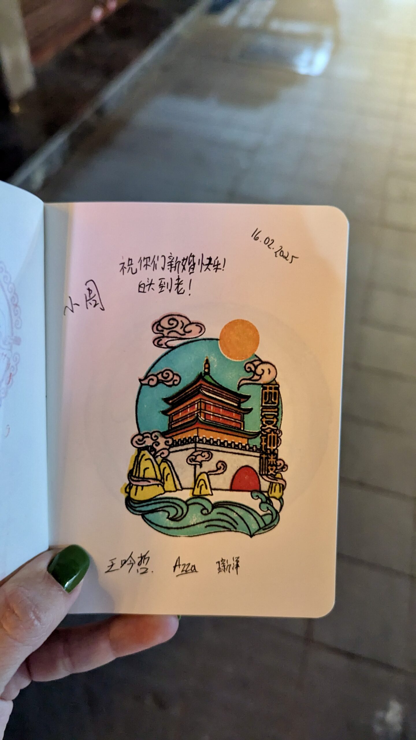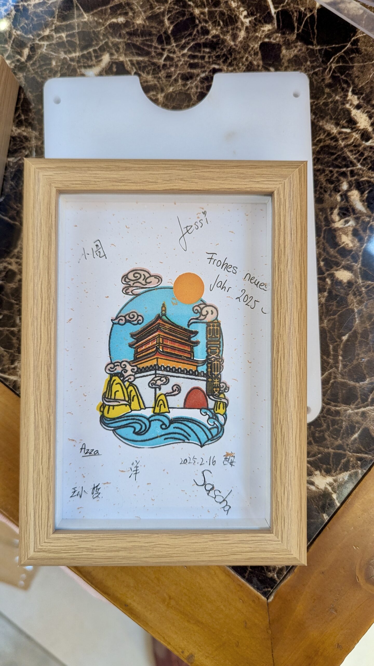 Jojo und Xinyang hatten außerdem die Idee, dass ich ihnen eine kleine Widmung auf Deutsch schreiben sollte. Am Ende signierten wir alle gegenseitig unsere Bilder. Xinyang nutzte die Gelegenheit, um uns zukünftige Glückwünsche für unsere Hochzeit zu hinterlassen und wünschte uns eine Ehe, die für immer halten solle. Jojo und Xinyang ließen sich die Bilder anschließend rahmen – und ich denke, ich werde mein Bild zu Hause vorsichtig aus dem Buch lösen und ebenfalls einrahmen. Eine wunderschöne Erinnerung!