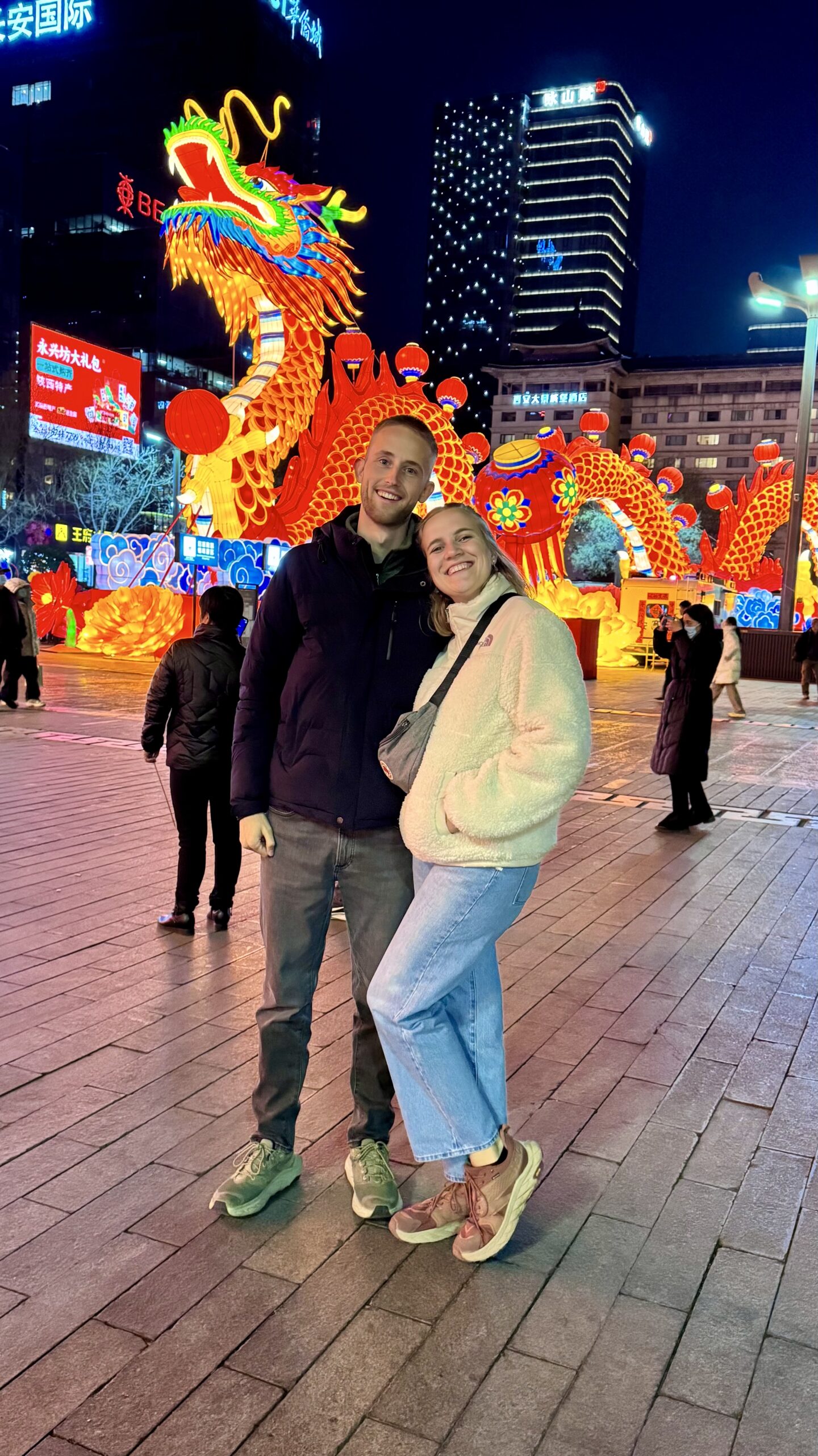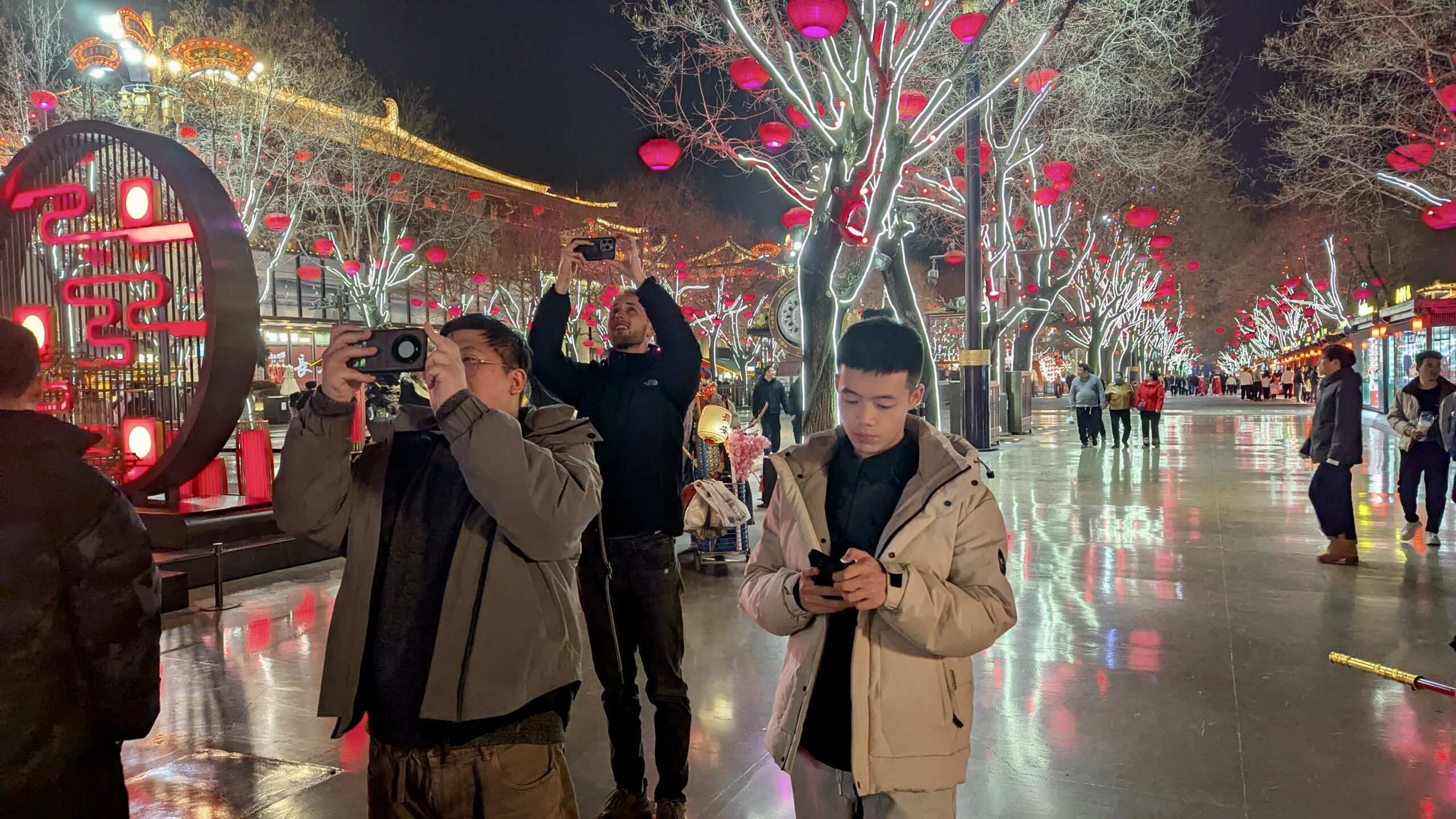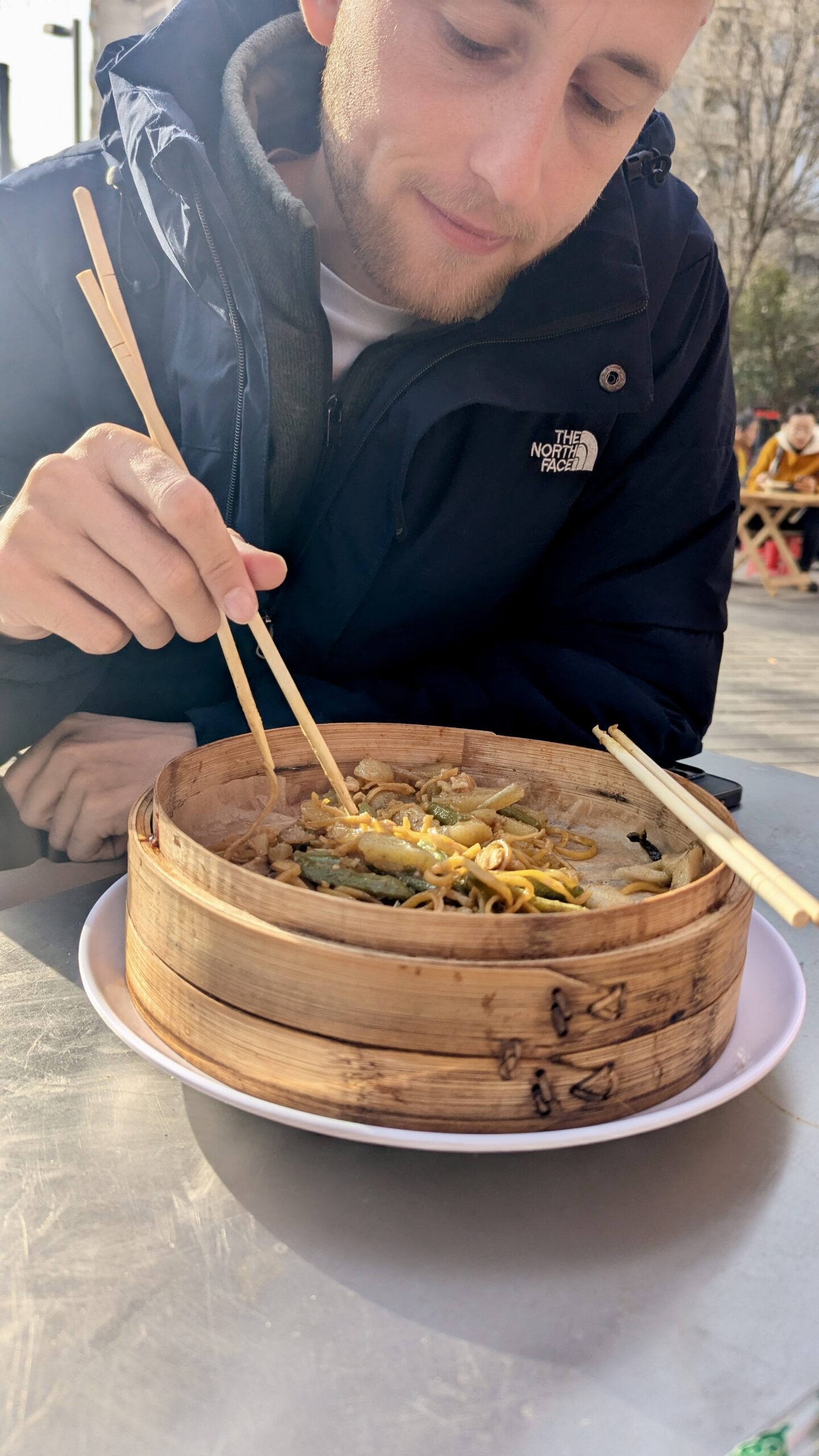 Gegen 18:30 Uhr trafen wir uns mit Wang und seinem Freund Xinyang. Er kommt aus Harbin, einer der kältesten Städte Chinas, wo im Winter riesige Eisskulpturen gebaut werden. Die Temperaturen dort fallen regelmäßig auf -40 °C. Xinyang war richtig begeistert, uns kennenzulernen, und versuchte, so viel wie möglich mit uns zu reden – auch wenn Wang oft als Übersetzer zwischen uns einsprang.