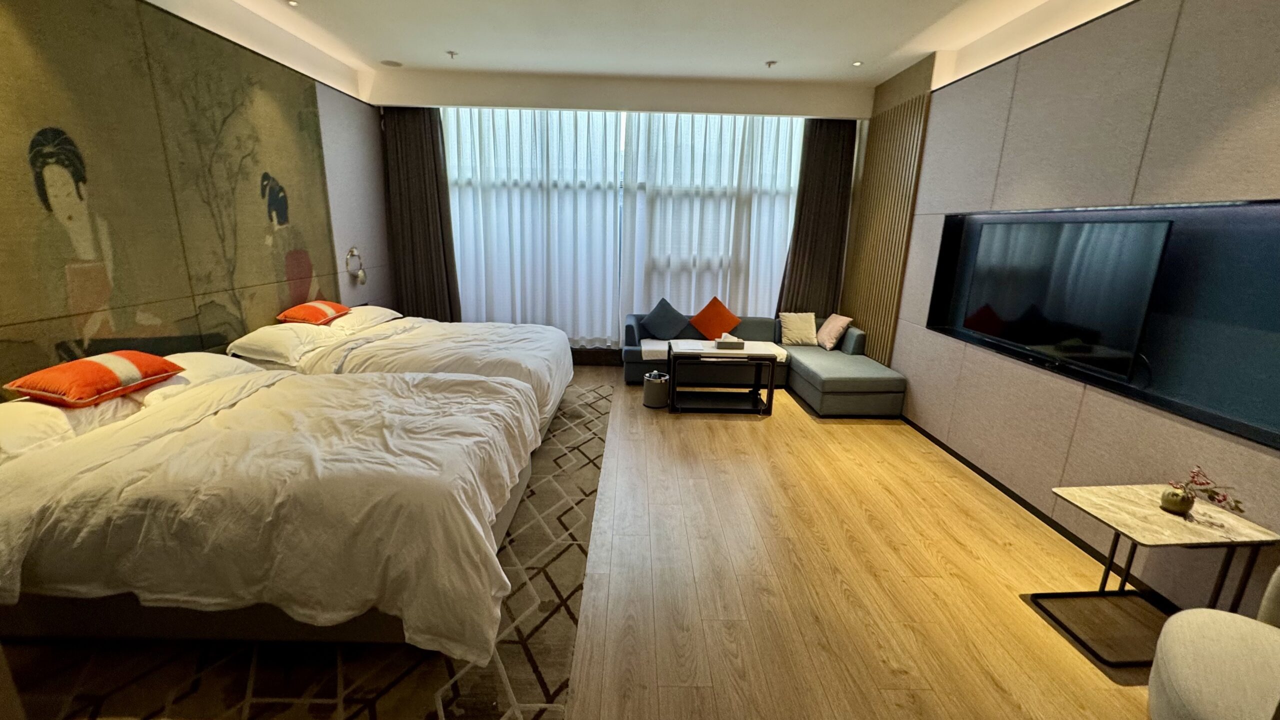 Über die einschlägigen Buchungsseiten fand Sascha direkt ein Hotel auf der anderen Straßenseite, nur ca. vier Minuten entfernt. Es kostete zwar acht Euro mehr (30 € pro Tag), machte aber einen deutlich besseren Eindruck. Wir liefen kurzerhand rüber und fragten an der Rezeption (via Übersetzungs-App), ob noch ein Zimmer für uns frei wäre. Sie boten uns spontan eine kleine Suite für 30 € pro Nacht an – inklusive Frühstück. Da sagten wir definitiv nicht nein! Ich glaube, ich machte kleine Luftsprünge, als wir das Zimmer betraten, das sich fast so groß anfühlte wie unsere halbe Wohnung. Wir fühlten uns sofort wohl und machten es uns bequem.