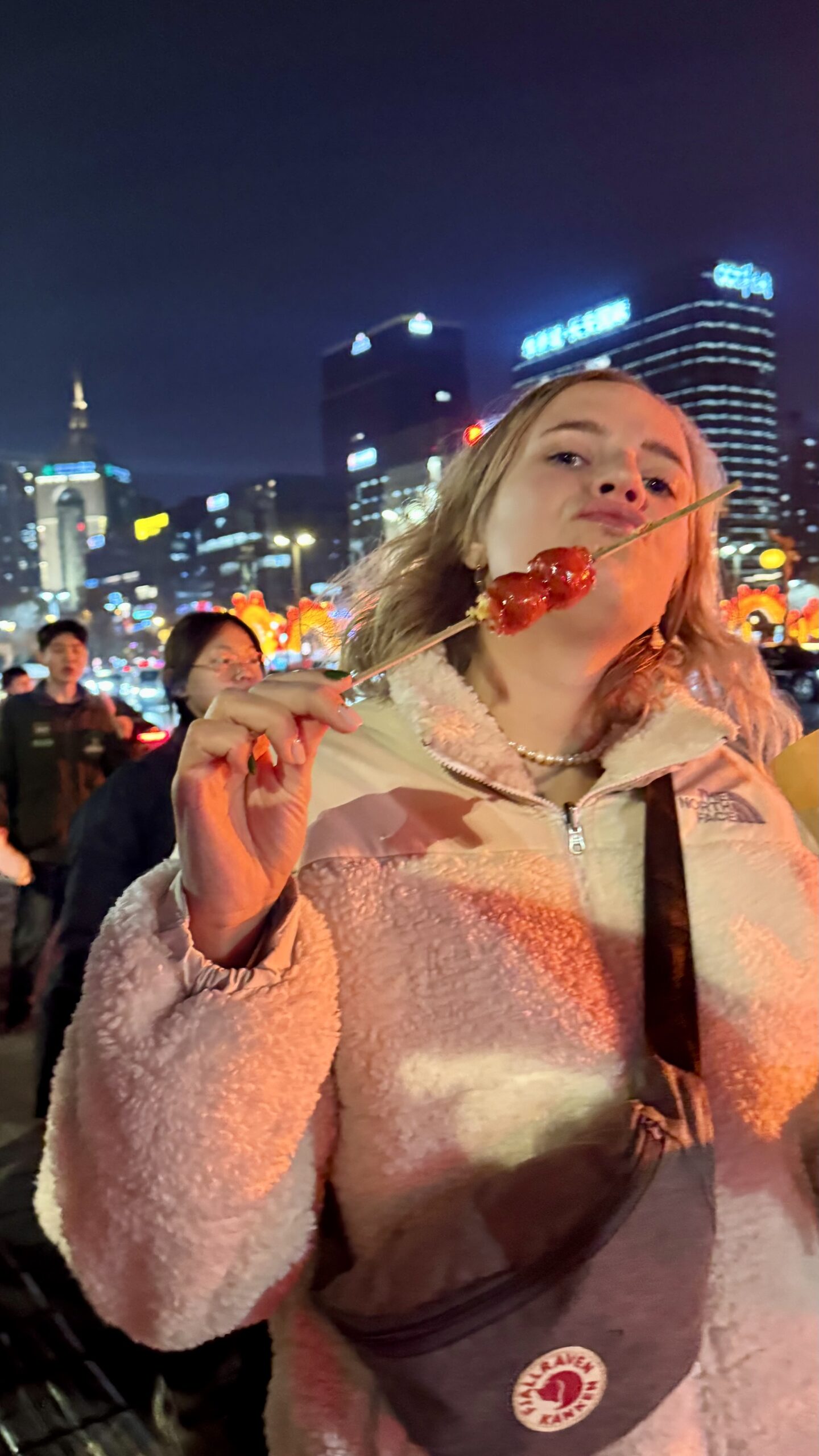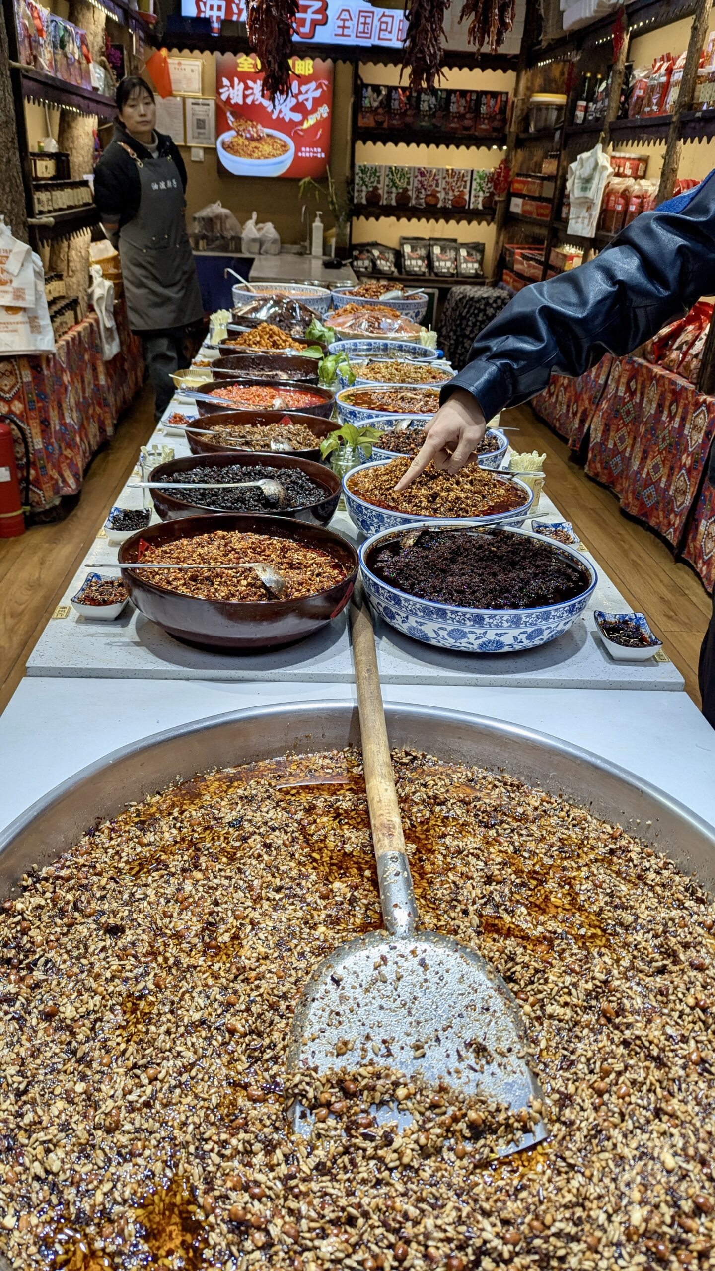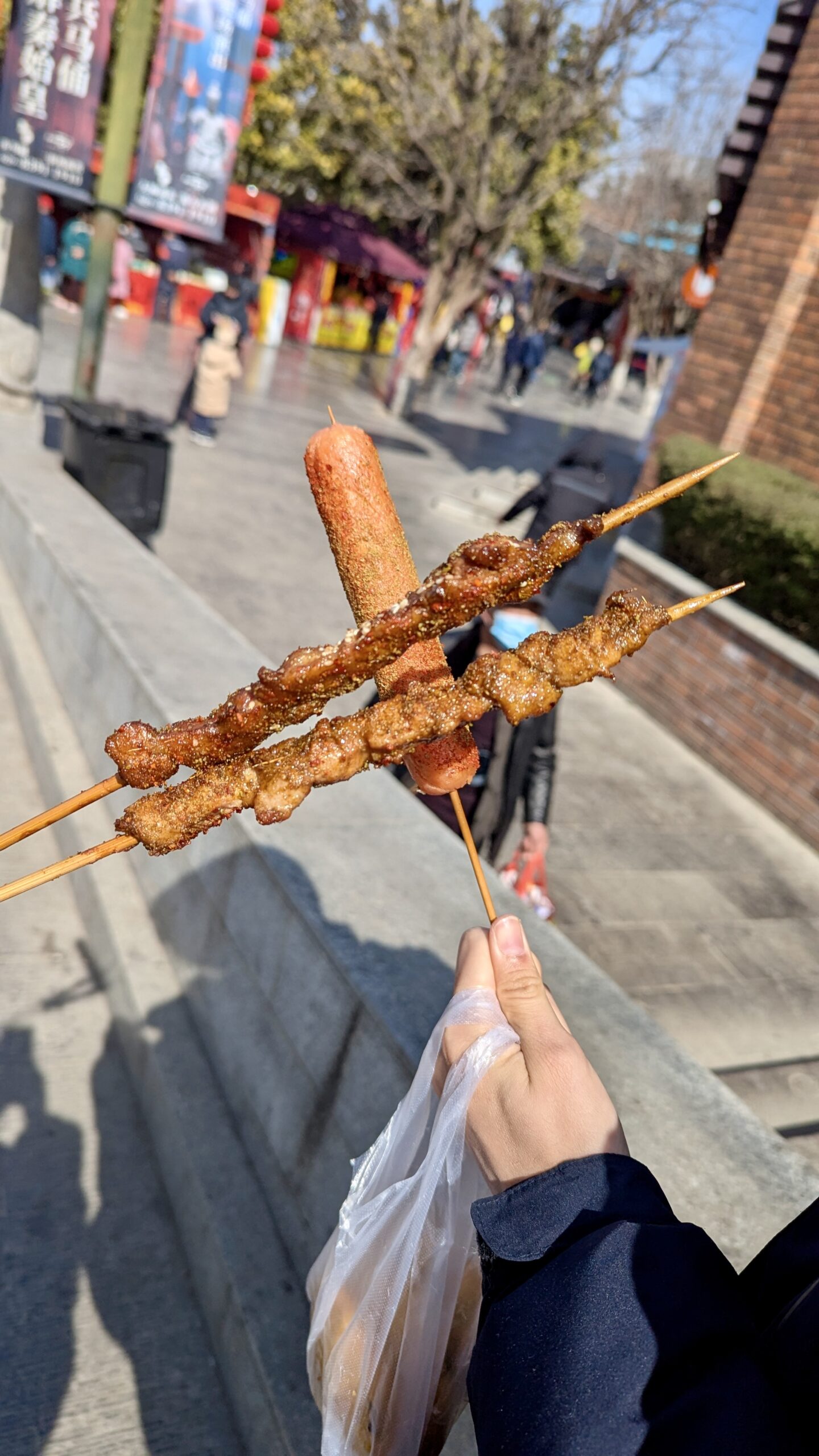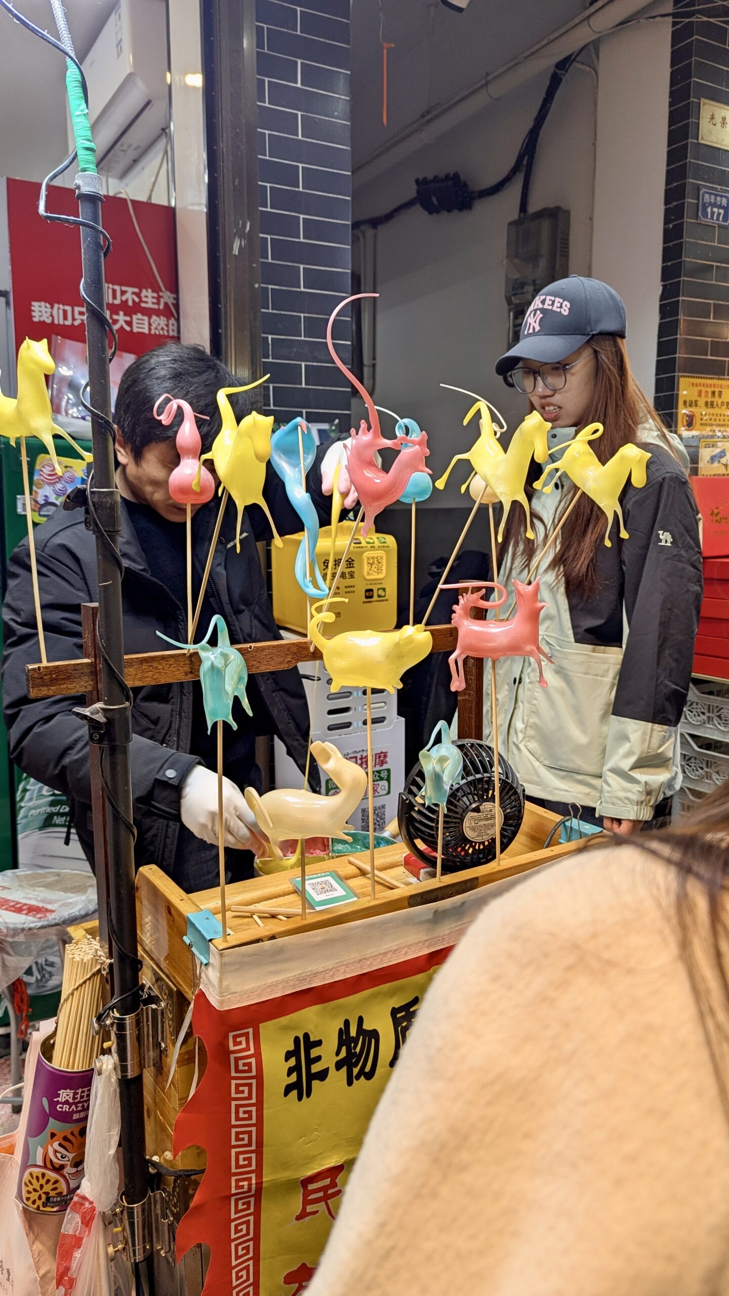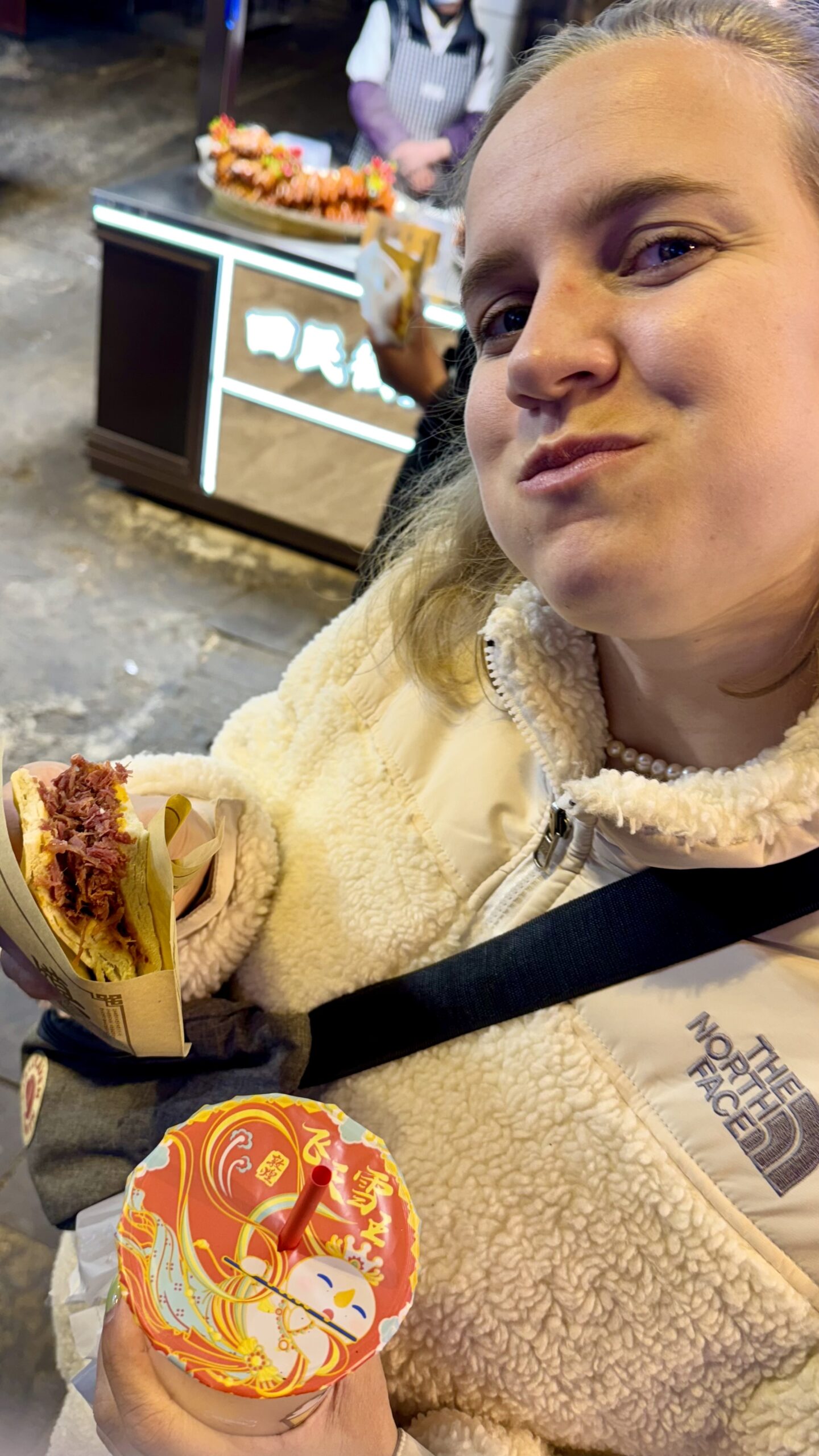 Wir schlenderten gemeinsam durch die Stadt, und zwischendurch kauften Jojo und Wang uns glasierte Früchte, die es hier wirklich an jeder Ecke gibt. Plötzlich hielten sie uns ein Stäbchen mit großen, glänzenden Früchten hin – chinesische Hagebutten, die viel größer sind als unsere. Was sollen wir sagen? Schön, es mal probiert zu haben… aber ein zweites Mal würden wir sie wohl nicht kaufen.