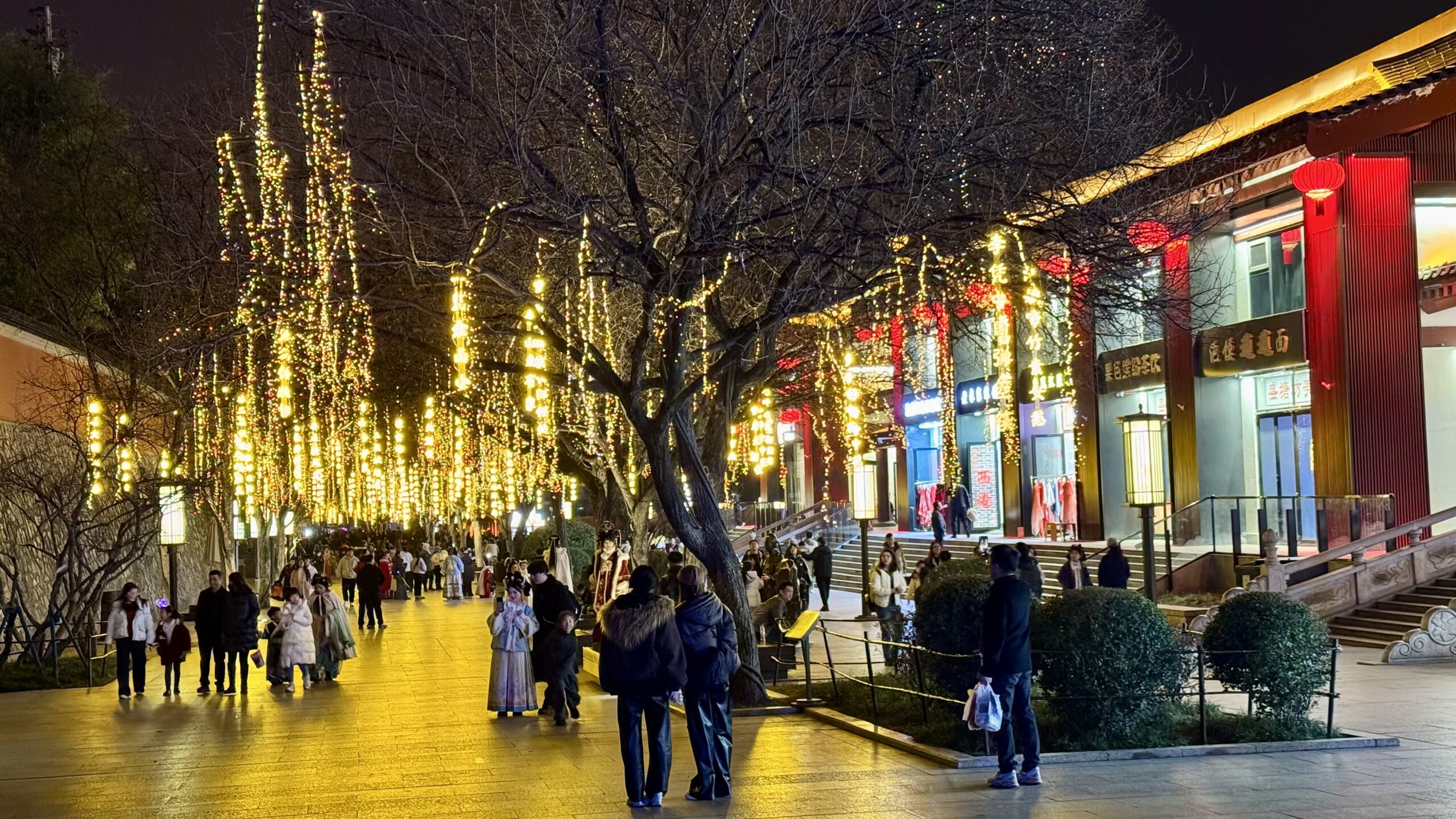 Wang führte uns aus dem muslimischen Viertel hinaus, zeigte uns die anderen Einkaufsstraßen, lief an der Moschee vorbei, die sich in einem alten Tempel verbirgt (leider war sie schon geschlossen), und führte uns in die Nachtszene von Xi’an, die sich direkt unterhalb der Stadtmauer befindet.
