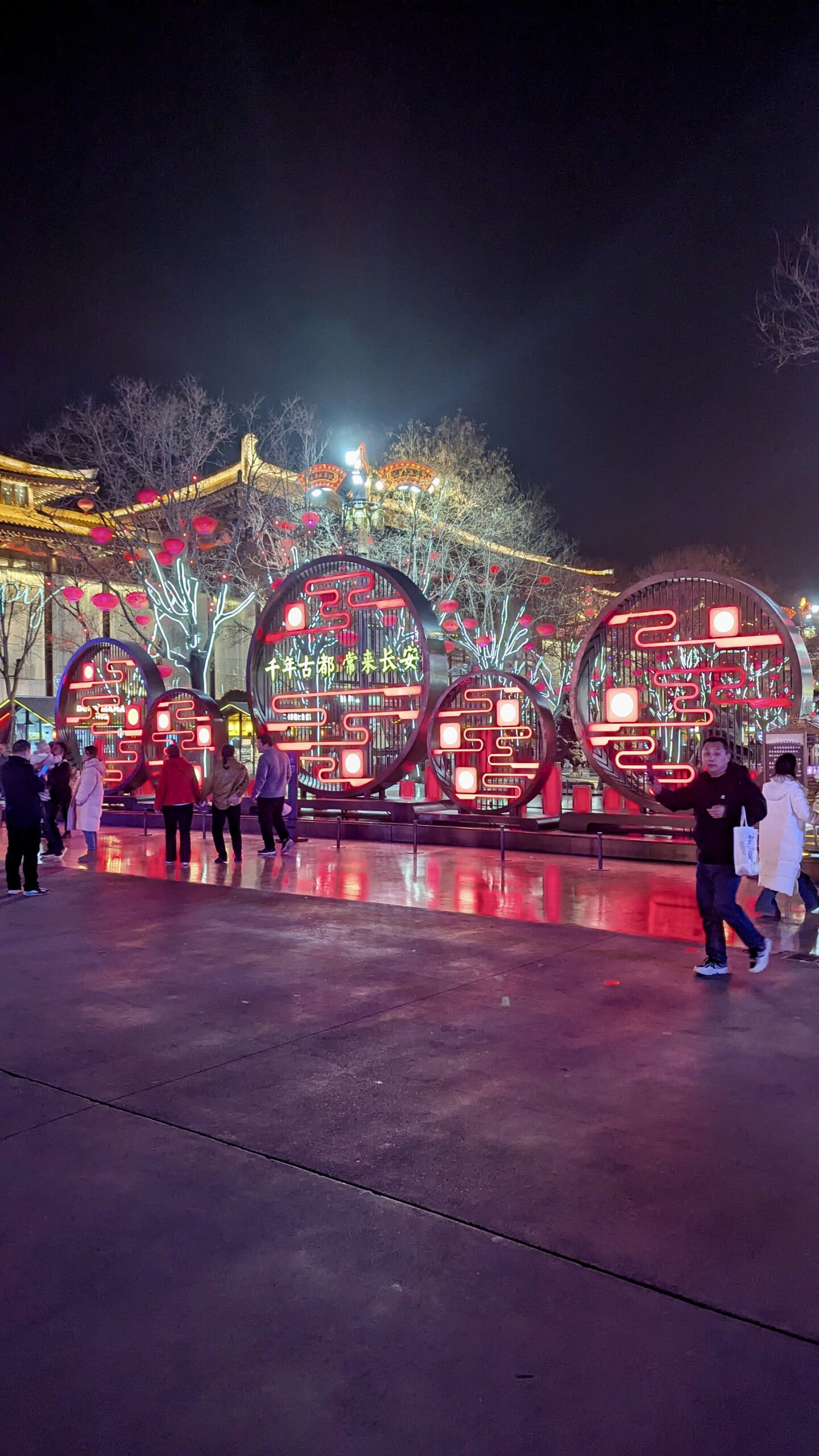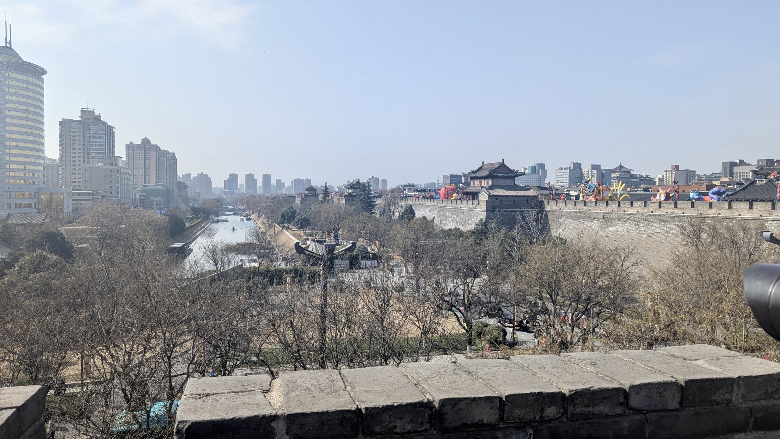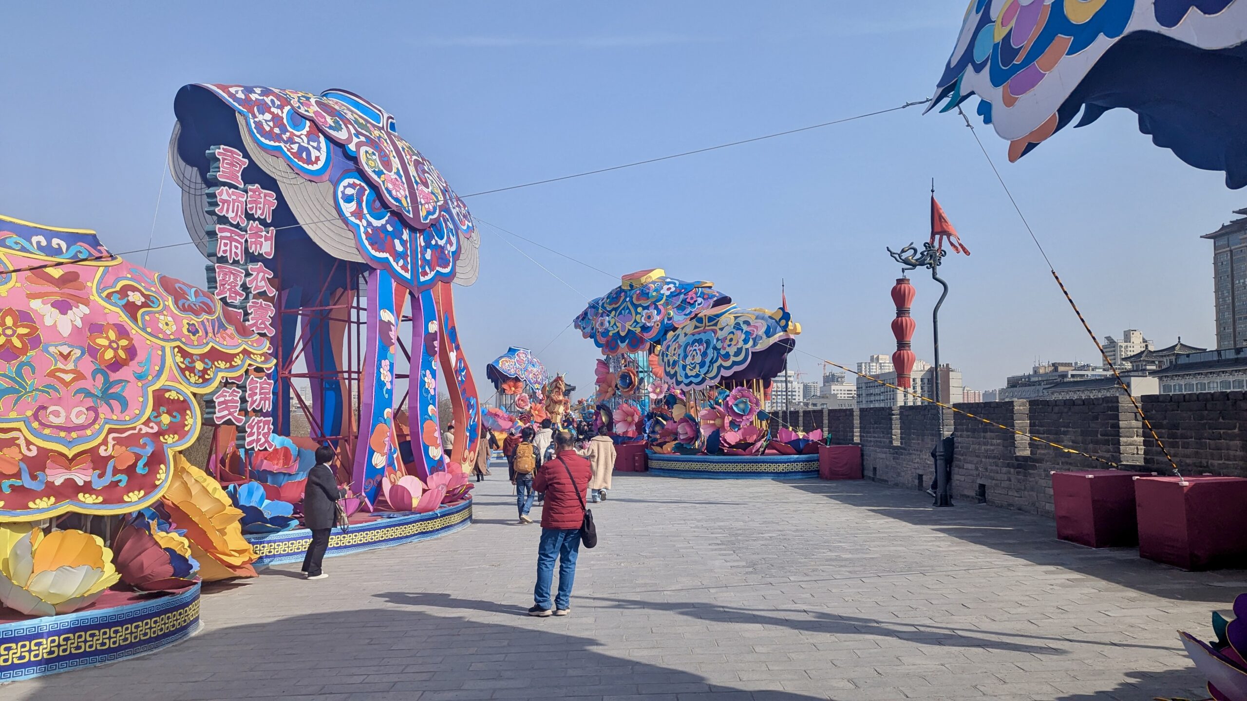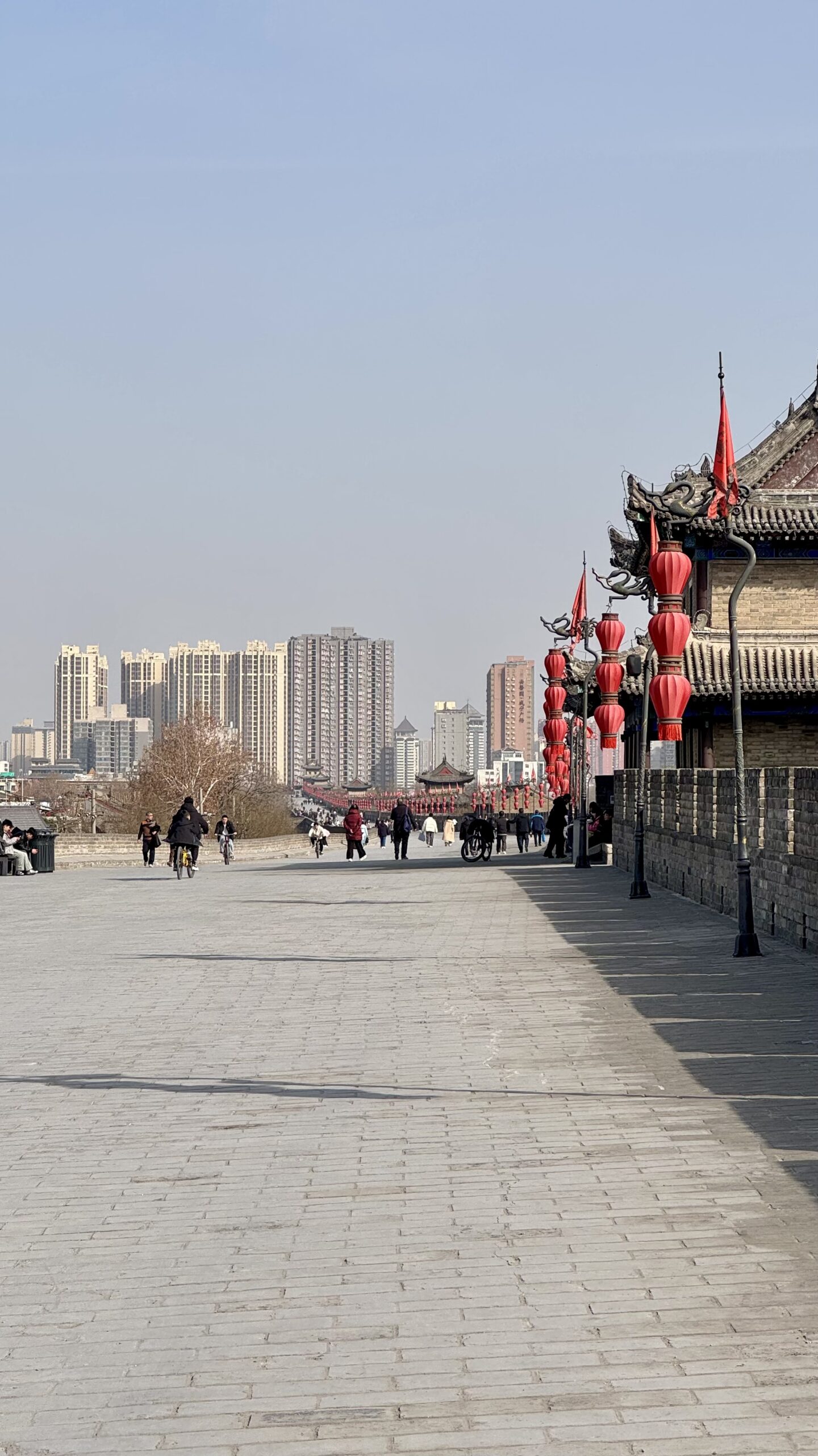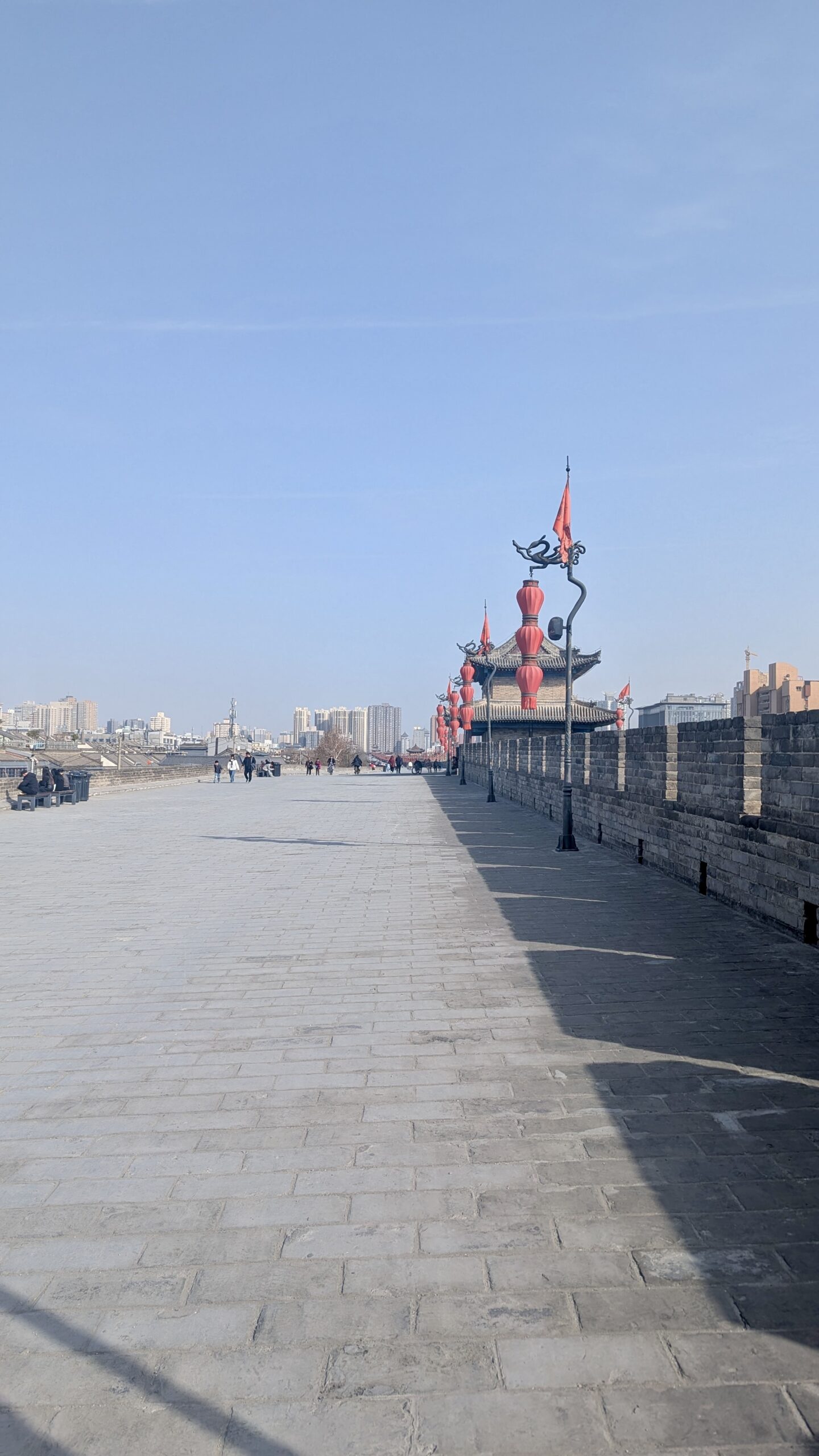 Unseren letzten Tag in Xi’an wollten wir entspannt angehen. Gegen Mittag machten wir uns zur Stadtmauer auf, zahlten überteuerten Eintritt (26 €), weil noch alle Aufbauten vom Laternenfest standen, und liefen ein gutes Stück entlang dieser endlos erscheinenden, schnurgeraden Mauer. Man kann hier oben auch Fahrräder leihen und die gesamte Mauer umrunden (ca. 13 km), aber da der Fahrradverleih fast genauso viel kostete wie unser Eintritt, entschieden wir uns für eine kürzere Strecke. Nach knapp 2 km, ein paar coolen Fotos mit den Laternen und einer Stunde Spaziergang verließen wir die Mauer wieder, um uns mit den anderen zu treffen.