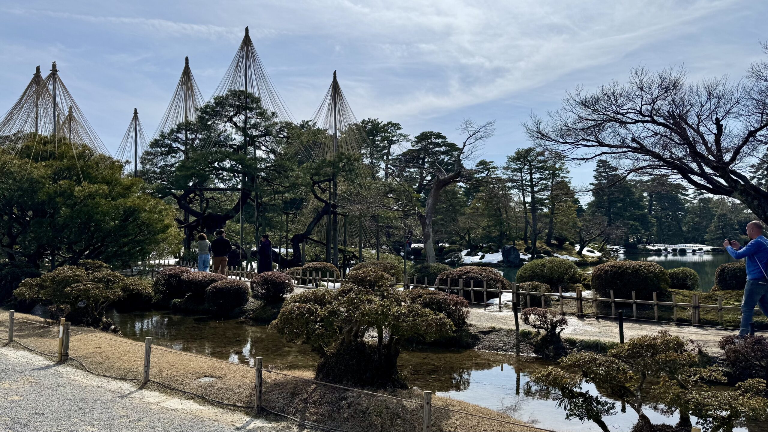 Von hier aus ging es weiter zu den berühmten Kenroku-en-Gärten, die als eine der schönsten Gartenanlagen Japans gelten. Für eine kleine Gebühr kann man sie besichtigen. Wenn alles blüht, ist es bestimmt noch atemberaubender, aber selbst jetzt im Winter sah es wunderschön aus.