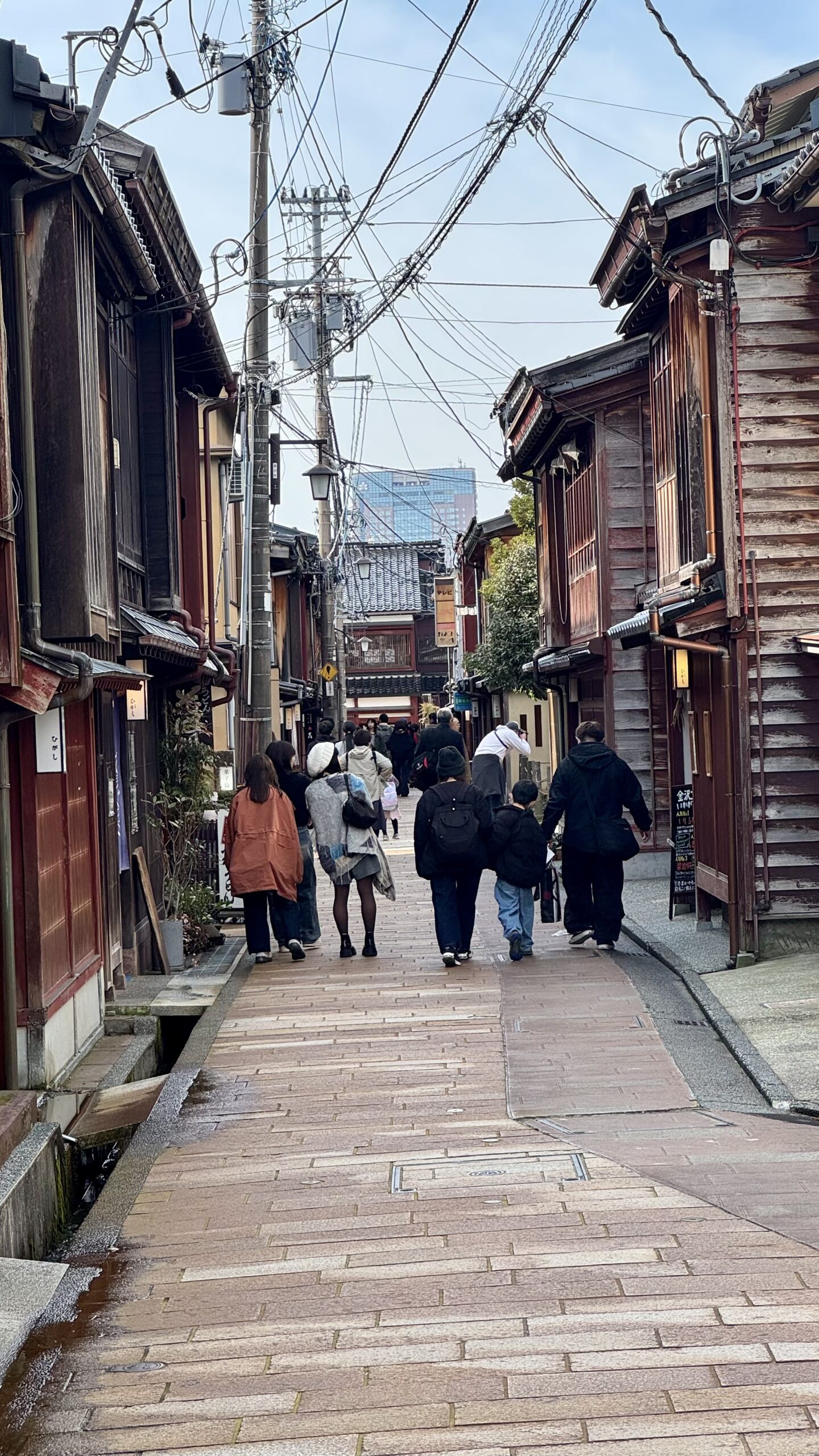 Schon auf dem Weg vom Bahnhof zum Hotel liefen wir durch die Straßen und waren erleichtert, wie wenige Touristen uns dabei begegneten. 😀 Unseren ersten Tag verbrachten wir jedoch ausschließlich im Hotel. Wir brauchten Ruhe, Schlaf und Erholung. Die letzten acht Tage hatten uns psychisch und physisch ausgelaugt, und wir wollten Kanazawa einen besseren Start bieten, als komplett übermüdet und demotiviert durch die Stadt zu laufen. Außerdem begann es am späten Nachmittag zu regnen – das kam uns ganz gelegen. Im Hotel funktionierte der Fernseher, und wir konnten YouTube und Netflix schauen. So verbrachten wir den restlichen Tag damit, eine Serie zu schauen.