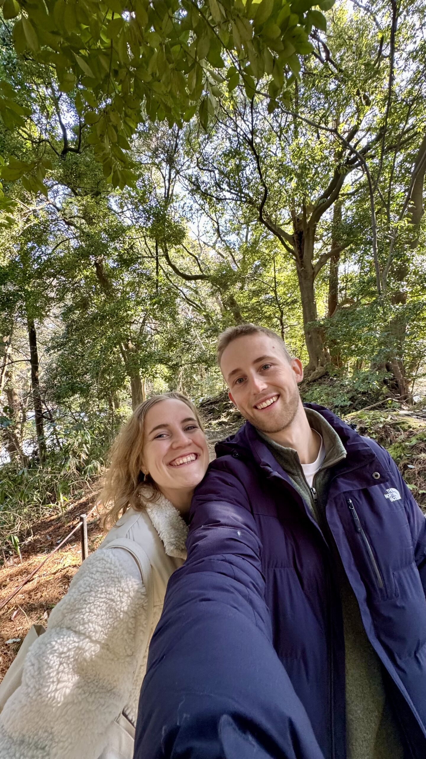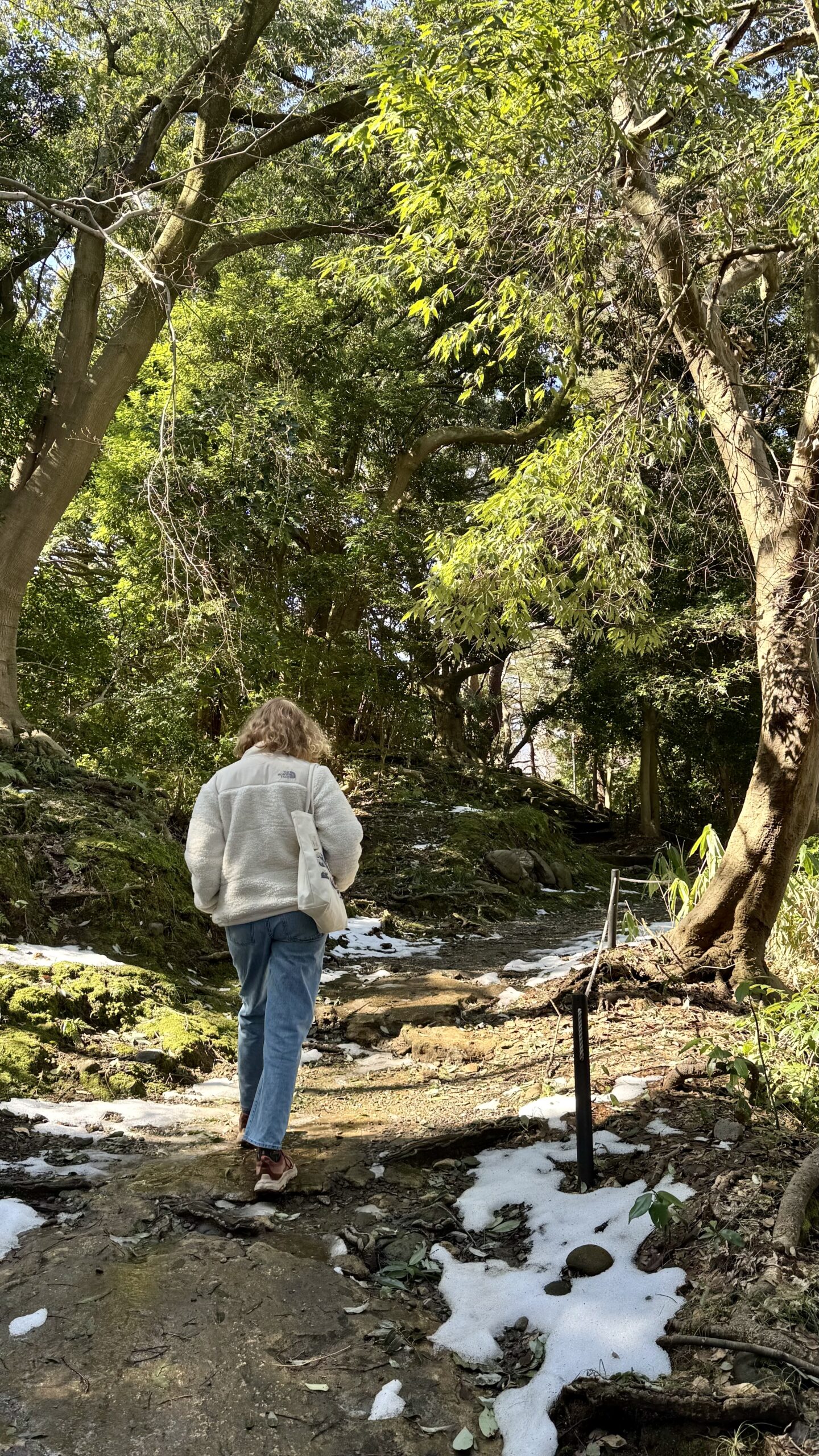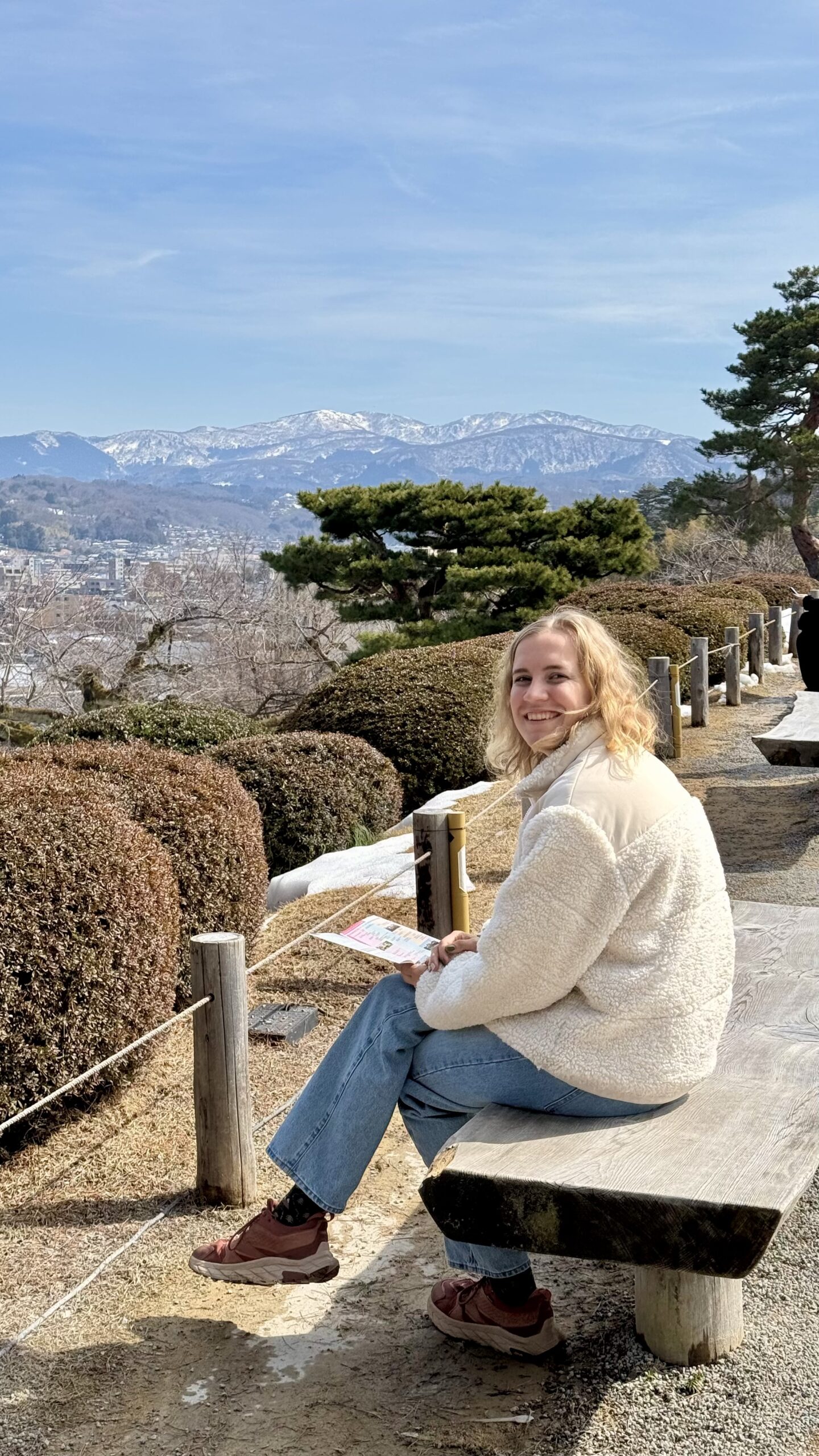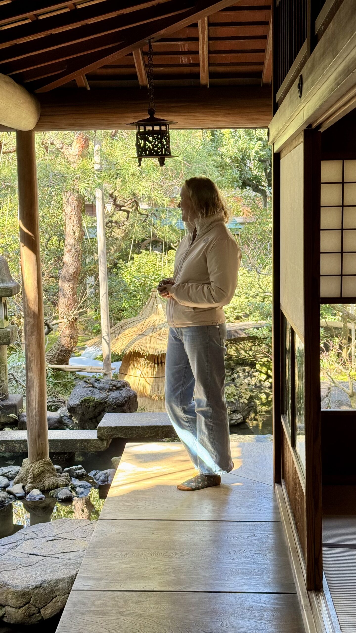Wir setzten uns auf eine Bank und genossen die Sonne, die uns wärmte. Unser Blick reichte bis zu den japanischen Alpen, und überall um uns herum standen Bäume mit hochgebundenen Zweigen.