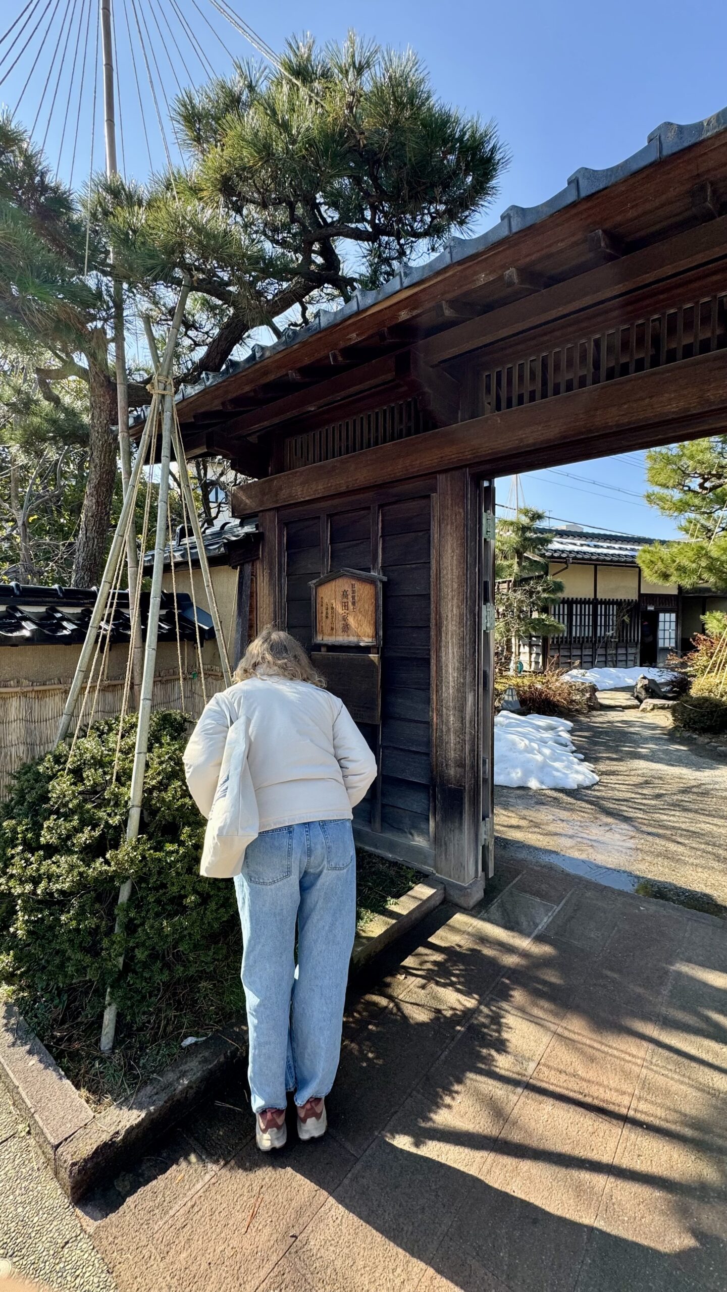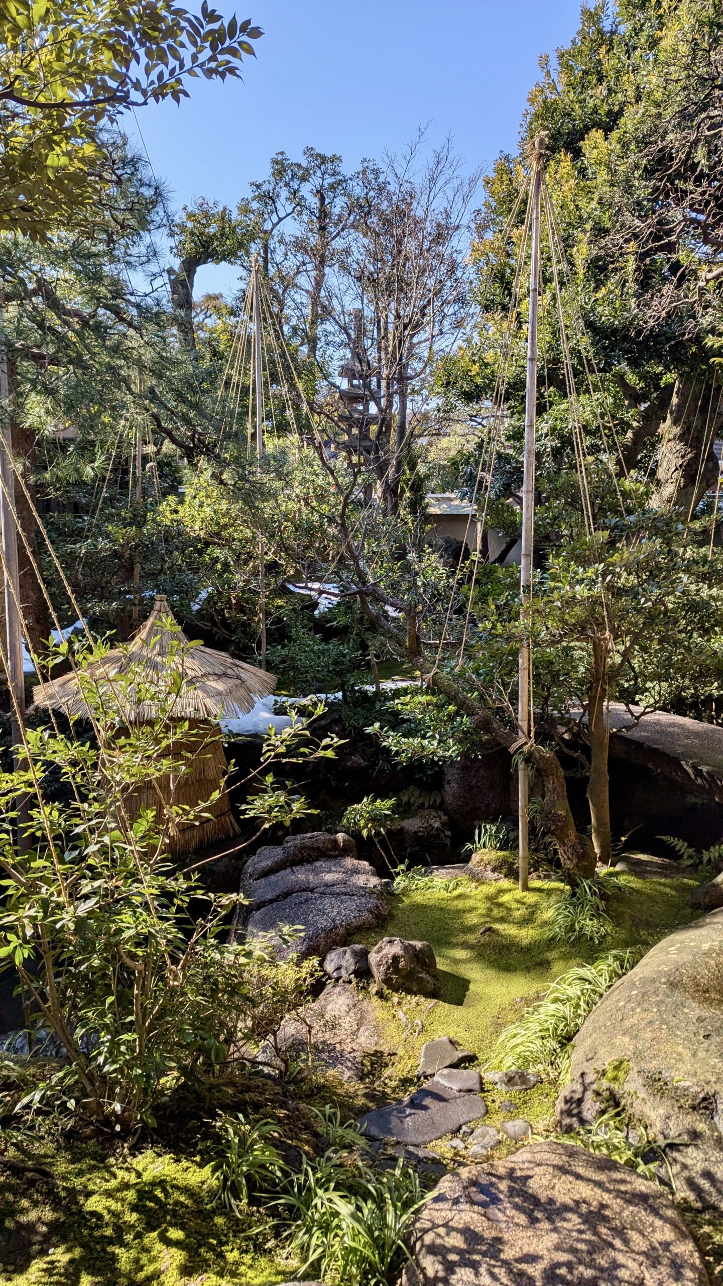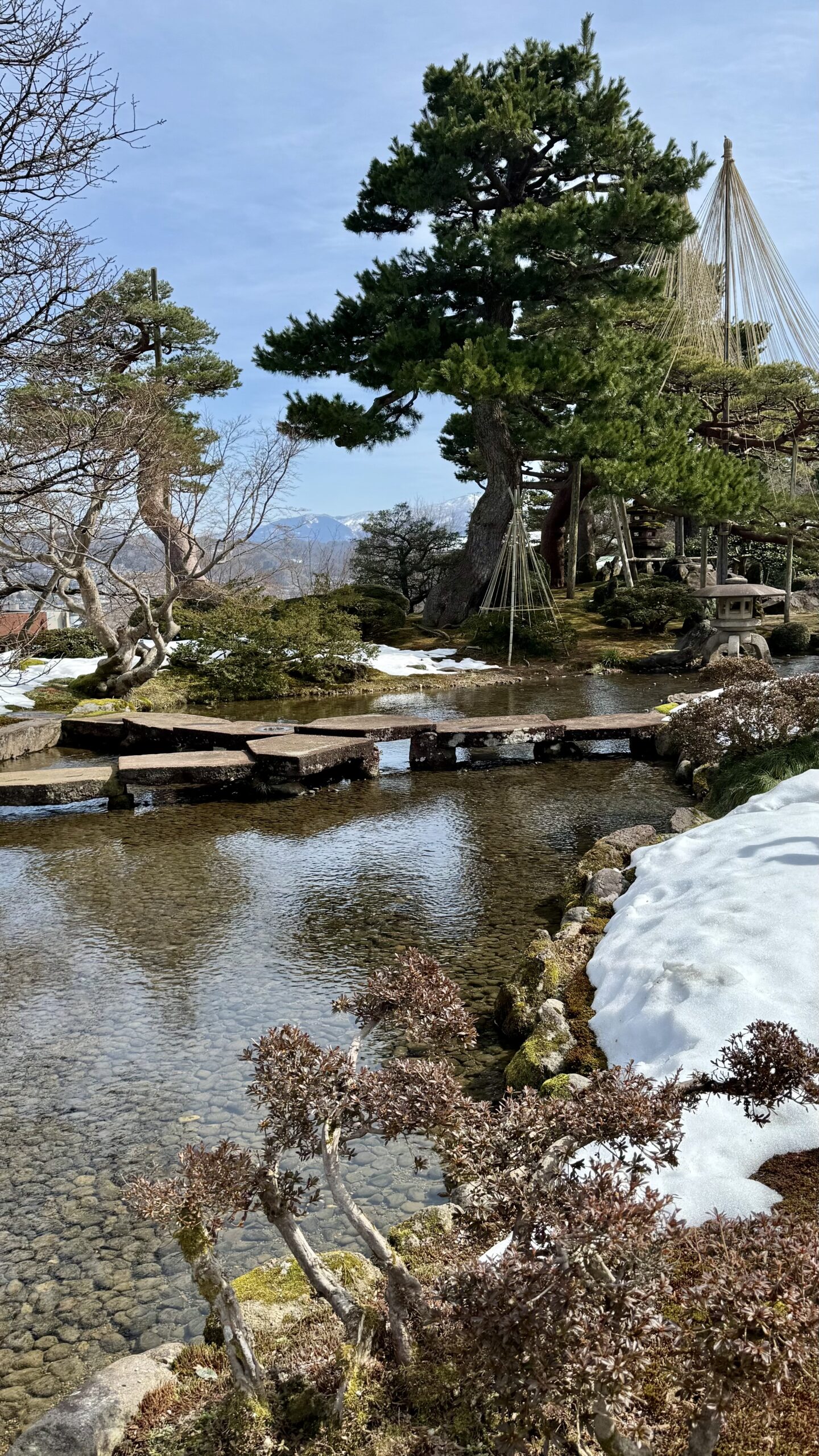 Dafür ist Kanazawa besonders bekannt – es gehört fast schon zum ikonischen Stadtbild. Während des Winters werden die Äste mit Seilen an der Spitze des Baumes festgebunden, damit sie unter der Last des Schnees nicht brechen. Auf jeder Postkarte oder jedem Souvenir sind diese Bäume abgebildet. Und obwohl es Winter war, leuchtete uns in den Gärten bereits ein sattes Grün entgegen.