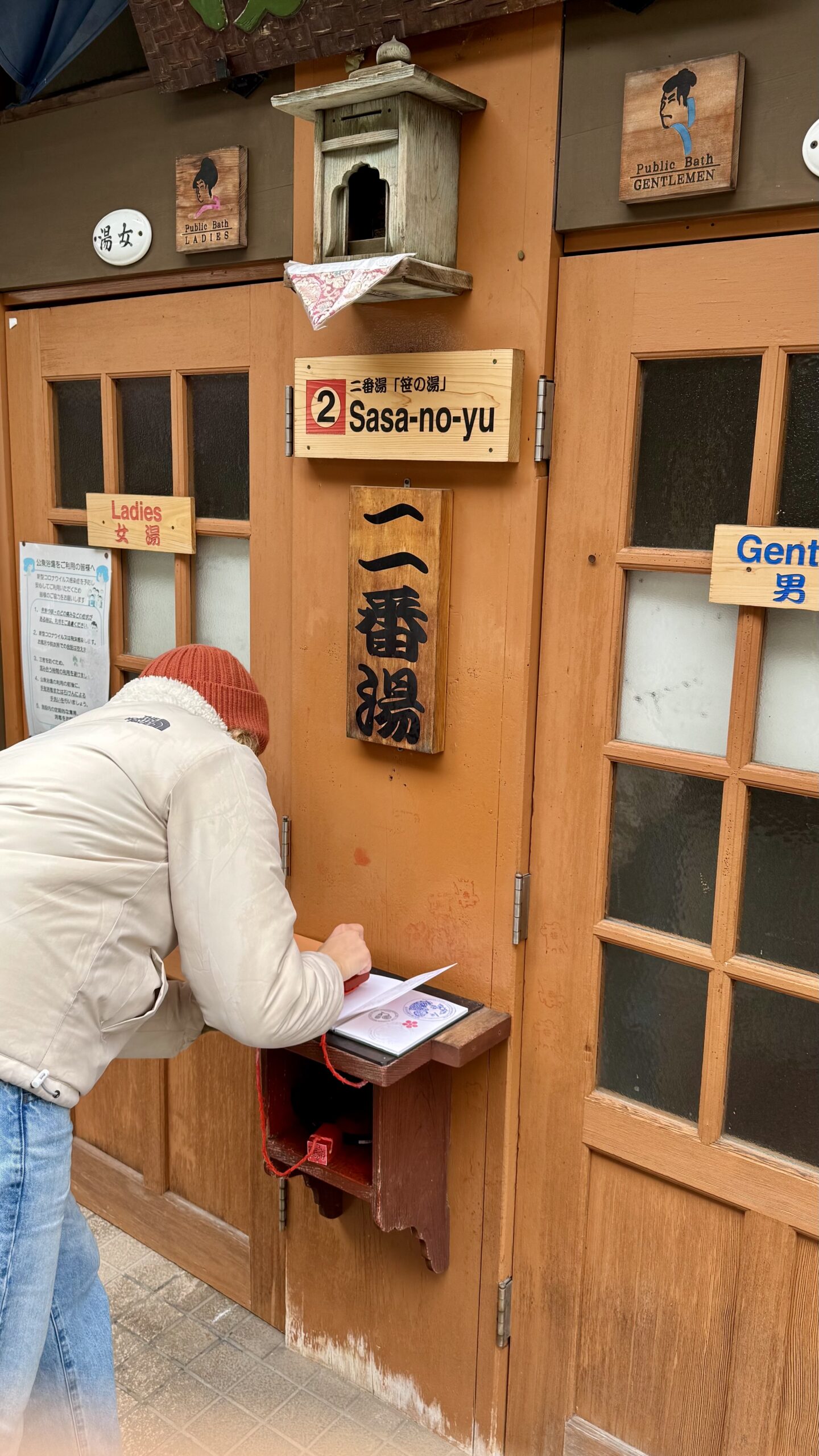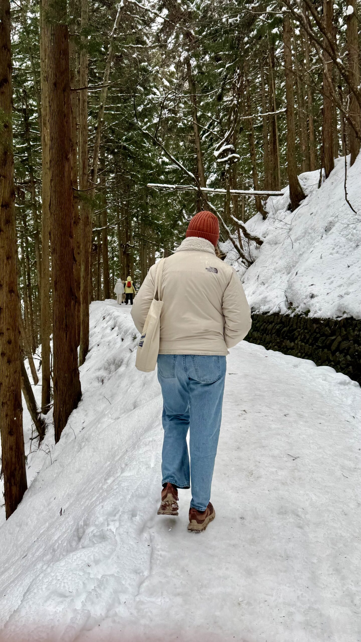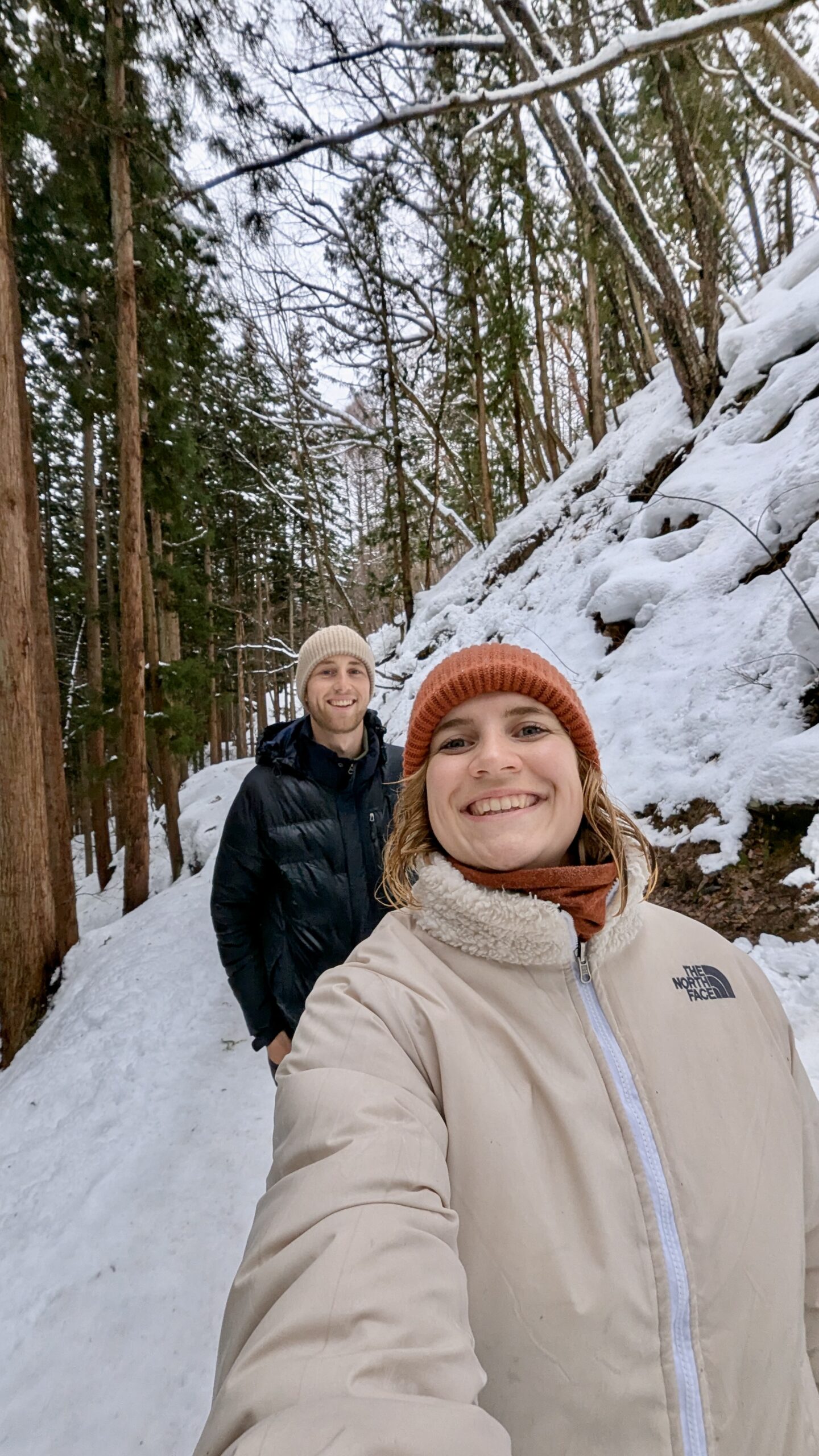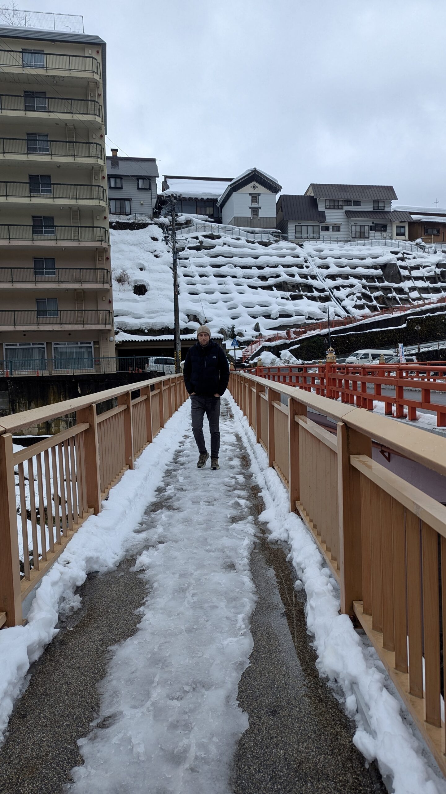 Es war wirklich sehr schön! Wir durchquerten zwei alte Dörfer, überall waren Onsens, in die man hätte gehen können, um sich aufzuwärmen. Aber wir wollten nur zum Zug. Und ja, der Zug hatte eine sehr pünktliche Abfahrtszeit, und vermutlich trödelten wir beim Durchqueren der Dörfer oder beim Stempel sammeln an den kleinen Tempeln ein bisschen zu sehr. Am Ende rannten wir, weil der Zug nur einmal pro Stunde fuhr.