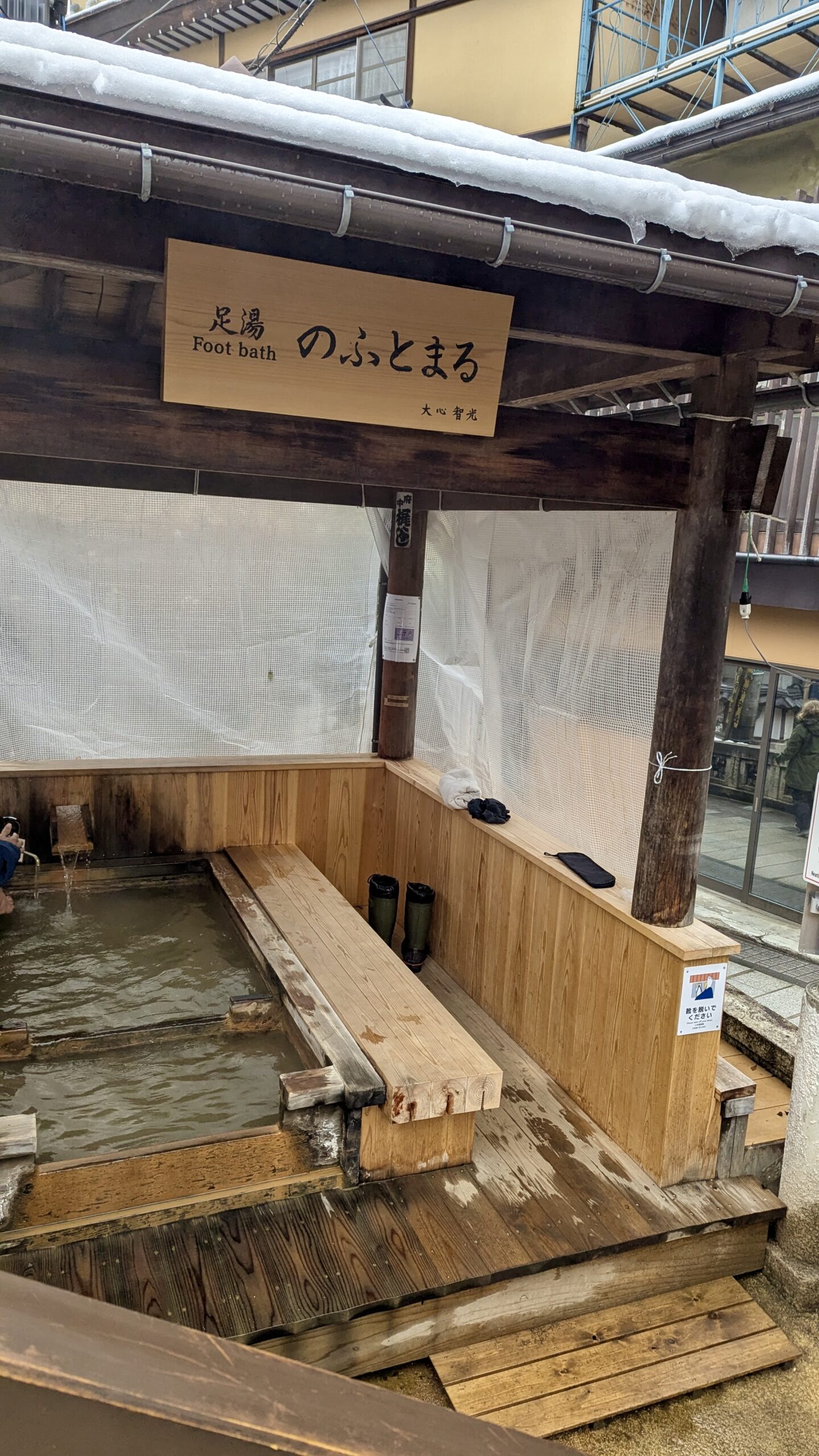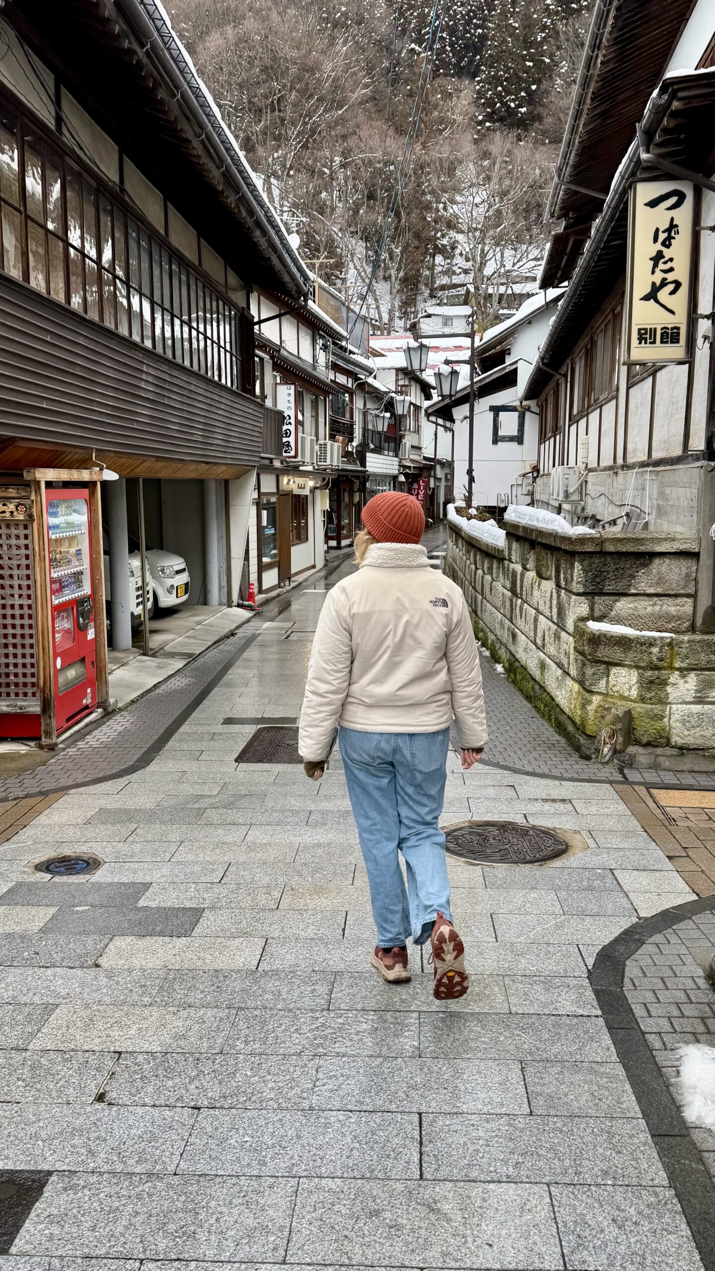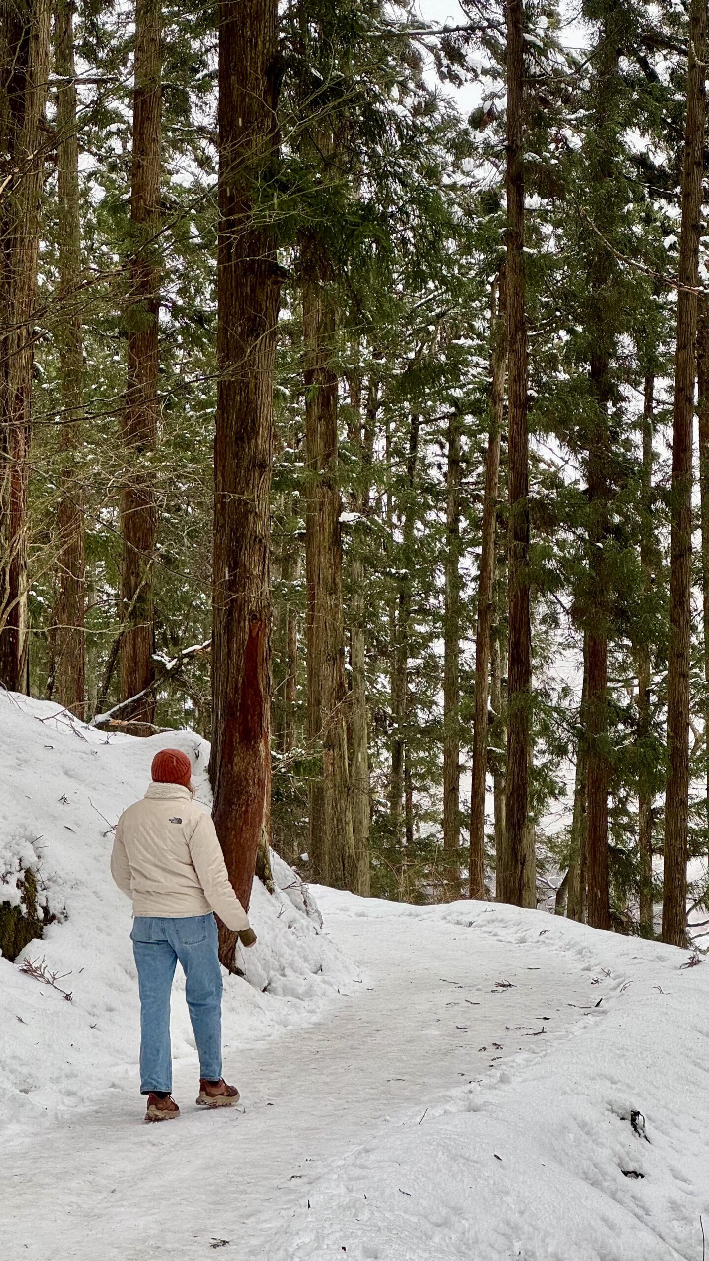 Es war wirklich sehr schön! Wir durchquerten zwei alte Dörfer, überall waren Onsens, in die man hätte gehen können, um sich aufzuwärmen. Aber wir wollten nur zum Zug. Und ja, der Zug hatte eine sehr pünktliche Abfahrtszeit, und vermutlich trödelten wir beim Durchqueren der Dörfer oder beim Stempel sammeln an den kleinen Tempeln ein bisschen zu sehr. Am Ende rannten wir, weil der Zug nur einmal pro Stunde fuhr.