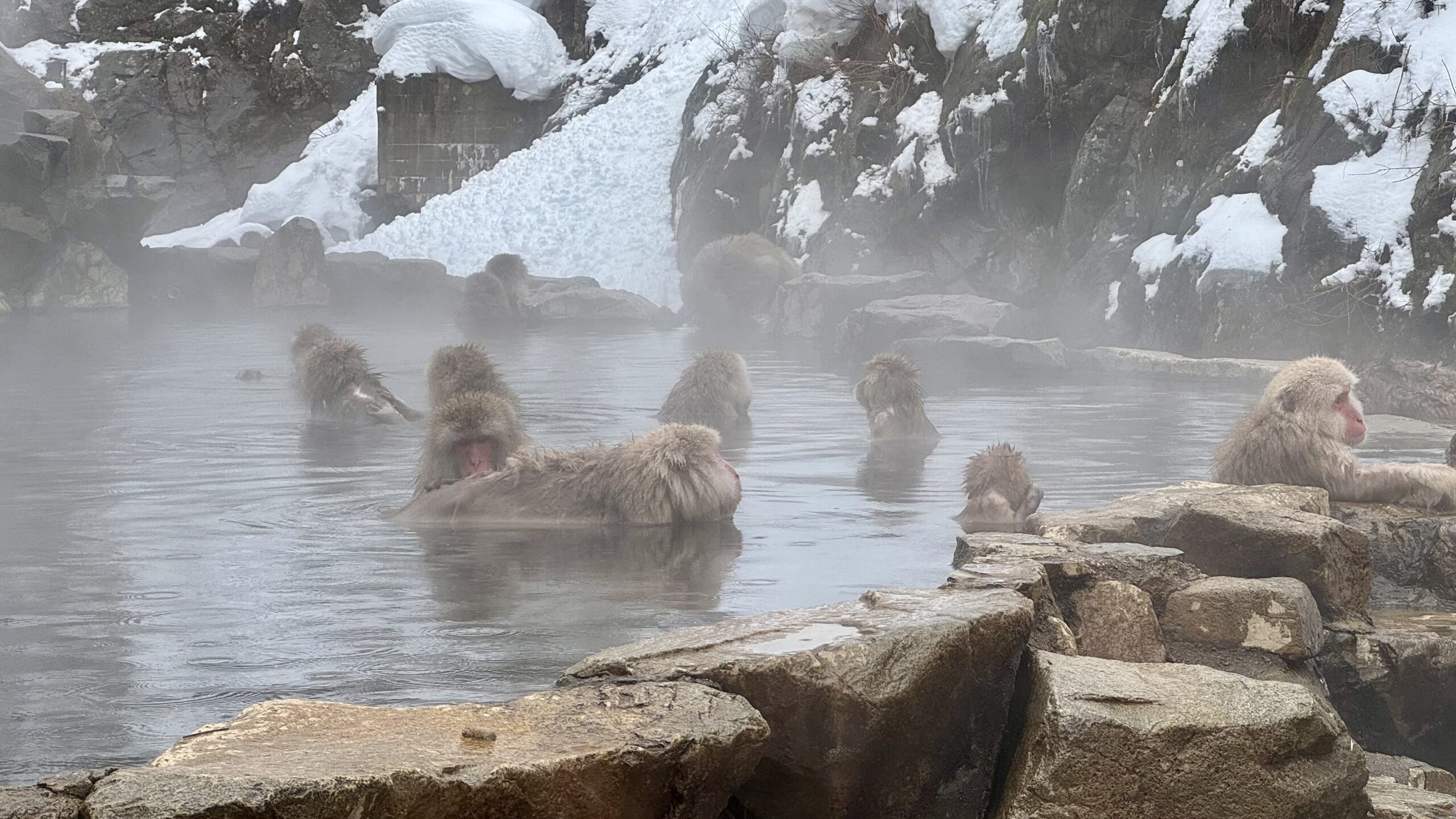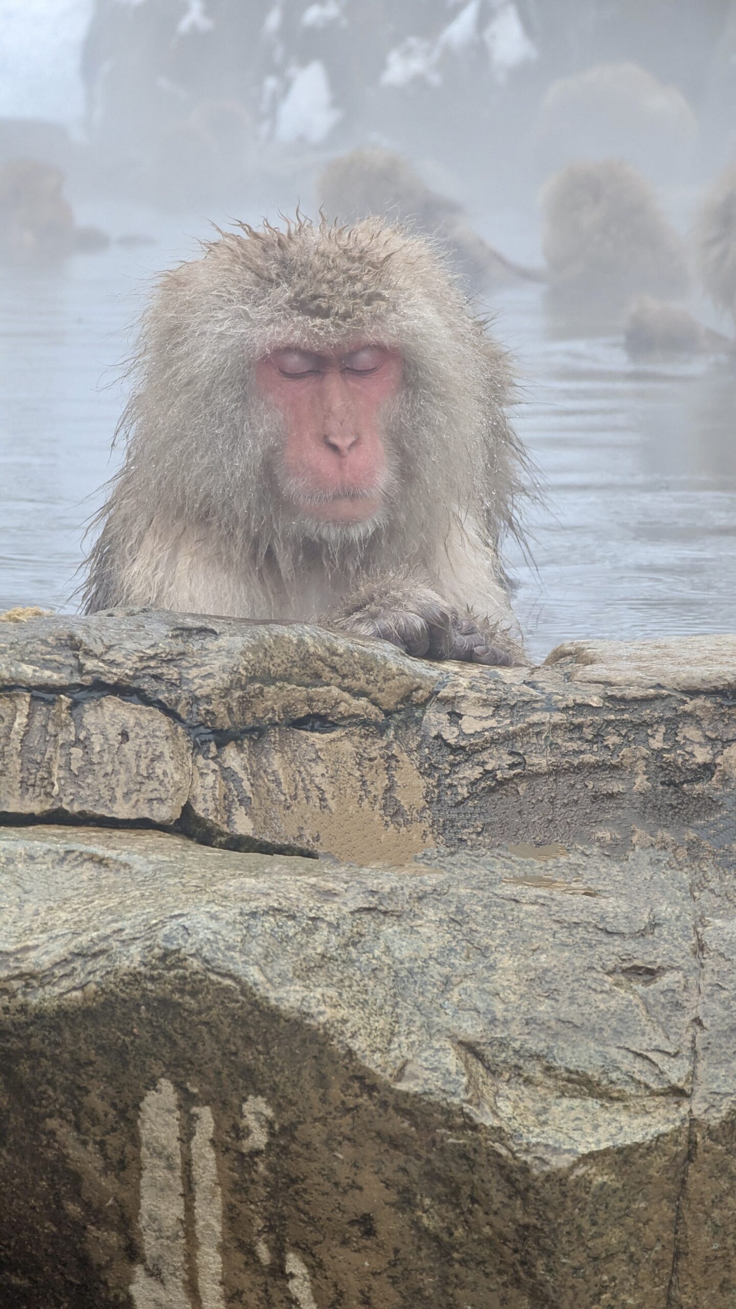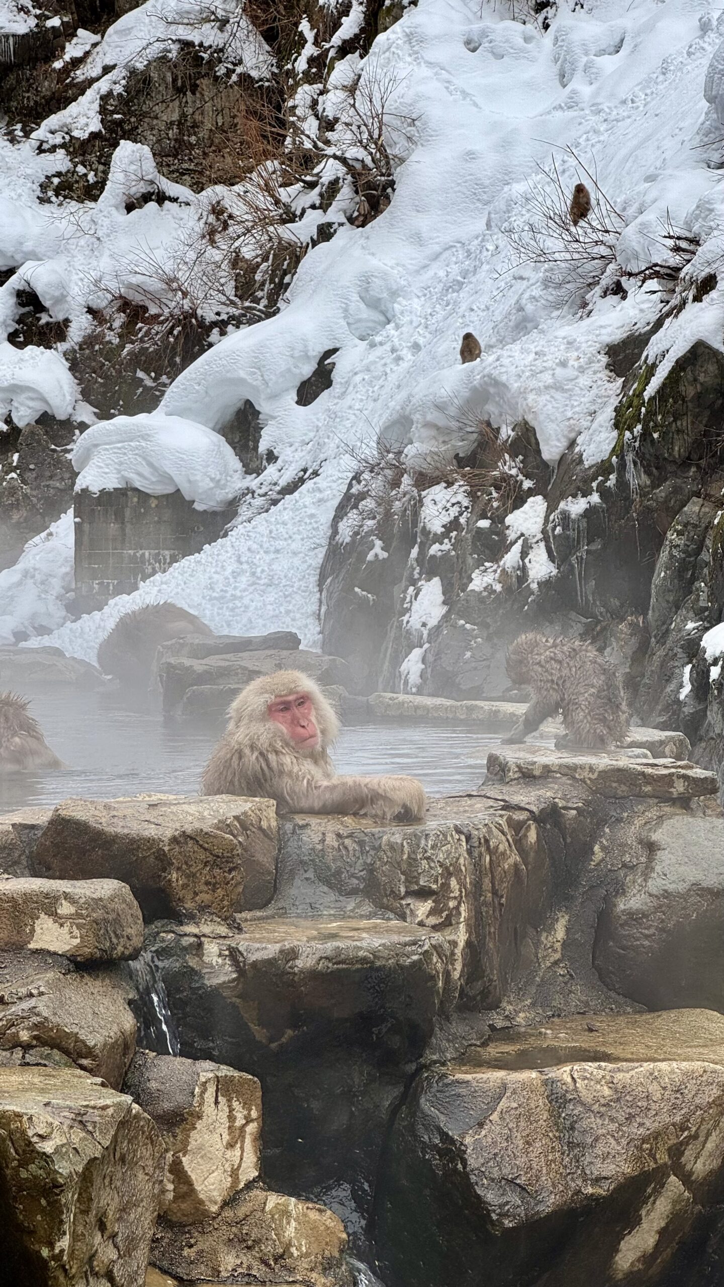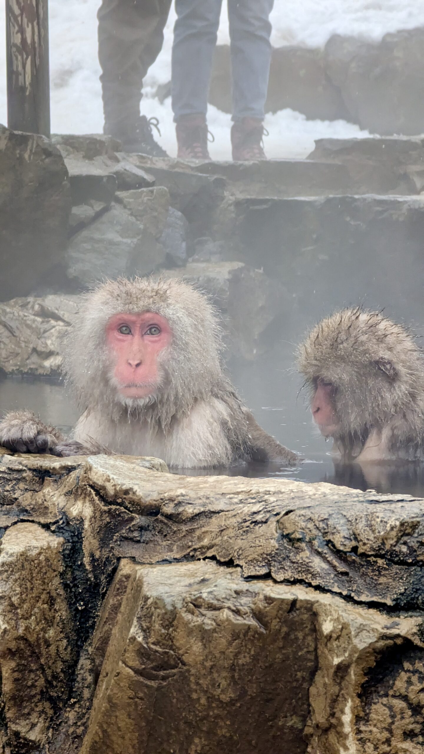 Bei den Affen angekommen, standen wir im Regen und beobachteten, wie sie vollkommen entspannt in den 35°C heißen Quellen saßen. Sie ignorierten die Menschen um sich herum und ließen es sich einfach gut gehen.