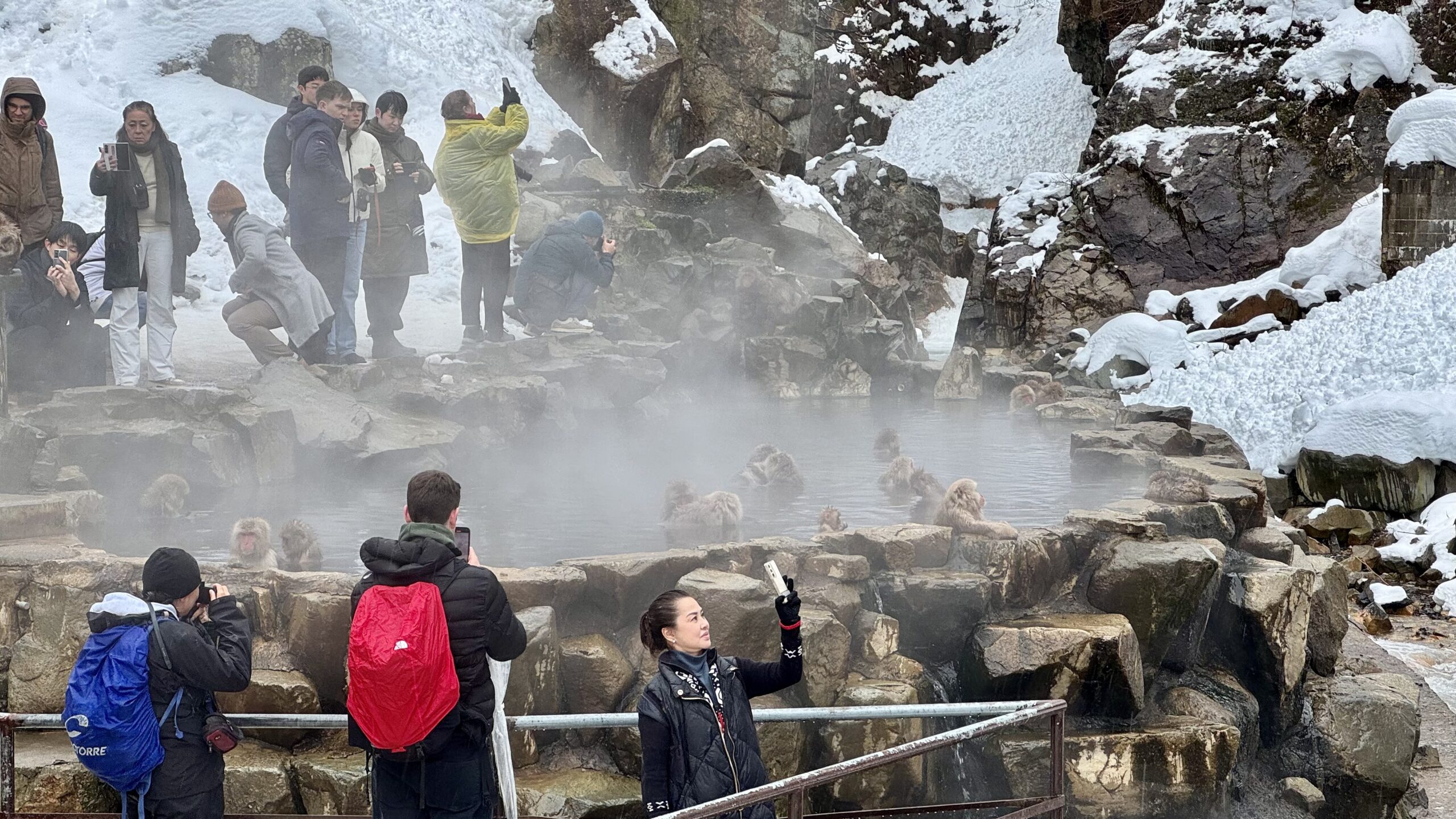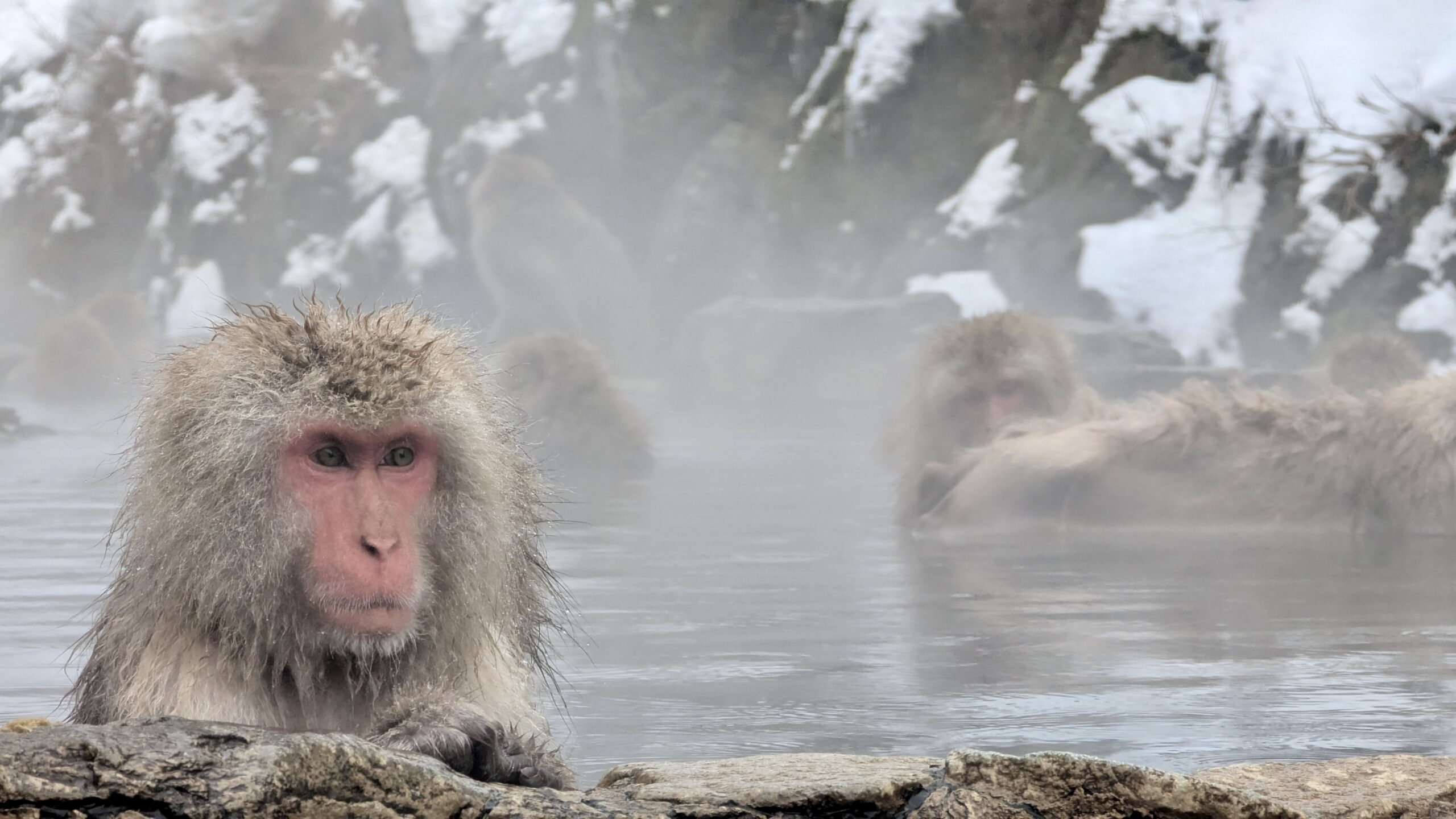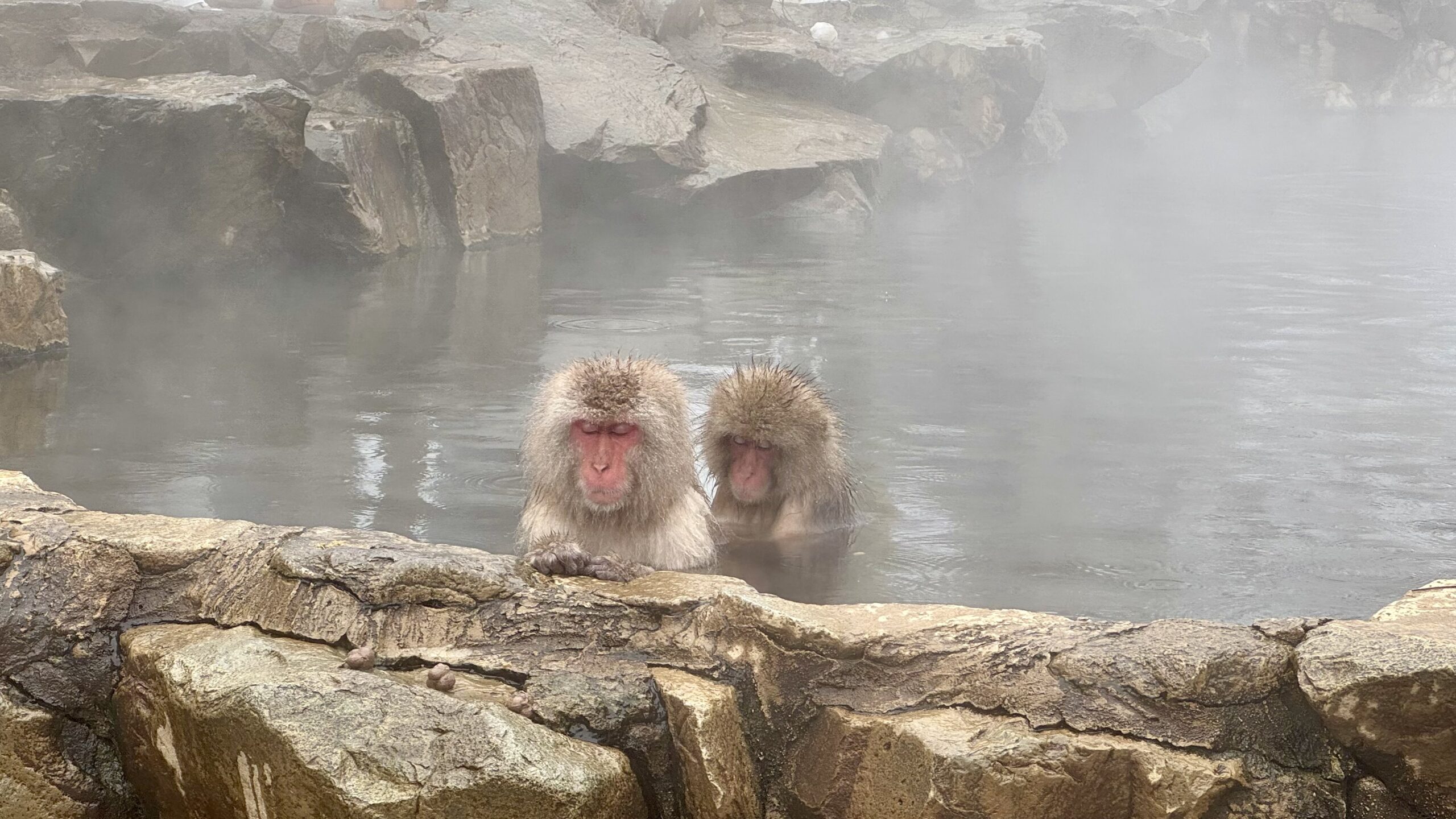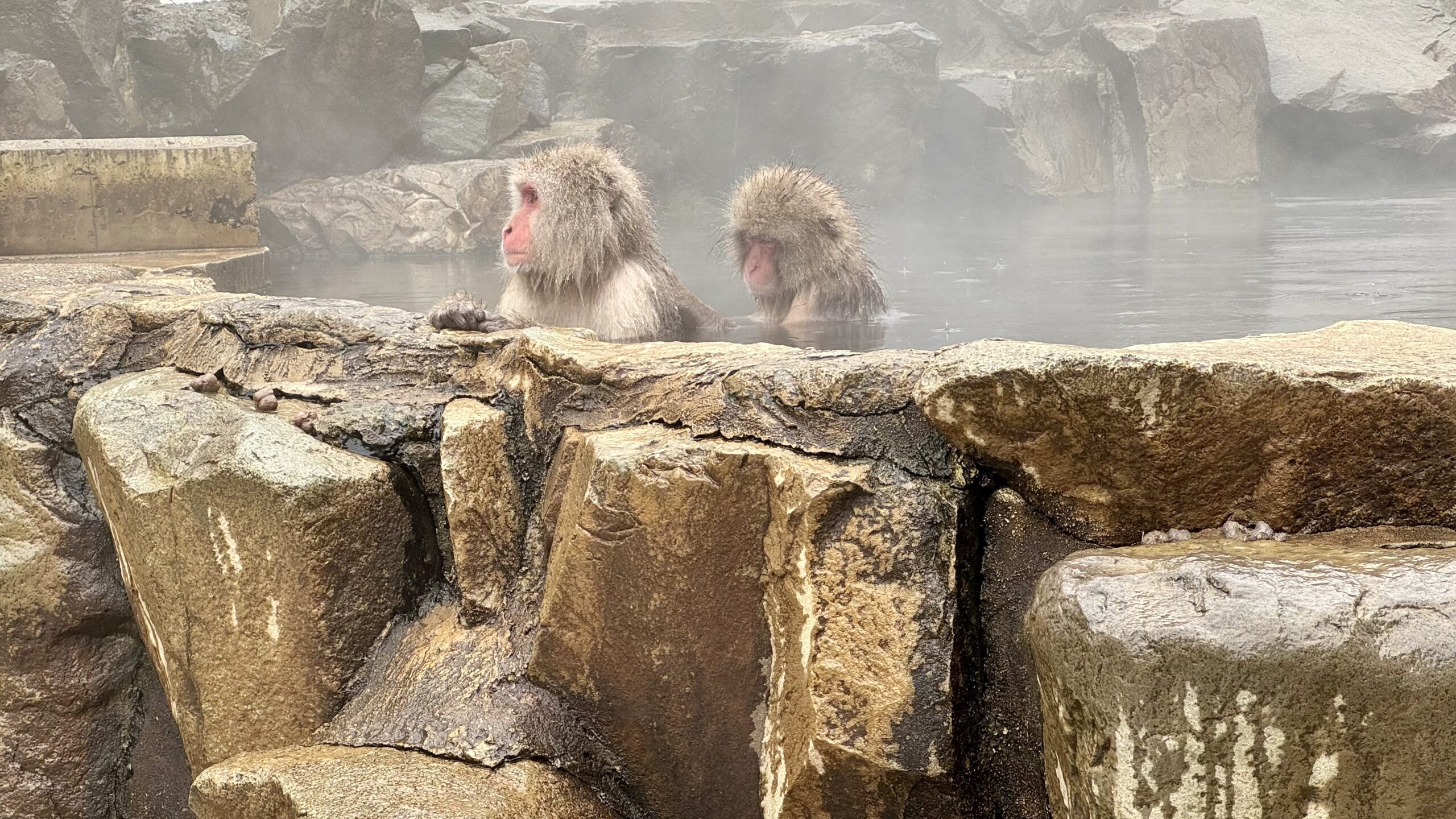 Bei den Affen angekommen, standen wir im Regen und beobachteten, wie sie vollkommen entspannt in den 35°C heißen Quellen saßen. Sie ignorierten die Menschen um sich herum und ließen es sich einfach gut gehen.