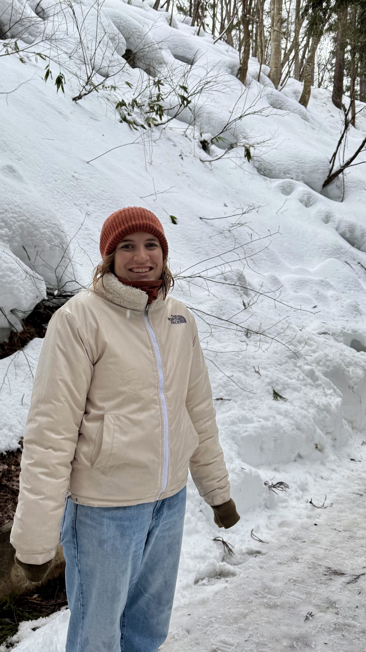 Als wir endlich ankamen, sprangen wir förmlich aus dem Bus und marschierten schnellen Schrittes zum Eingang des Affenparks, der etwa 2,8 km vom Busstopp entfernt lag. Und dann fing es an zu regnen. Nicht stark, aber stark genug, dass unsere Jacken nach 15 Minuten komplett durchnässt waren. Meine Haare klebten nass an meinem Gesicht, und mehr als einmal erwischte uns ein großer Schneeklumpen, der durch die Feuchtigkeit von den Ästen über uns rutschte.