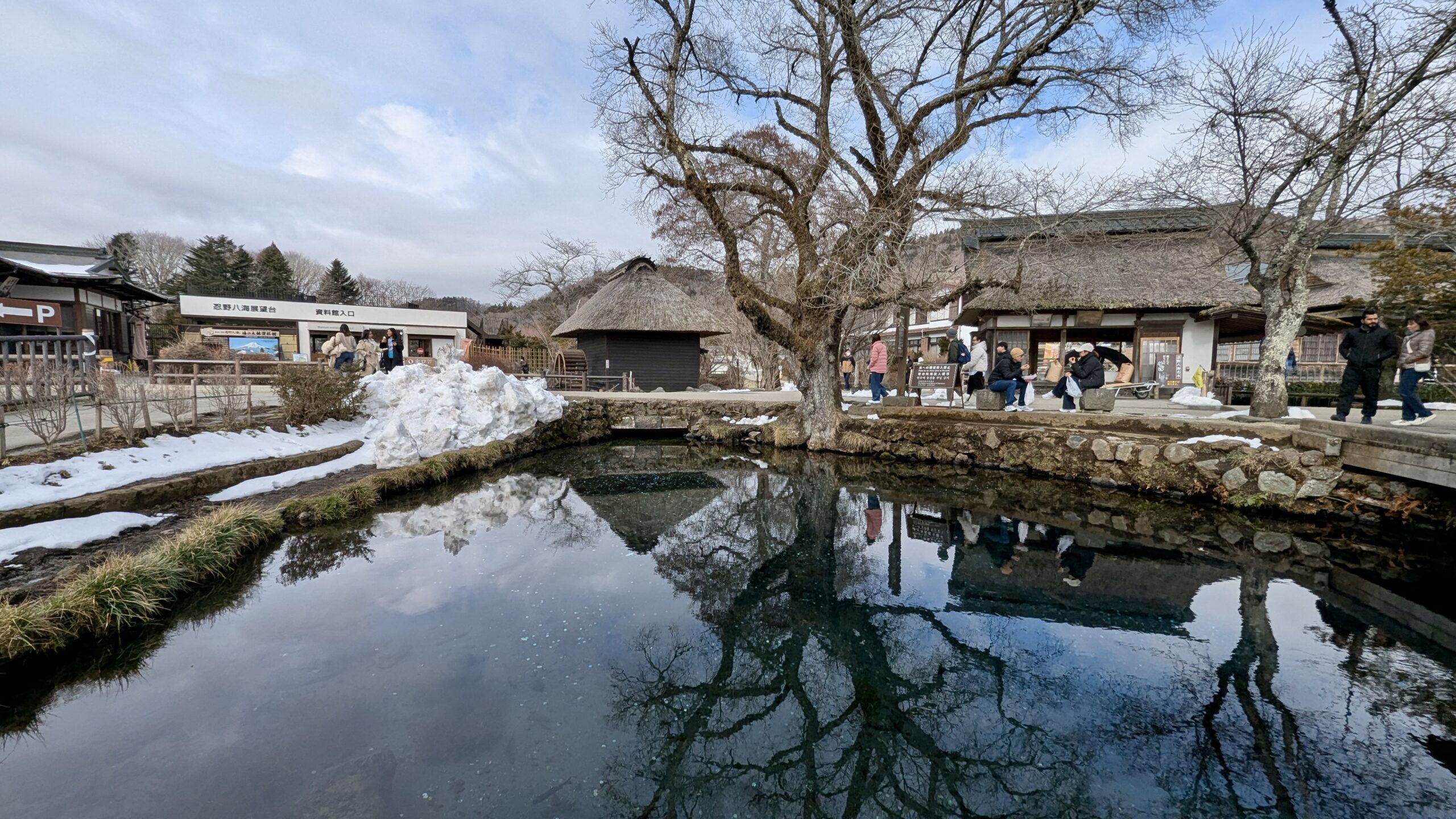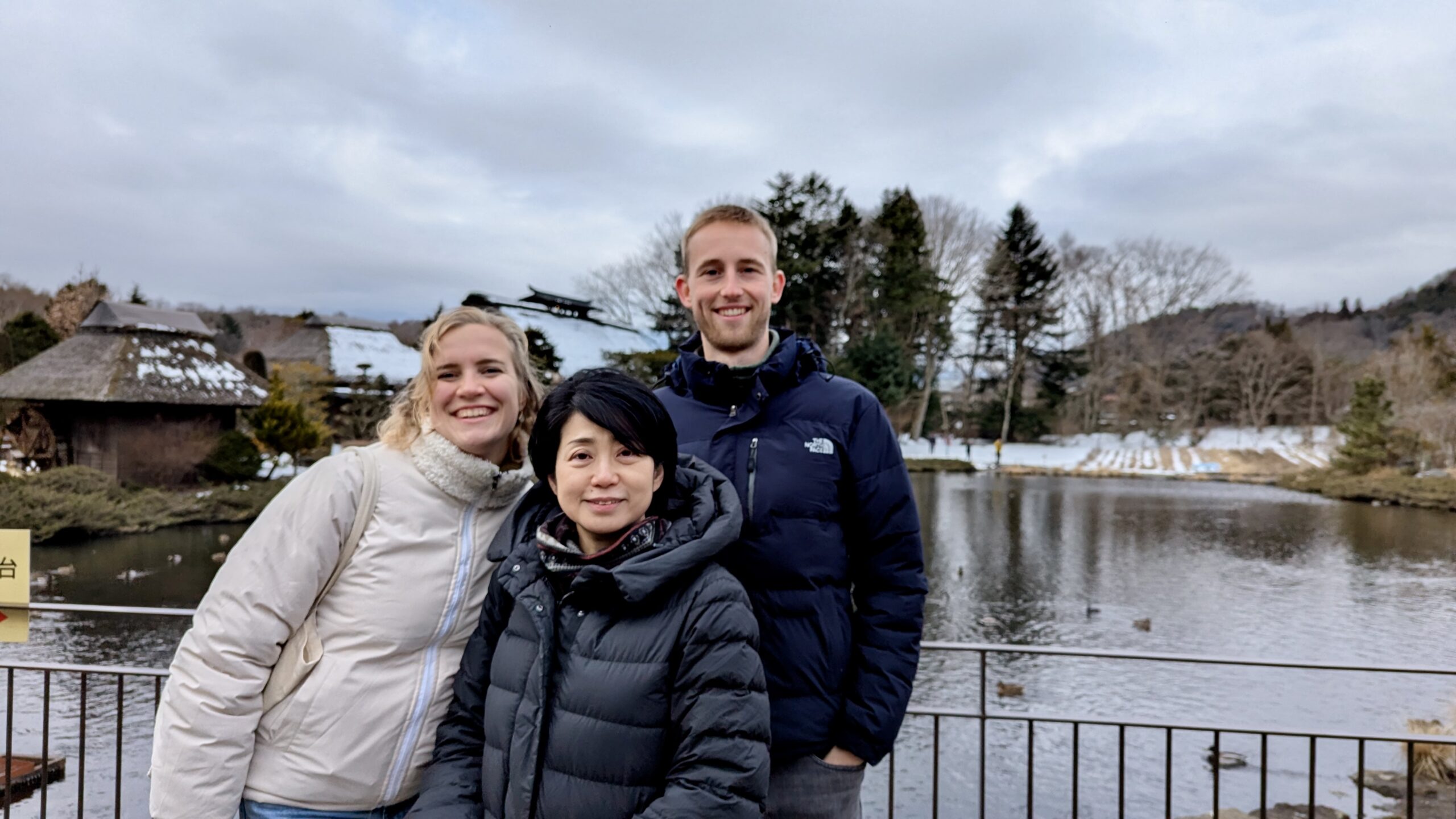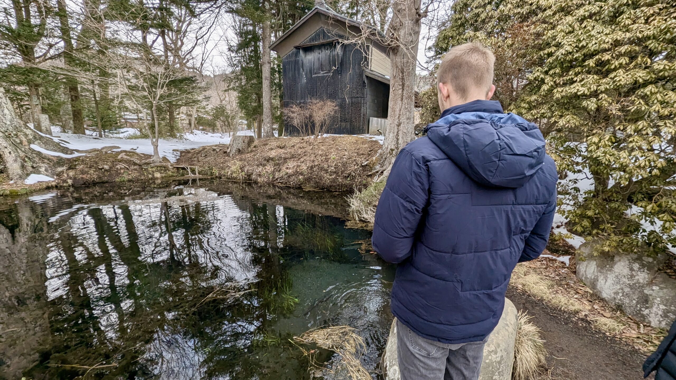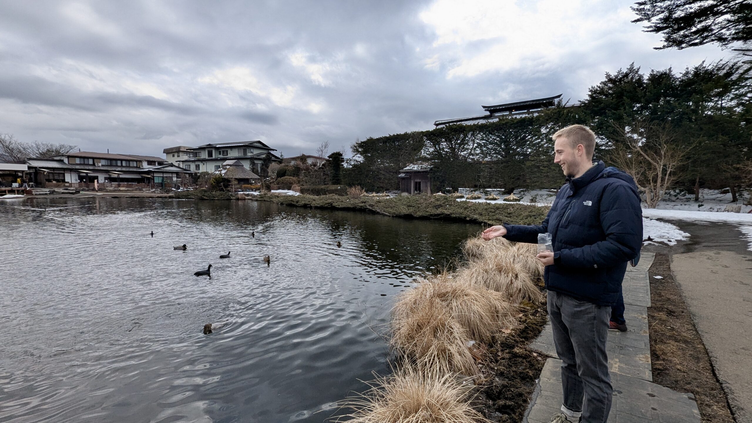 Mit ihrem Mann zusammen fuhren wir nach Oshino Hakkai, der Ort, der für seine 8 Seen bekannt ist, in denen sich der Fuji bei gutem Wetter wunderschön spiegeln kann. Aber das Wetter wollte nicht mitmachen, es war immer noch grau, obwohl wir 2 Stunden im Auto gesessen hatten. Aber Yuri gab die Hoffnung nicht auf und zeigte uns die verschiedenen kleinen Seen. Das war vor langer Zeit mal ein großer See gewesen, aber durch die Ausbrüche des Fuji waren Steinbrocken heruntergekommen, die die Landschaft verändert haben und so 8 kleine Seen und Tümpel erschaffen haben, um die sich mittlerweile ein ganzes Dorf erhoben hat.