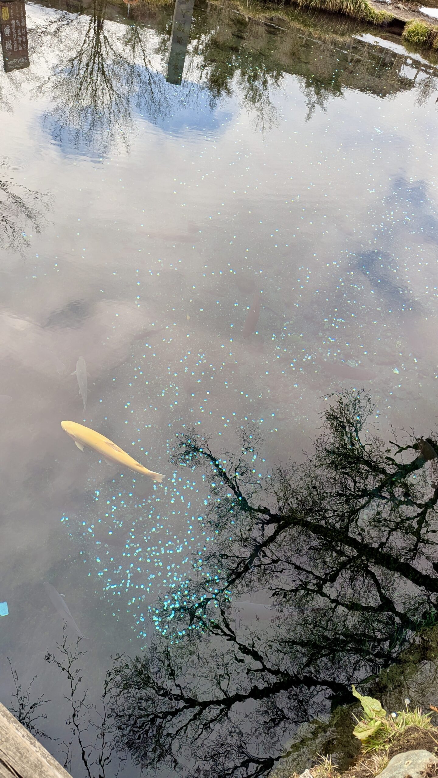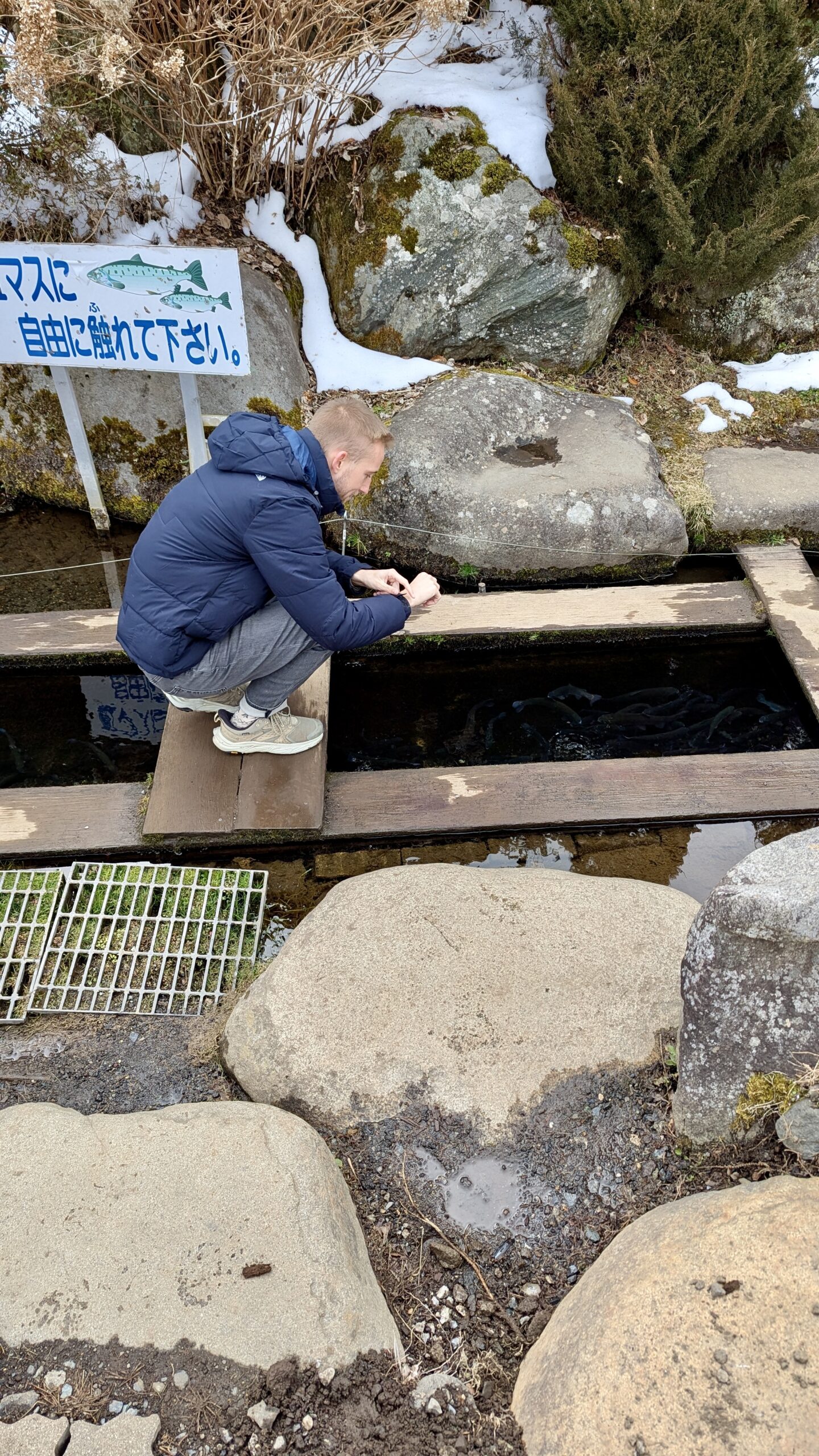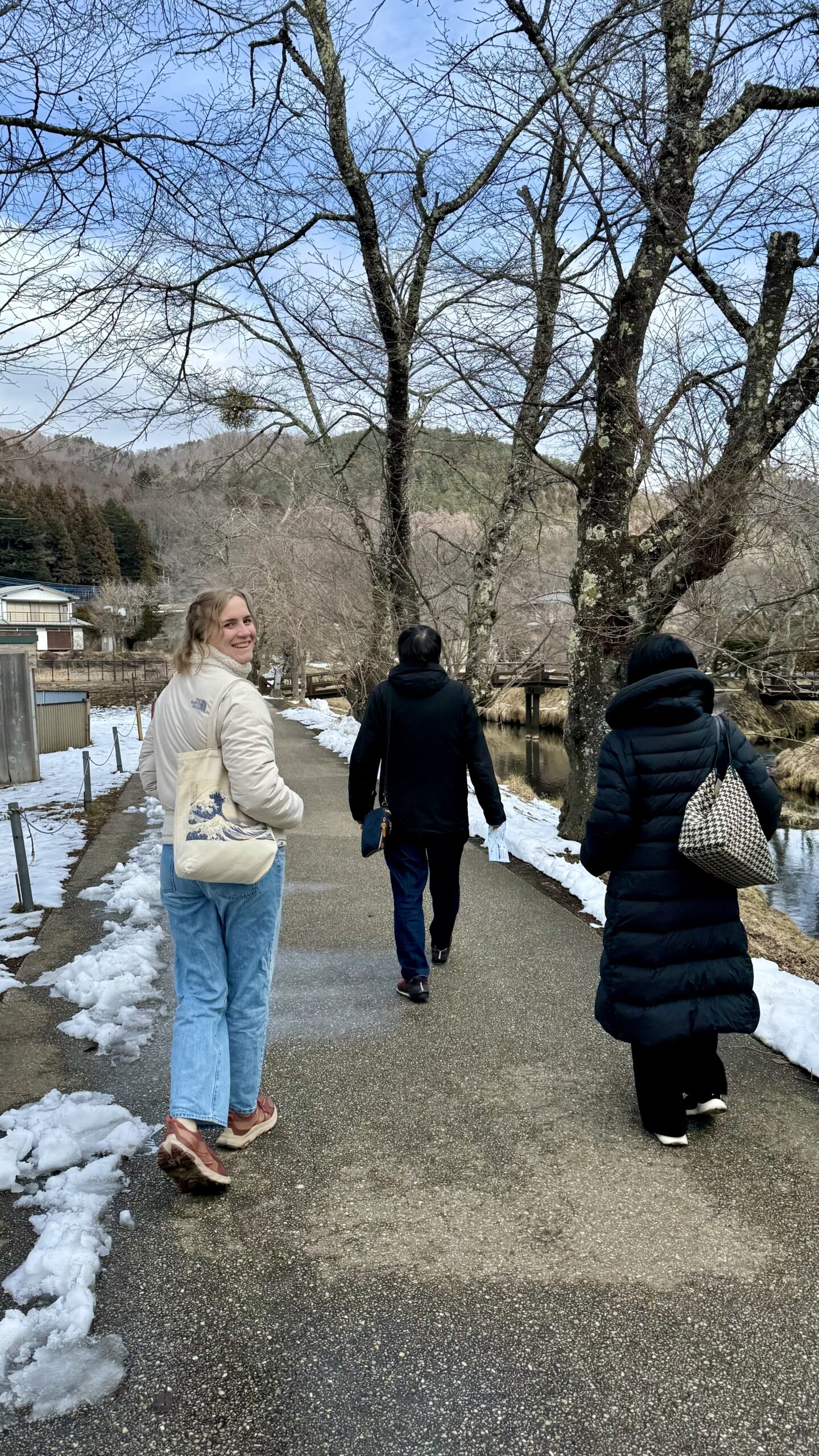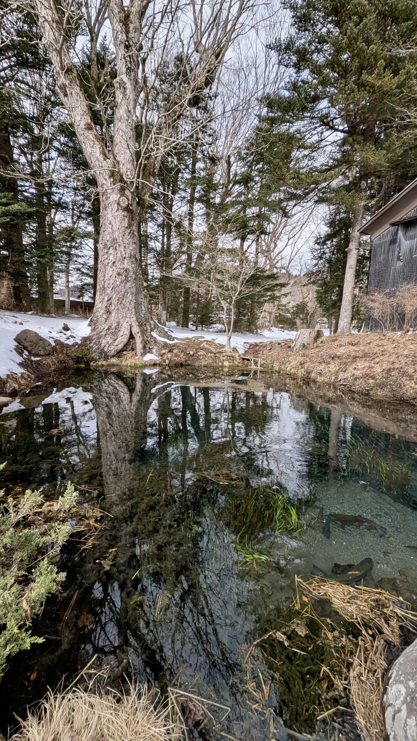Mit ihrem Mann zusammen fuhren wir nach Oshino Hakkai, der Ort, der für seine 8 Seen bekannt ist, in denen sich der Fuji bei gutem Wetter wunderschön spiegeln kann. Aber das Wetter wollte nicht mitmachen, es war immer noch grau, obwohl wir 2 Stunden im Auto gesessen hatten. Aber Yuri gab die Hoffnung nicht auf und zeigte uns die verschiedenen kleinen Seen. Das war vor langer Zeit mal ein großer See gewesen, aber durch die Ausbrüche des Fuji waren Steinbrocken heruntergekommen, die die Landschaft verändert haben und so 8 kleine Seen und Tümpel erschaffen haben, um die sich mittlerweile ein ganzes Dorf erhoben hat.