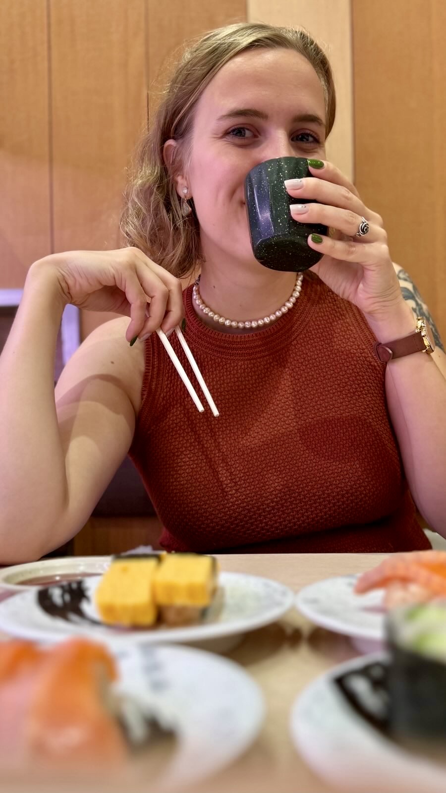 Am nächsten Tag waren Sascha und ich eigentlich mit Yuri verabredet, nachdem sie beim Sushi-Essen festgestellt hatte, wie schlecht unsere Stäbchen-Skills sind. Sie hatte eine Freundin gefragt, ob sie uns Unterricht geben könnte. Aber Sascha ging es nicht wirklich besser, also stellte ich nur neue Bananen und Fruchtsaft bereit, bevor ich mich mit Yuri in der Lobby traf und wir uns mit ihrer Freundin Asano und deren Tochter Mihako im Frühstücksraum trafen. Asano war früher Flugbegleiterin, wie Yuri, aber mittlerweile ist sie Lehrerin für richtiges Stäbchenessen.