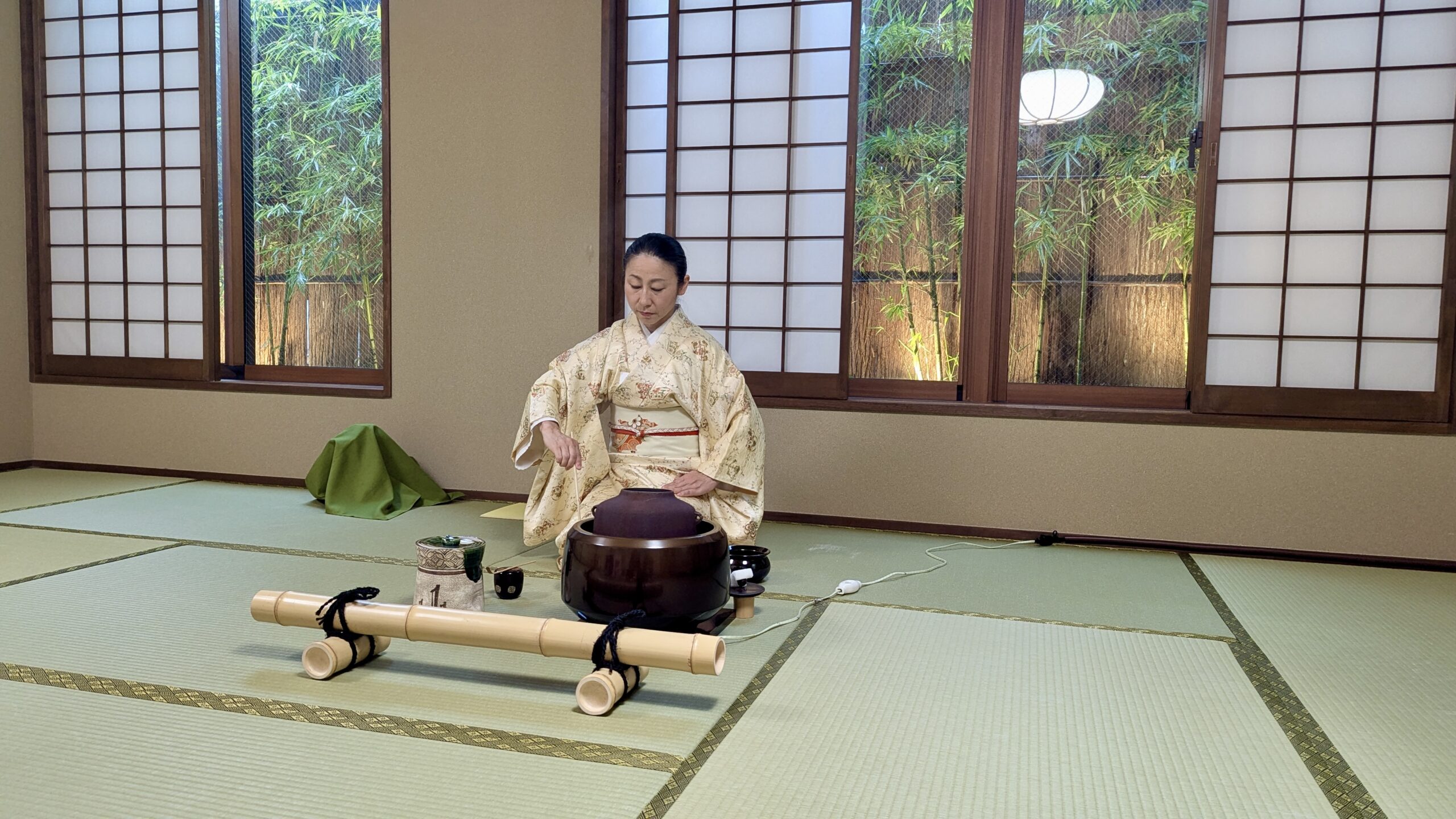 Besonders interessant ist die Gestaltung des Teeraums mit Tatami-Matten. In der Edo-Zeit wurden diese bewusst so angeordnet, dass die Fugen nicht in geraden Linien verliefen – eine Vorsichtsmaßnahme gegen potenzielle Angreifer, wie zum Beispiel Ninjas, die sich darunter verstecken könnten. Auch die niedrige Eingangstür eines Teehauses zwingt Gäste dazu, sich zu verbeugen, was als Zeichen der Demut gilt.