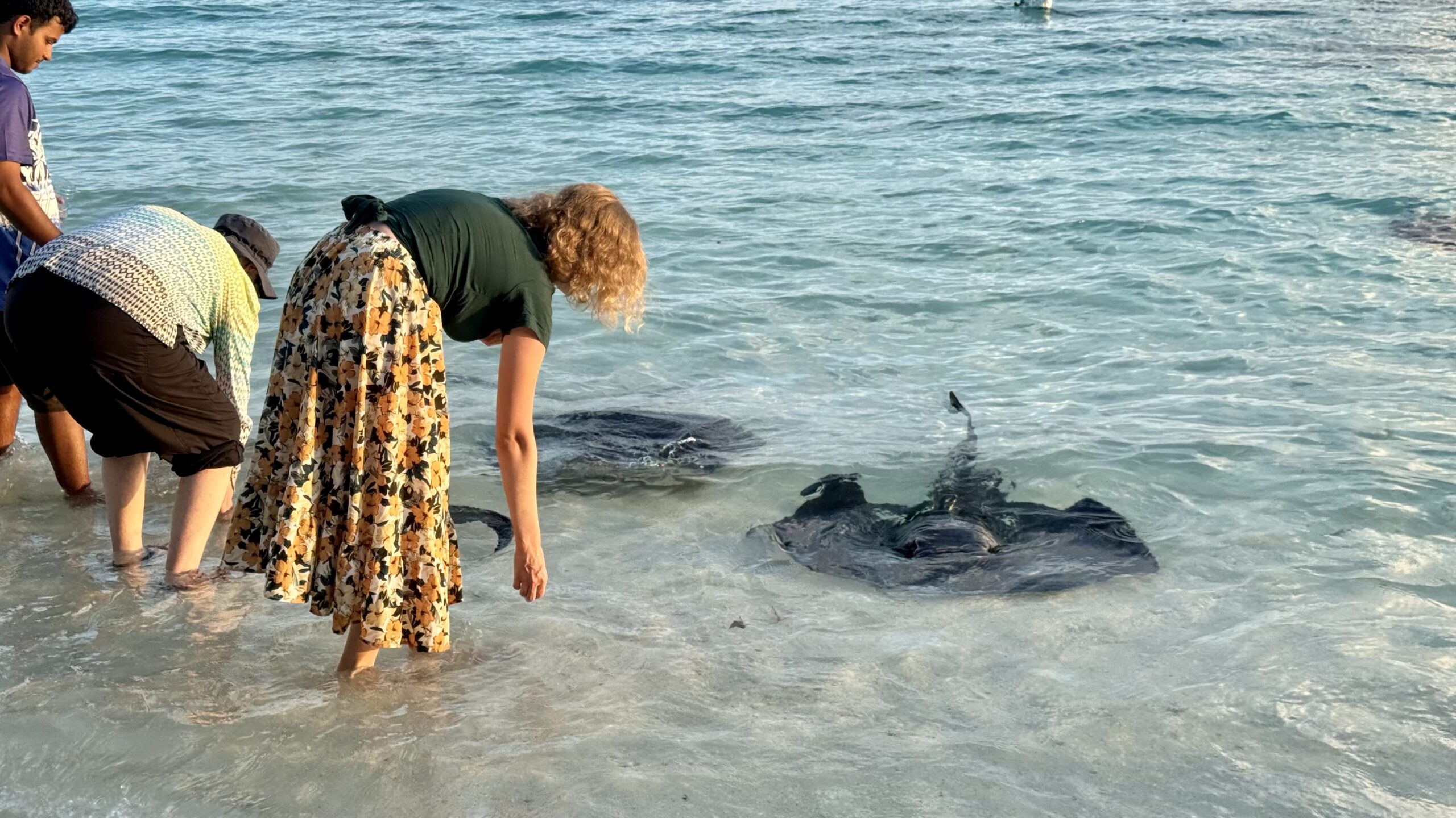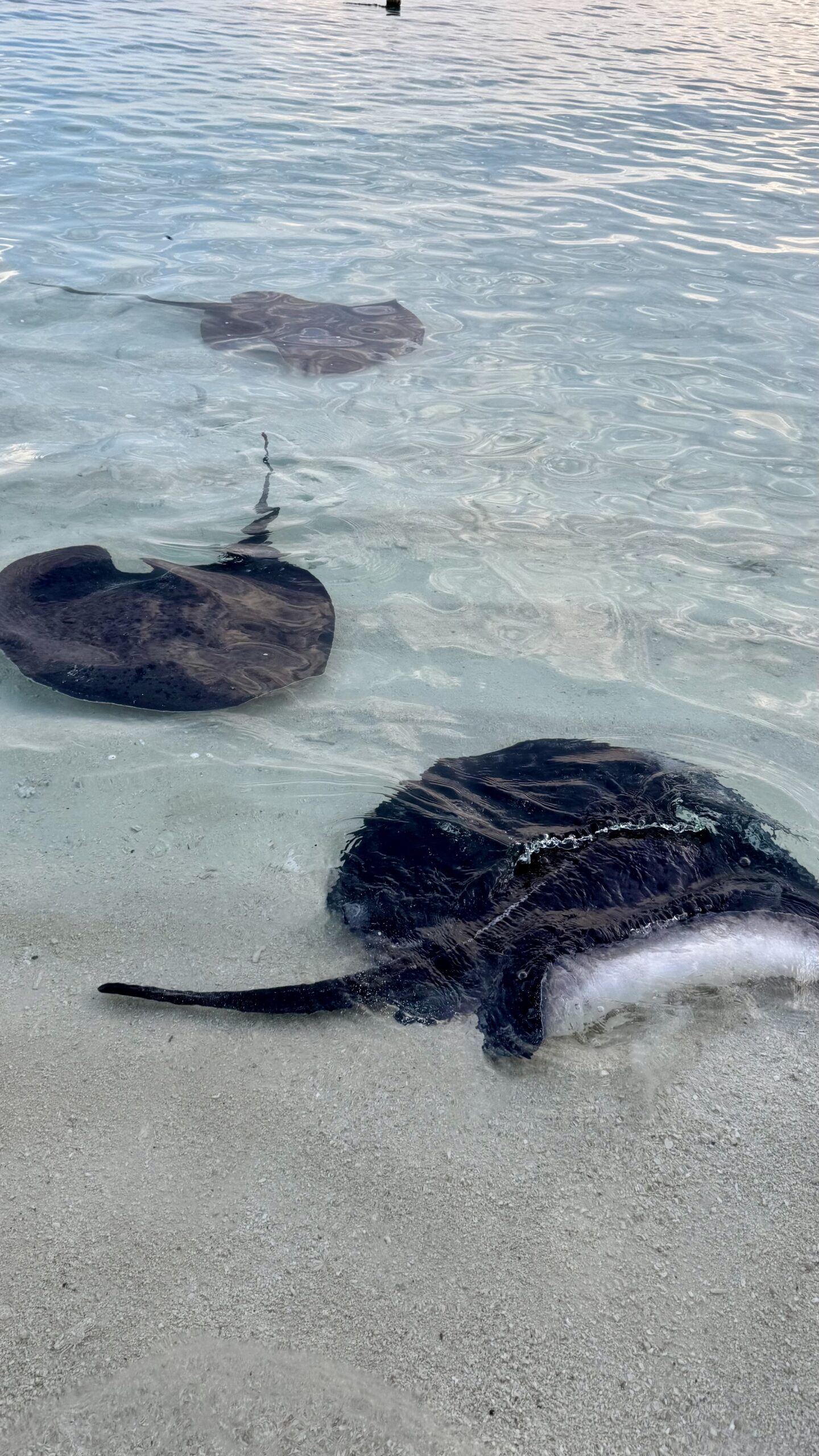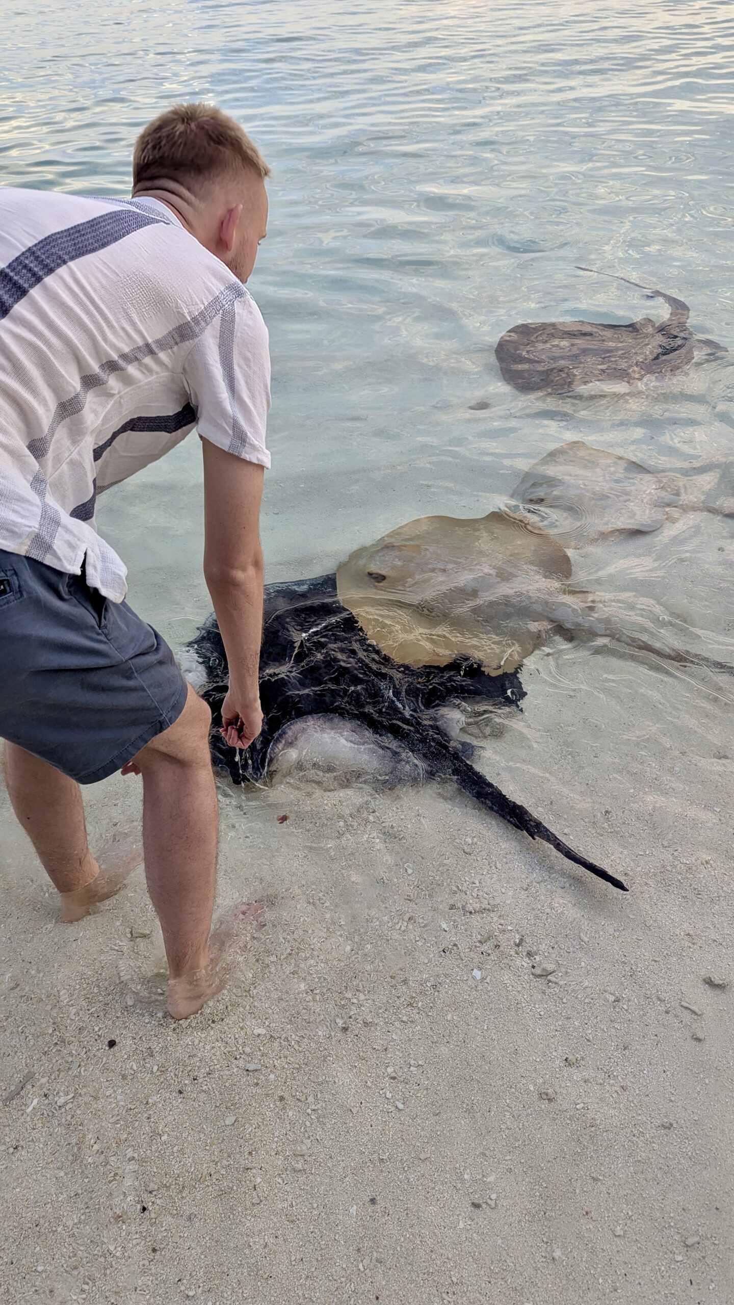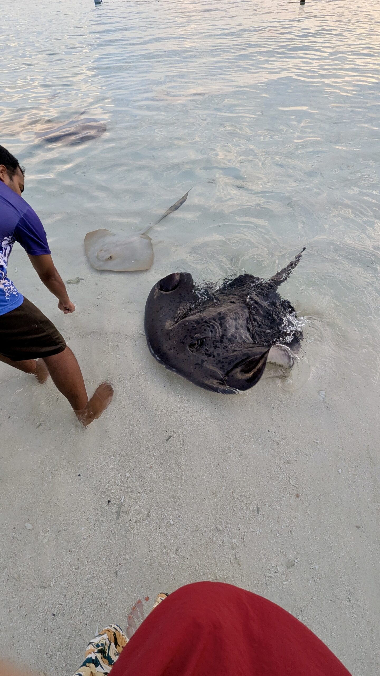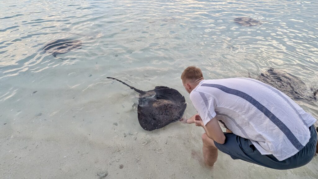 Zunächst machten wir uns aber auf den Weg zur Stachelrochen-Fütterung. Jeden Abend bringen die Köche an einem bestimmten Strandabschnitt die Fischreste des Tages und verfüttern sie an die Rochen. Man kann den Tieren dabei ganz nah kommen: Wenn man die Hand mit Futter ins Wasser hält, schwimmen sie heran, gleiten sanft darüber und saugen die Nahrung ein, bevor sie wieder davongleiten.