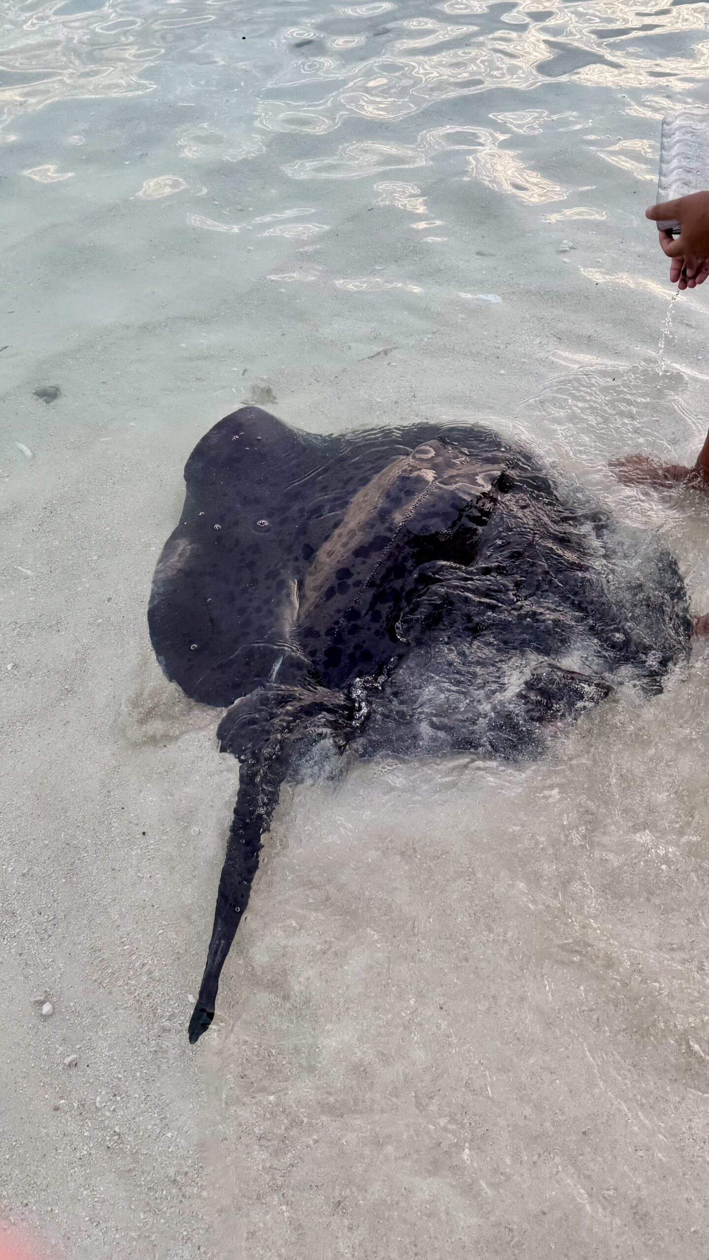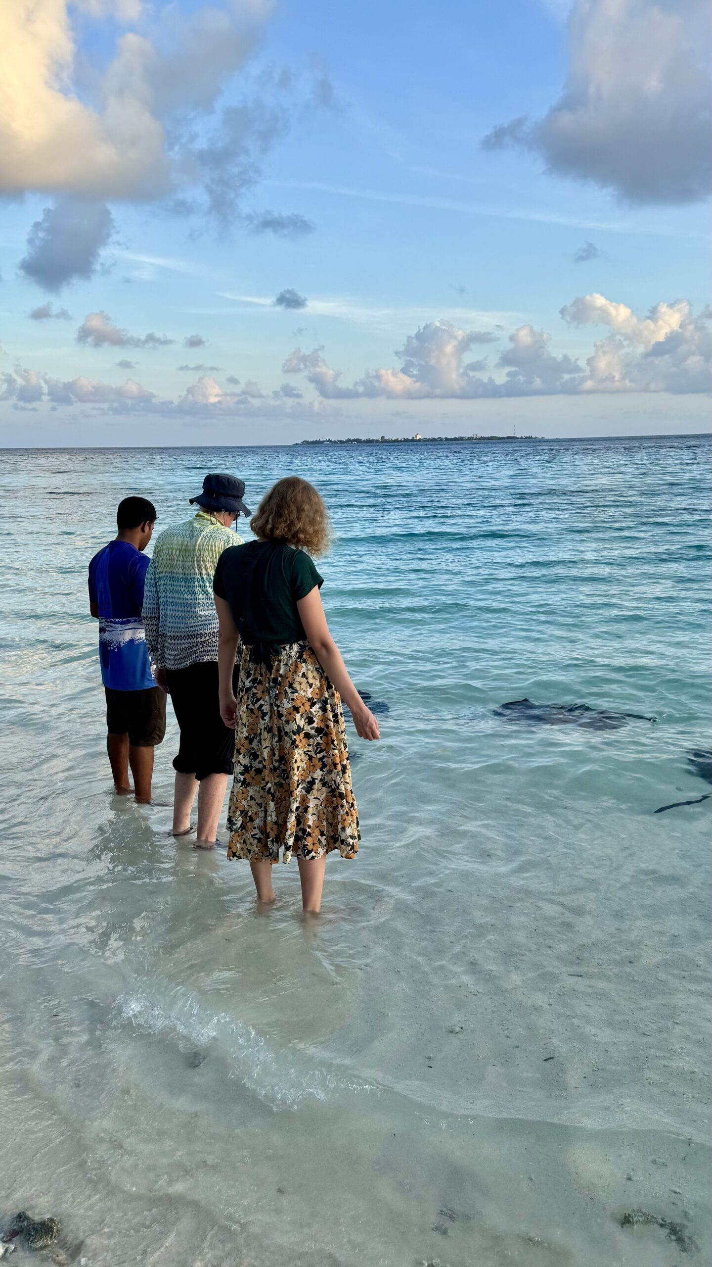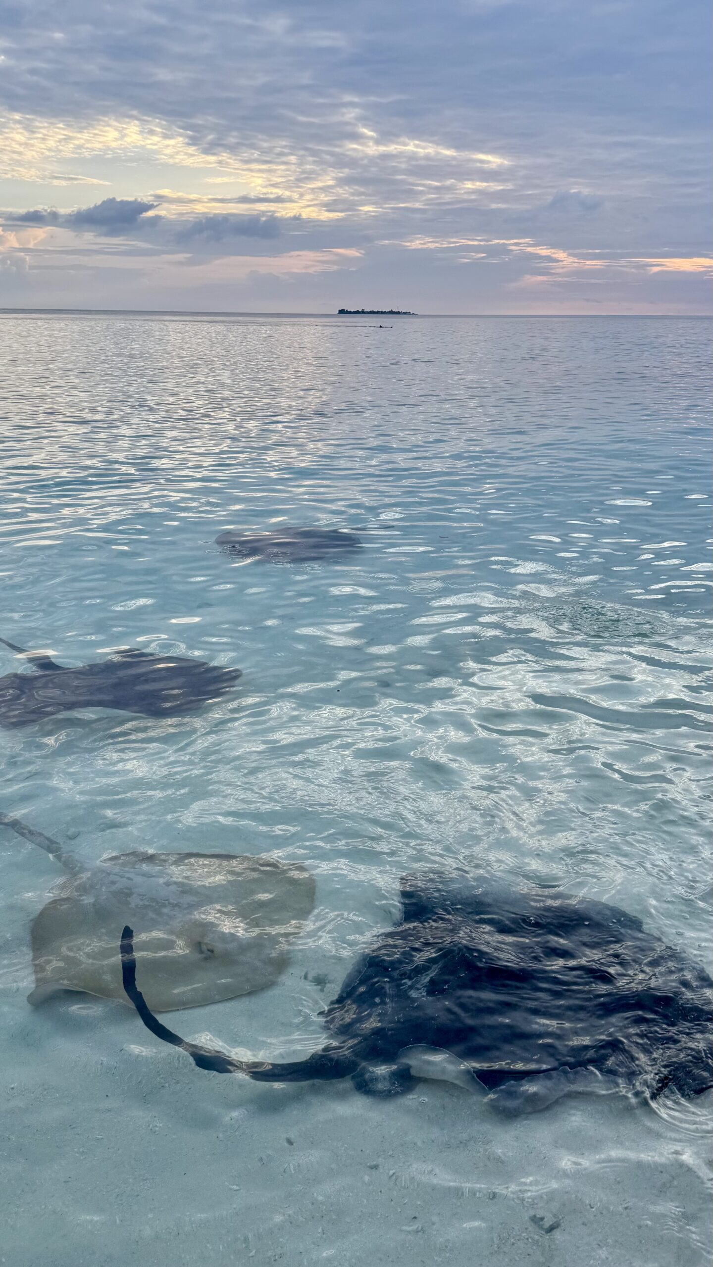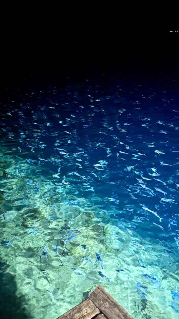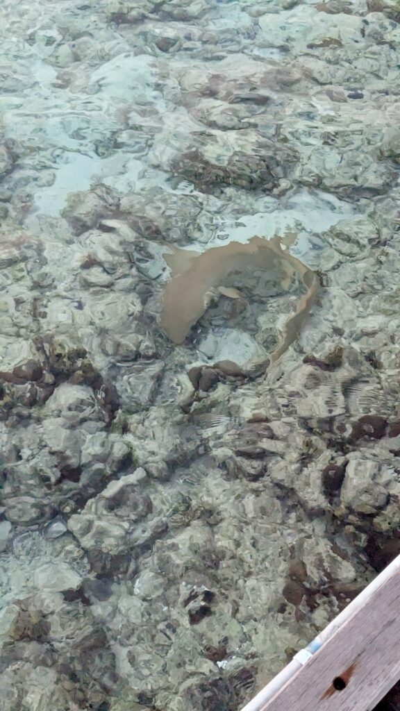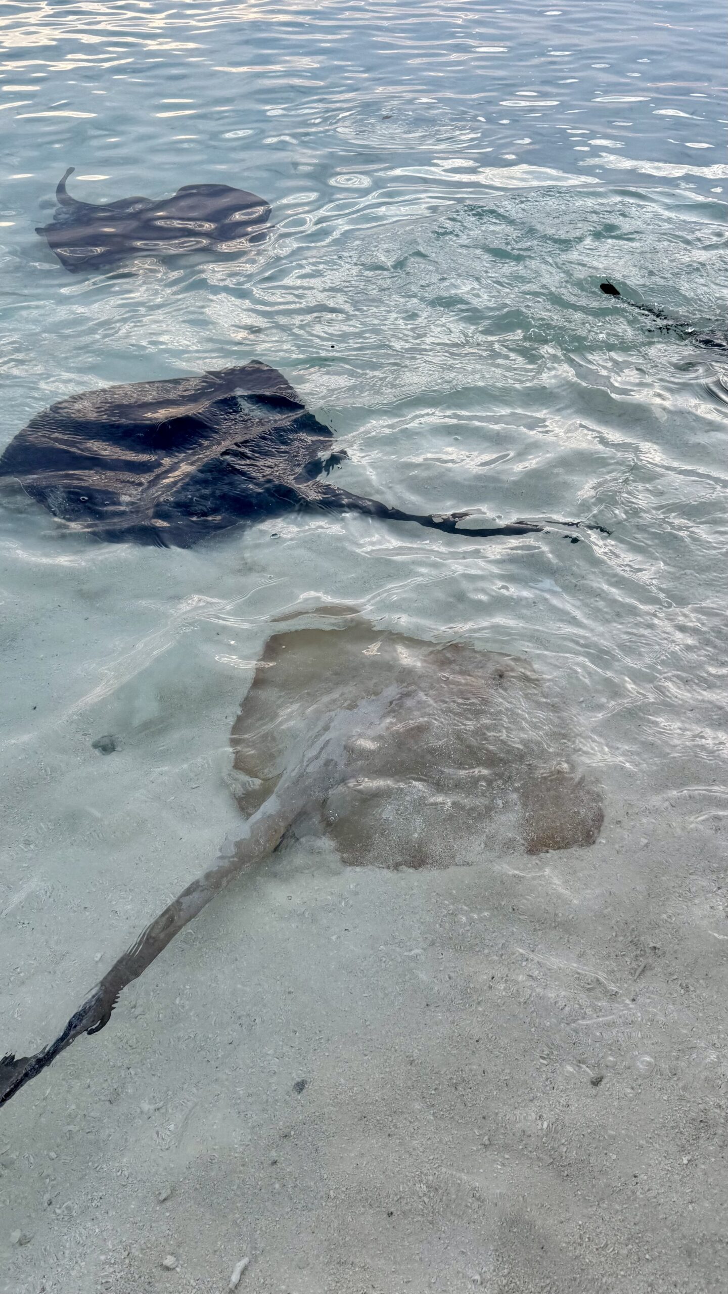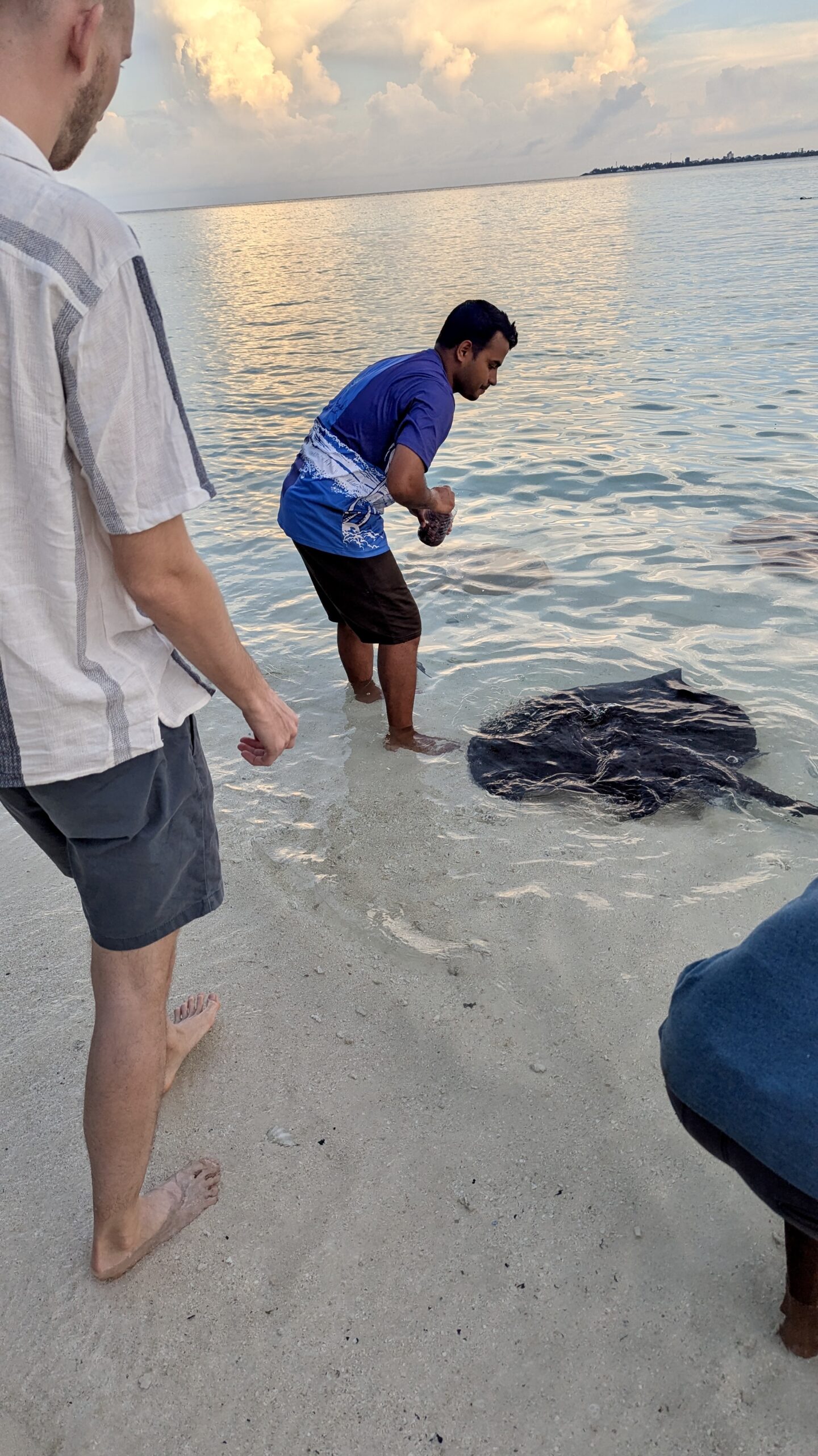 Zunächst machten wir uns aber auf den Weg zur Stachelrochen-Fütterung. Jeden Abend bringen die Köche an einem bestimmten Strandabschnitt die Fischreste des Tages und verfüttern sie an die Rochen. Man kann den Tieren dabei ganz nah kommen: Wenn man die Hand mit Futter ins Wasser hält, schwimmen sie heran, gleiten sanft darüber und saugen die Nahrung ein, bevor sie wieder davongleiten.