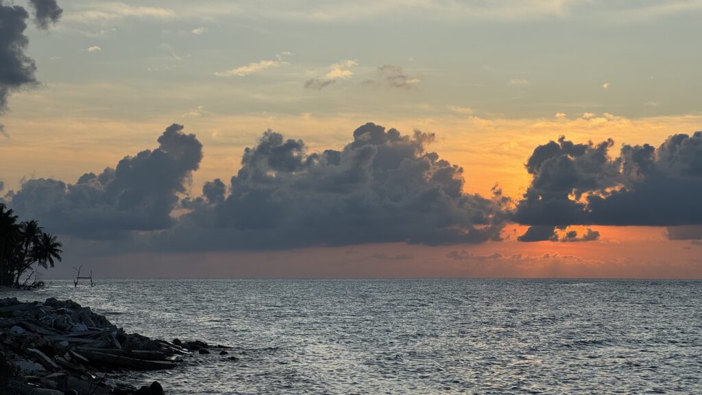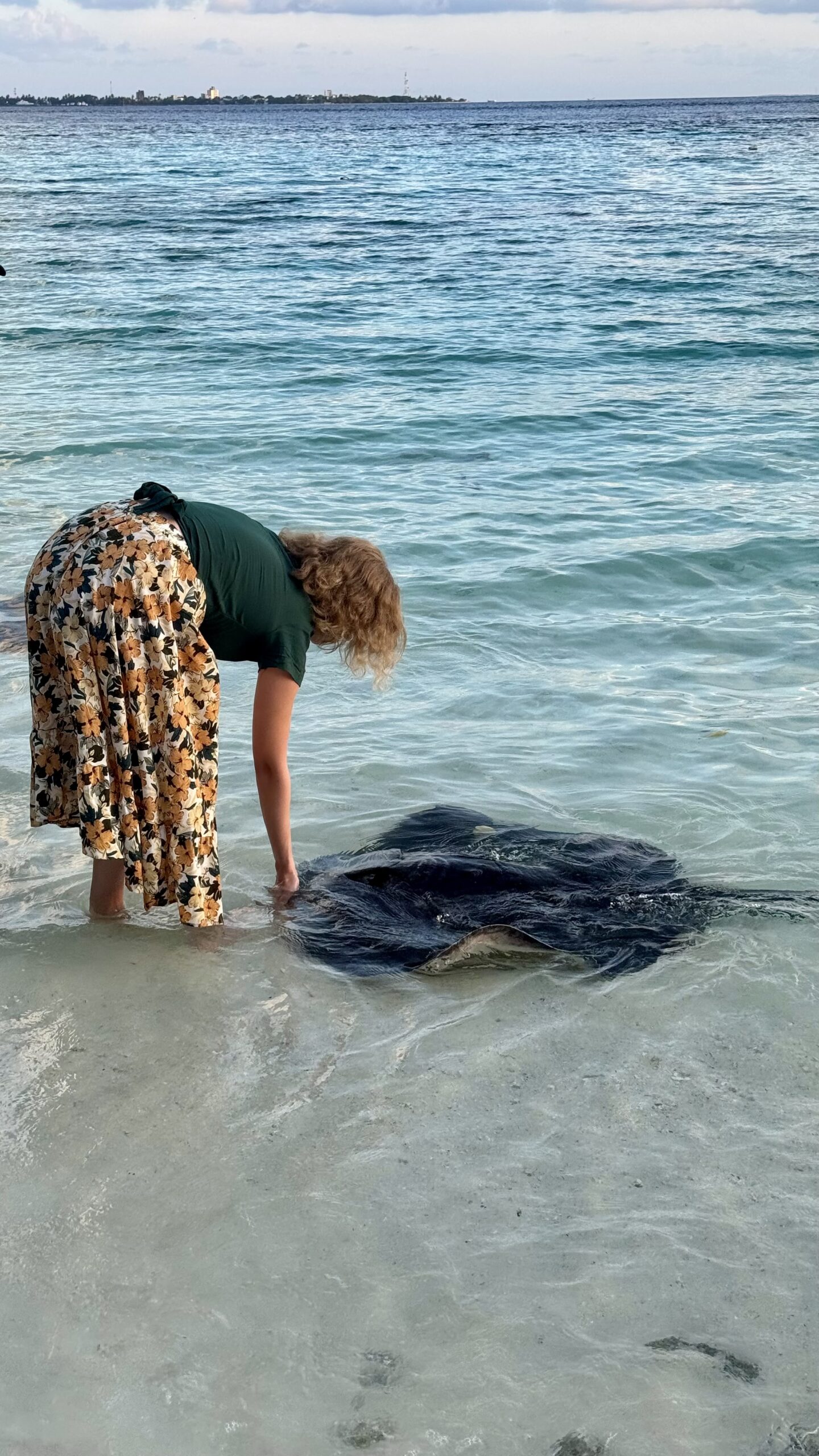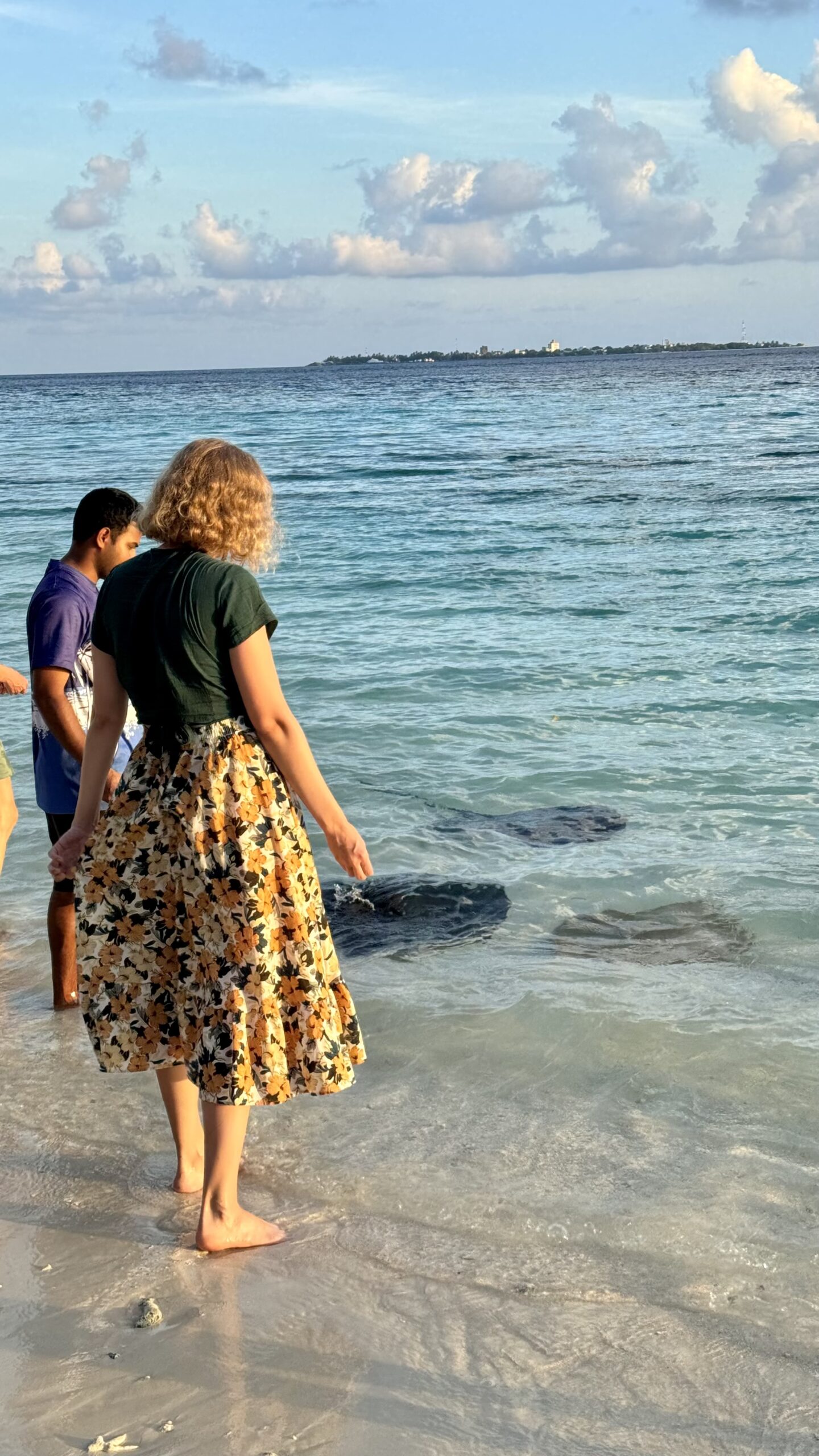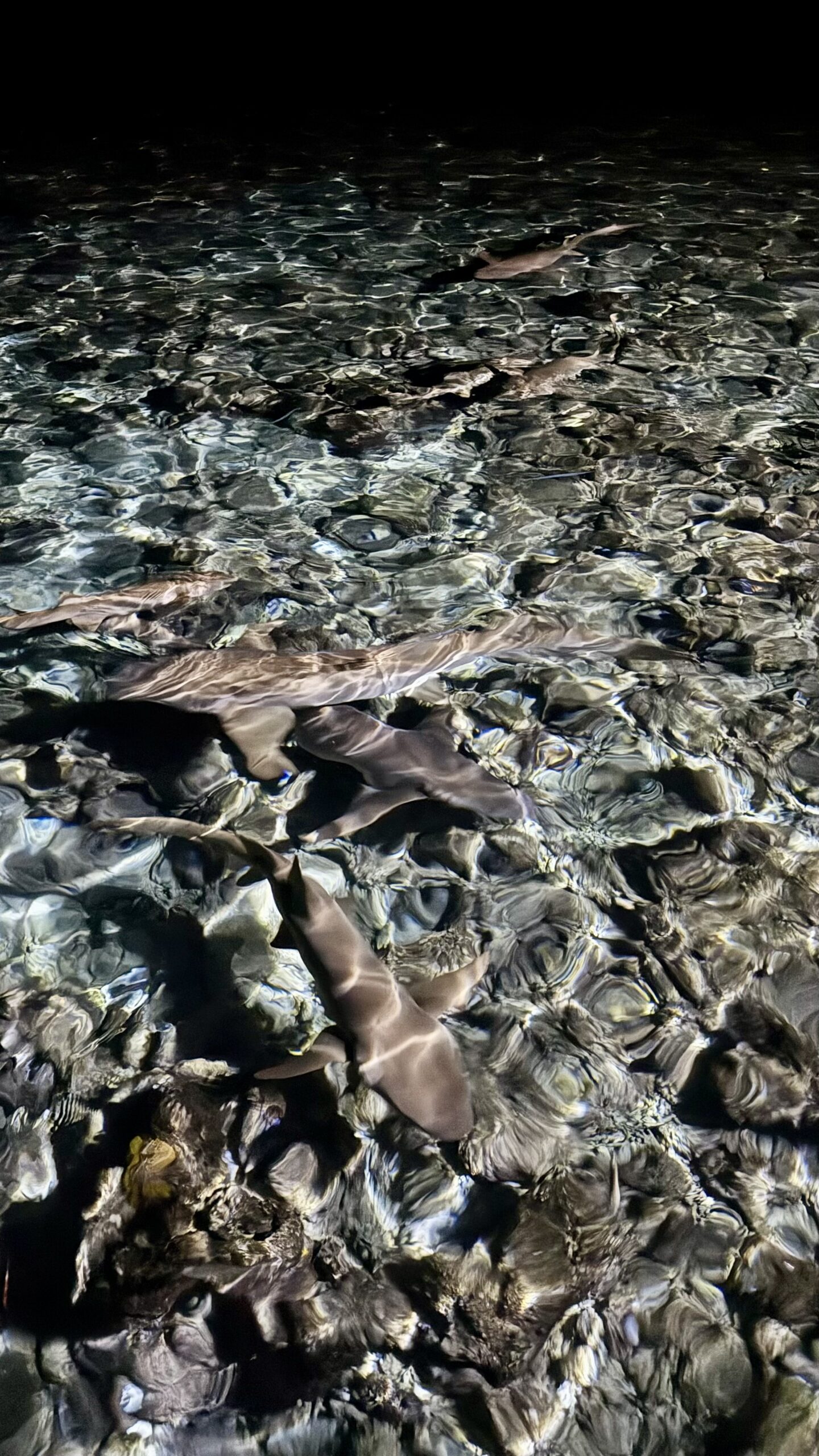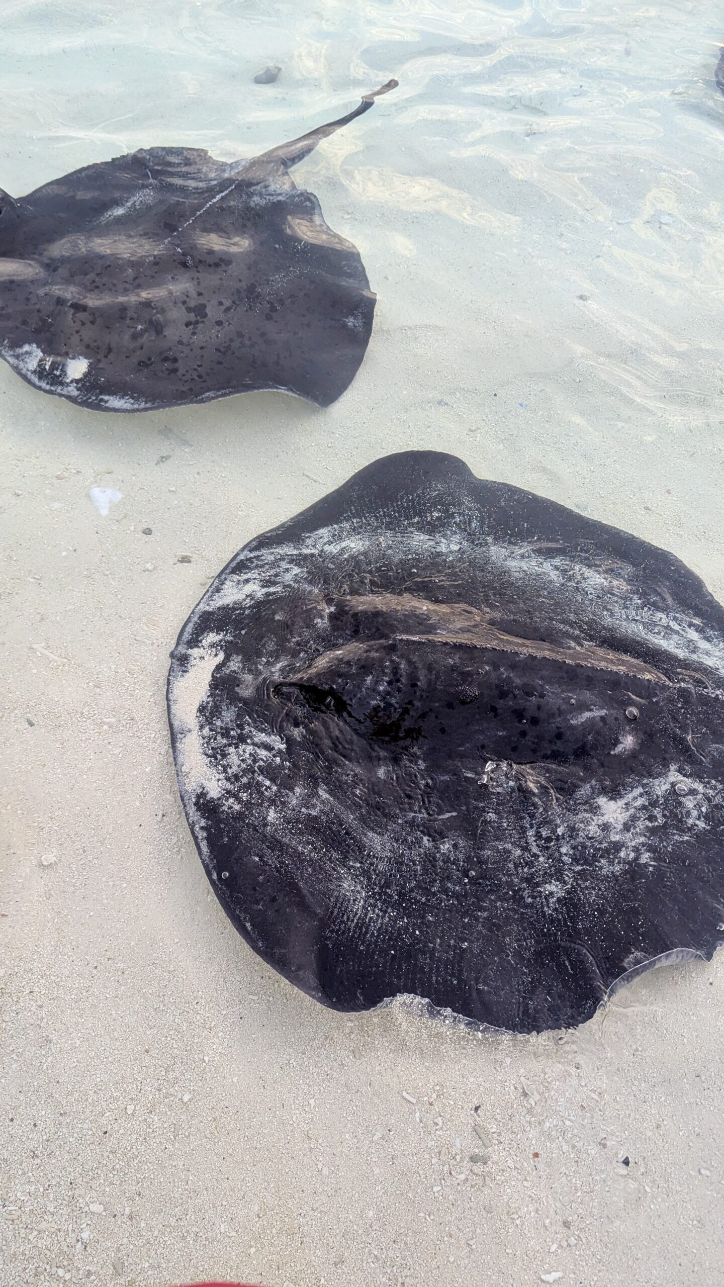 Zunächst machten wir uns aber auf den Weg zur Stachelrochen-Fütterung. Jeden Abend bringen die Köche an einem bestimmten Strandabschnitt die Fischreste des Tages und verfüttern sie an die Rochen. Man kann den Tieren dabei ganz nah kommen: Wenn man die Hand mit Futter ins Wasser hält, schwimmen sie heran, gleiten sanft darüber und saugen die Nahrung ein, bevor sie wieder davongleiten.