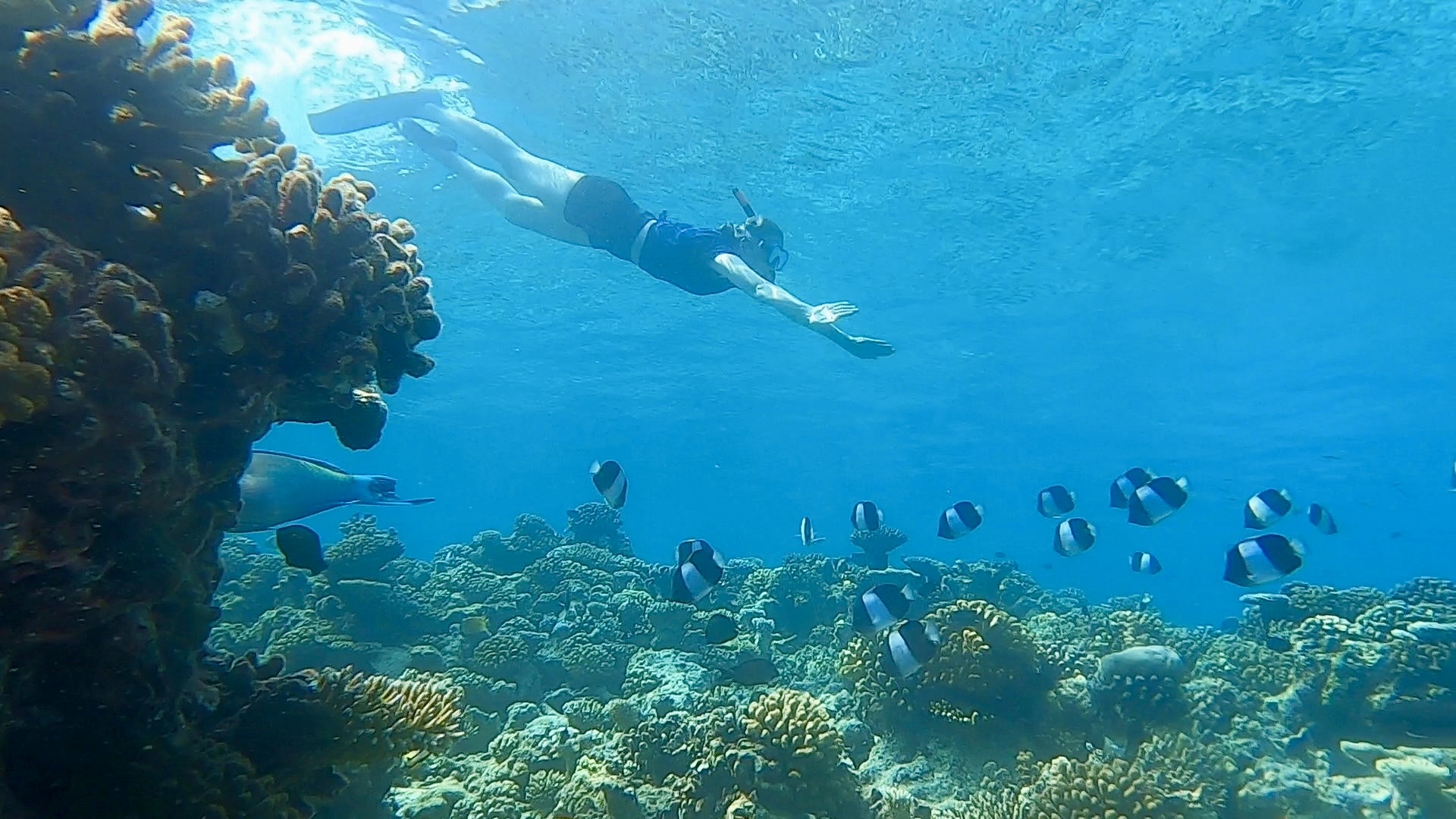 Da der Triggerfisch am Morgen auf der rechten Seite gewesen war, steuerte ich dieses Mal die linke Seite an und tauchte entlang der Korallen. Am Nachmittag wirkten die Fische auf mich viel aktiver als am Vormittag. Doch nicht nur die kleinen Fische waren jetzt unterwegs: Ein großer Stachelrochen schwamm nur zwei Meter unter mir entlang. Sascha hielt die Umgebung ständig im Blick – immer auf der Suche nach Triggerfischen, denn mit denen wollten wir definitiv keine weiteren Erfahrungen machen. Auch ich konzentrierte mich darauf, diese Tiere in der Tiefe zu erspähen, anstatt in eine andere Richtung zu schauen.