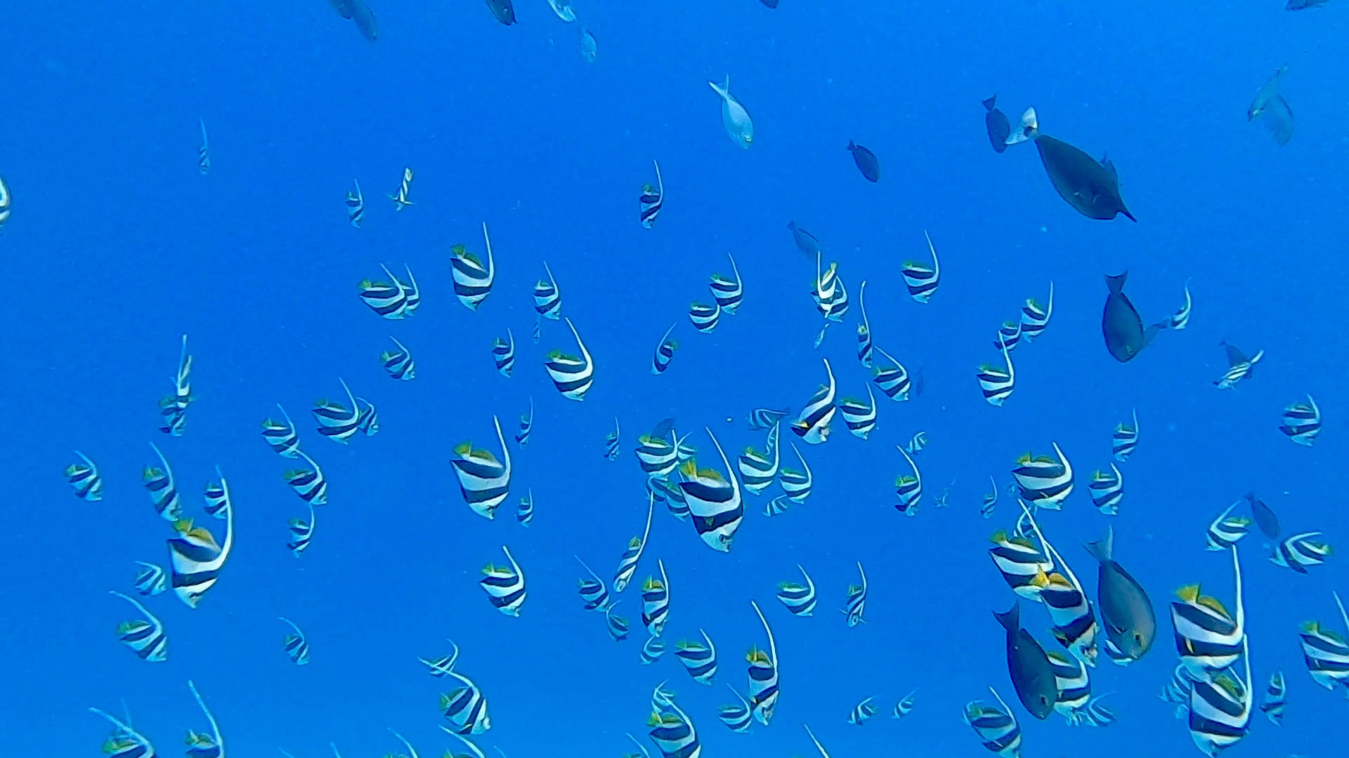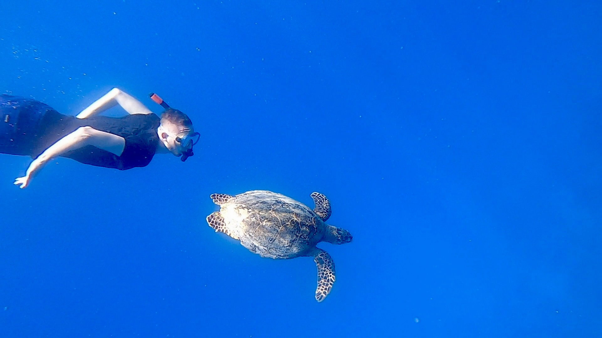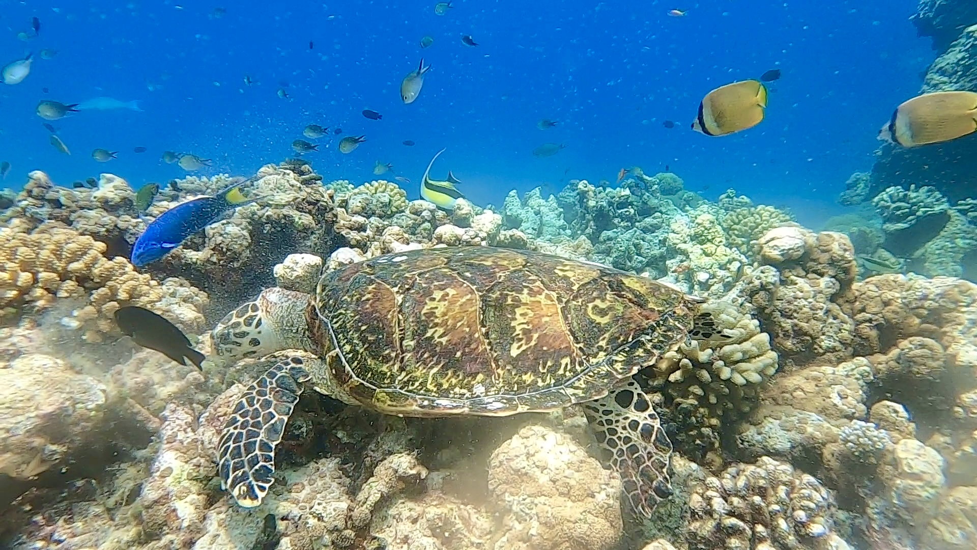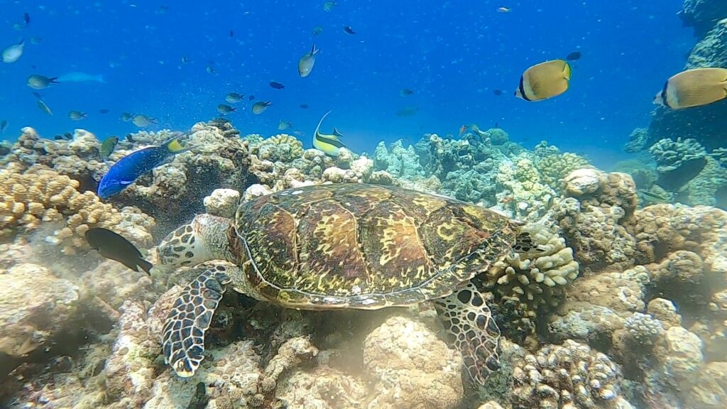 Nachdem wir keine Mantas finden konnten, brachte Hassan uns zu einem Riff, etwa 30 Minuten von Omadhoo entfernt. Dort sprangen wir erneut ins Wasser und tauchten in eine farbenfrohe, lebendige Korallenwelt ein. Zwei Meeresschildkröten tauchten immer wieder keine zwei Meter neben uns auf, schnappten Luft und glitten dann wieder in die Tiefe hinab, um am Riff nach Nahrung zu suchen. Mehrmals schwammen Sascha und ich eine Weile neben ihnen her und bewunderten dabei nicht nur die Schildkröten, sondern auch die beeindruckende Fischvielfalt.