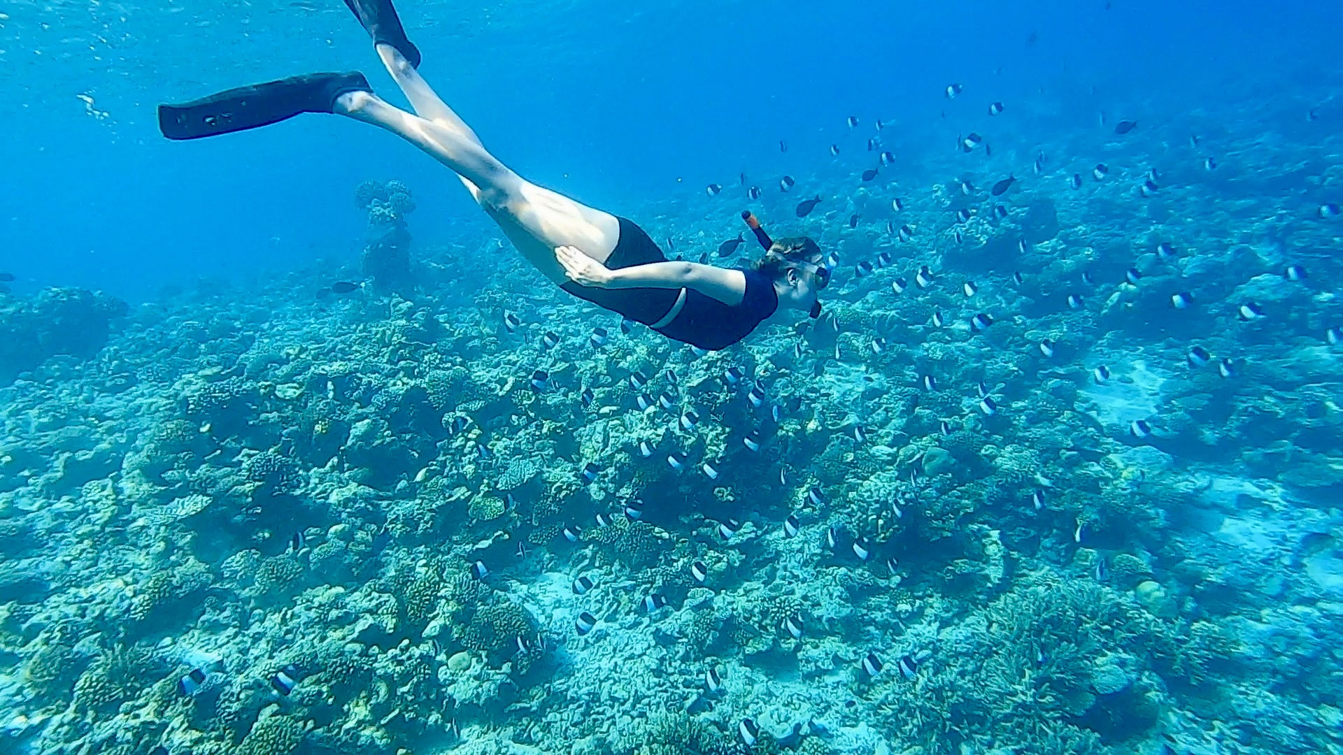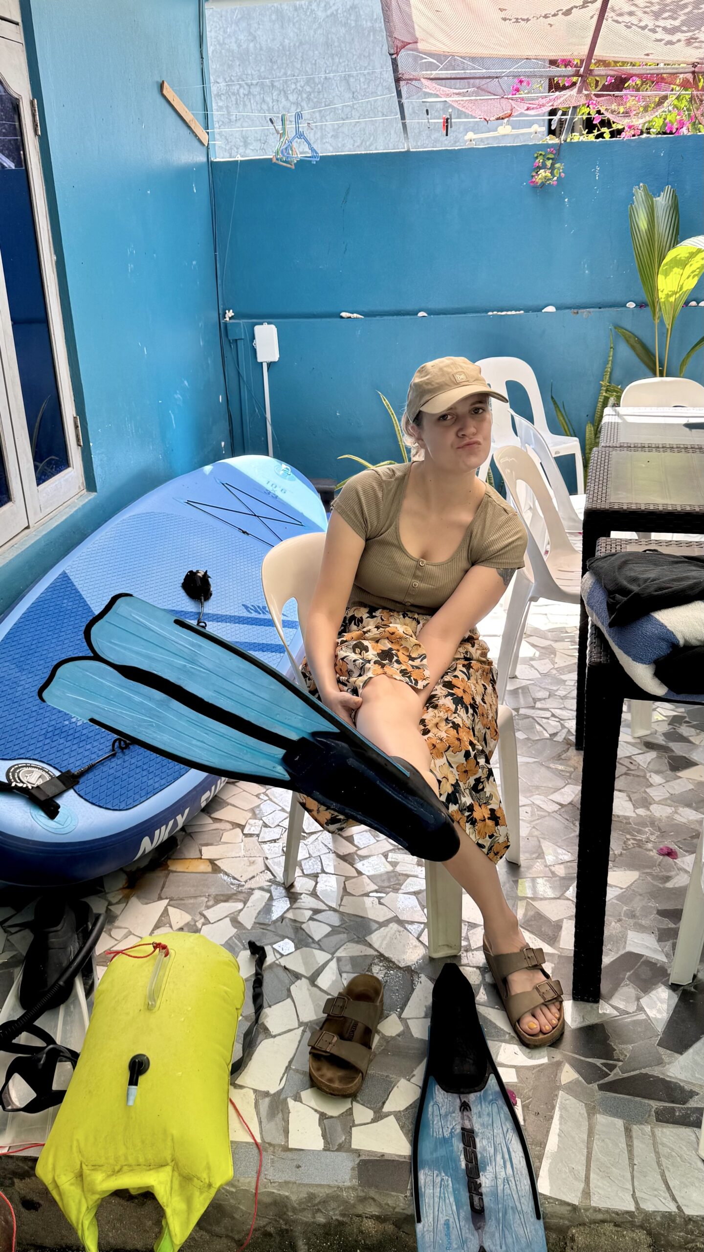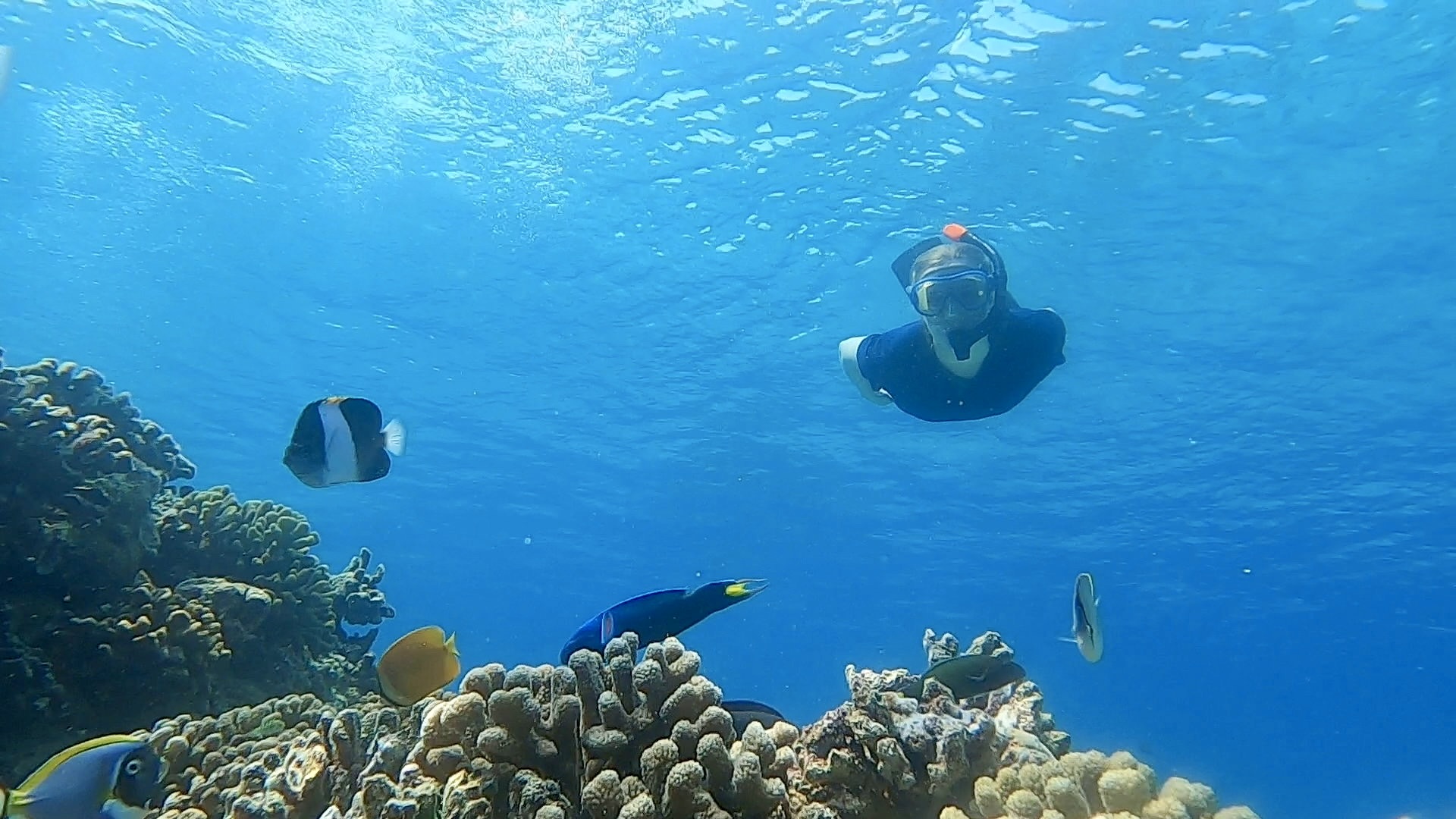 Da Ray an diesem Tag mit unangenehmem Druck auf den Ohren zu kämpfen hatte und das Tauchen aussetzen musste, schlug Ester vor, dass wir zu dritt am Hausriff schnorcheln gehen, während Ray sich am Strand entspannte.
