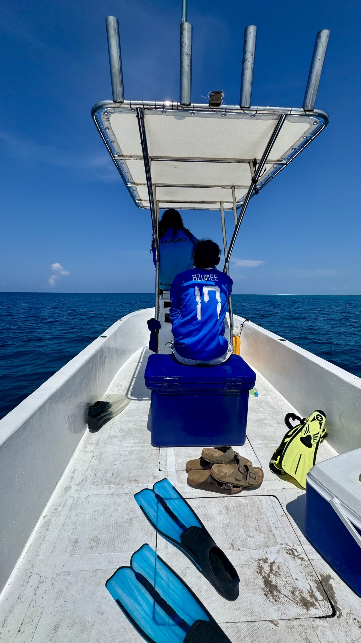 Nach den vier Walhaien machten wir uns auf die Suche nach Mantas. Hassan erhielt einen Hinweis auf einen möglichen Sichtungsort, doch trotz fast 40 Minuten intensiver Suche aus dem Boot heraus fanden wir leider keine. Mit der prallen Sonne am Himmel war das wirklich anstrengend. Hassan hatte extra eine Kühltruhe mit an Bord gebracht, gefüllt mit Bananen, Wasser, Säften und Keksen, von denen wir uns immer wieder bedienten. Er und sein Kollege hingegen verzichteten darauf – wirklich beeindruckend, ihr Durchhaltevermögen.