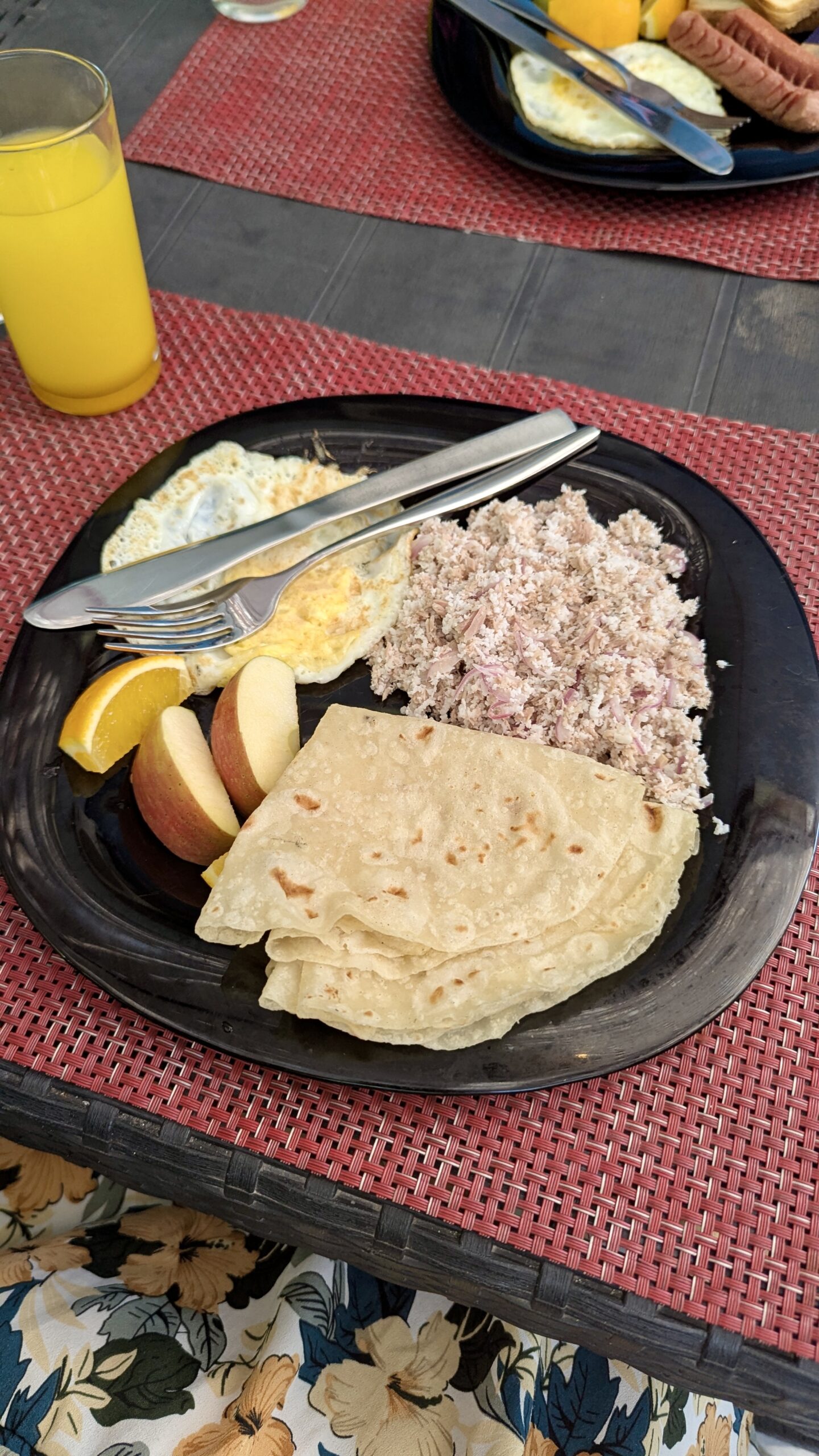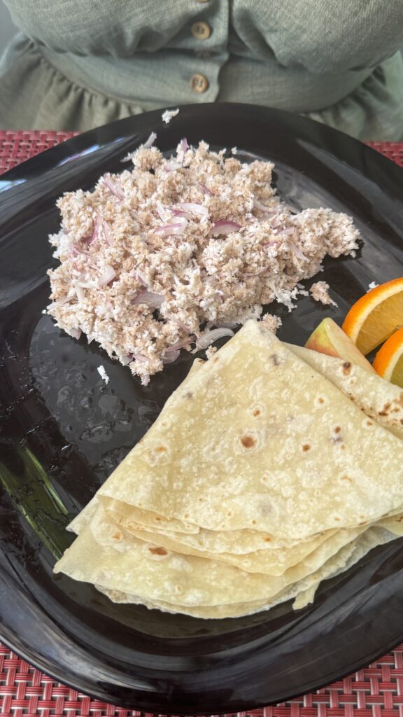 Am nächsten Morgen starteten wir um 8 Uhr, und vorher gab es noch ein leckeres maledivisches Frühstück für mich: Thunfischsalat mit Kokosnuss und Fladenbrot. Sascha entschied sich für das kontinentale Frühstück mit Toast, Ei, Butter und Marmelade. Hassan besitzt ein kleines Boot, auf dem theoretisch vier Gäste Platz finden, aber da sonst niemand mit uns unterwegs war, waren wir zu zweit – zusammen mit einem Kollegen von Hassan.