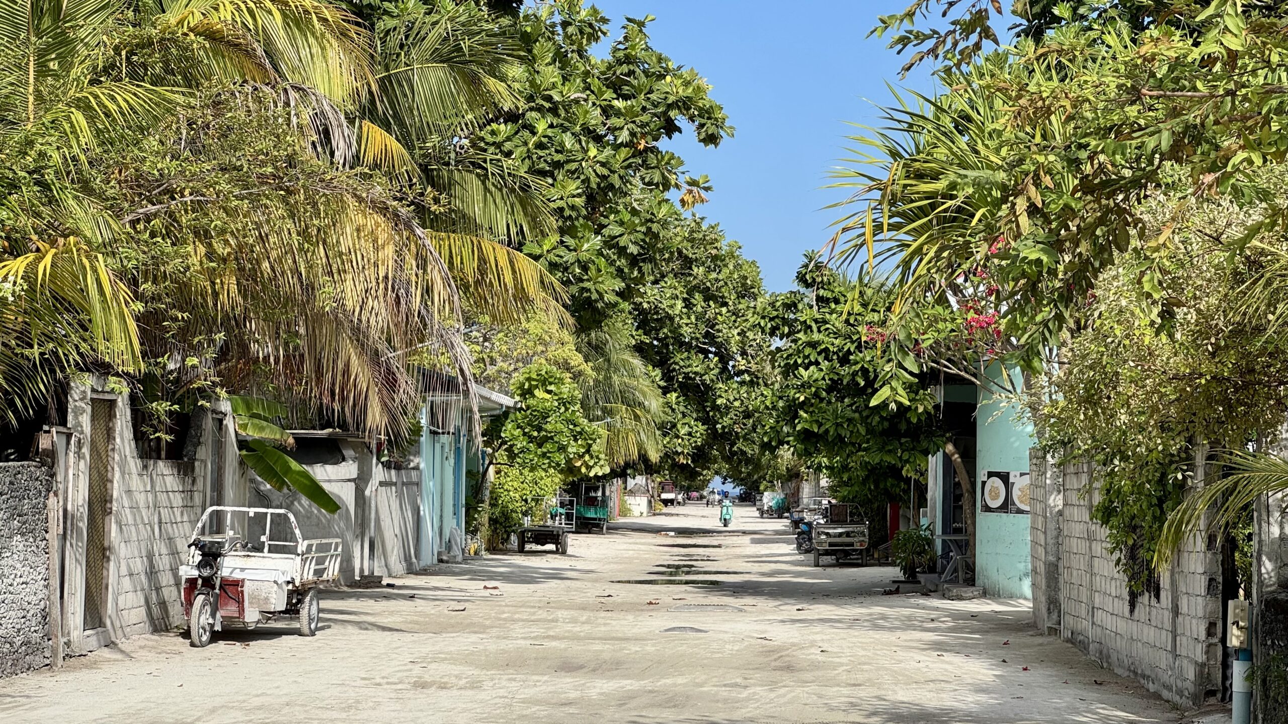 Endlich auf Omadhoo angekommen, wurden wir von Hassan, unserem Gastgeber auf der Insel, in seinem Elektro Golfkart abgeholt.