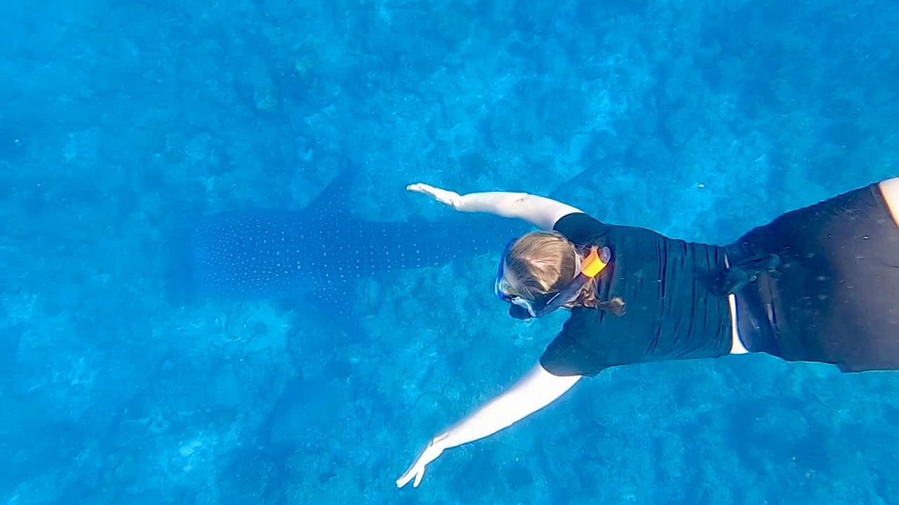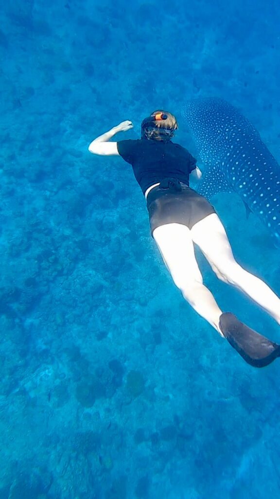 Am Ende sprangen wir viermal ins Wasser und sahen auch viermal einen Walhai – zweimal in Ruhe, zweimal mitten im Chaos der Menschenmassen. Sascha war beim zweiten Mal so genervt, dass er sich einfach zurückfallen ließ und lieber das Riff erkundete, anstatt den Walhai zu beobachten. Ich kann das gut verstehen – wenn sich plötzlich jemand in deine Wade krallt, nur um dich nach hinten zu drücken und sich selbst nach vorne zu bringen, ist das einfach frustrierend.