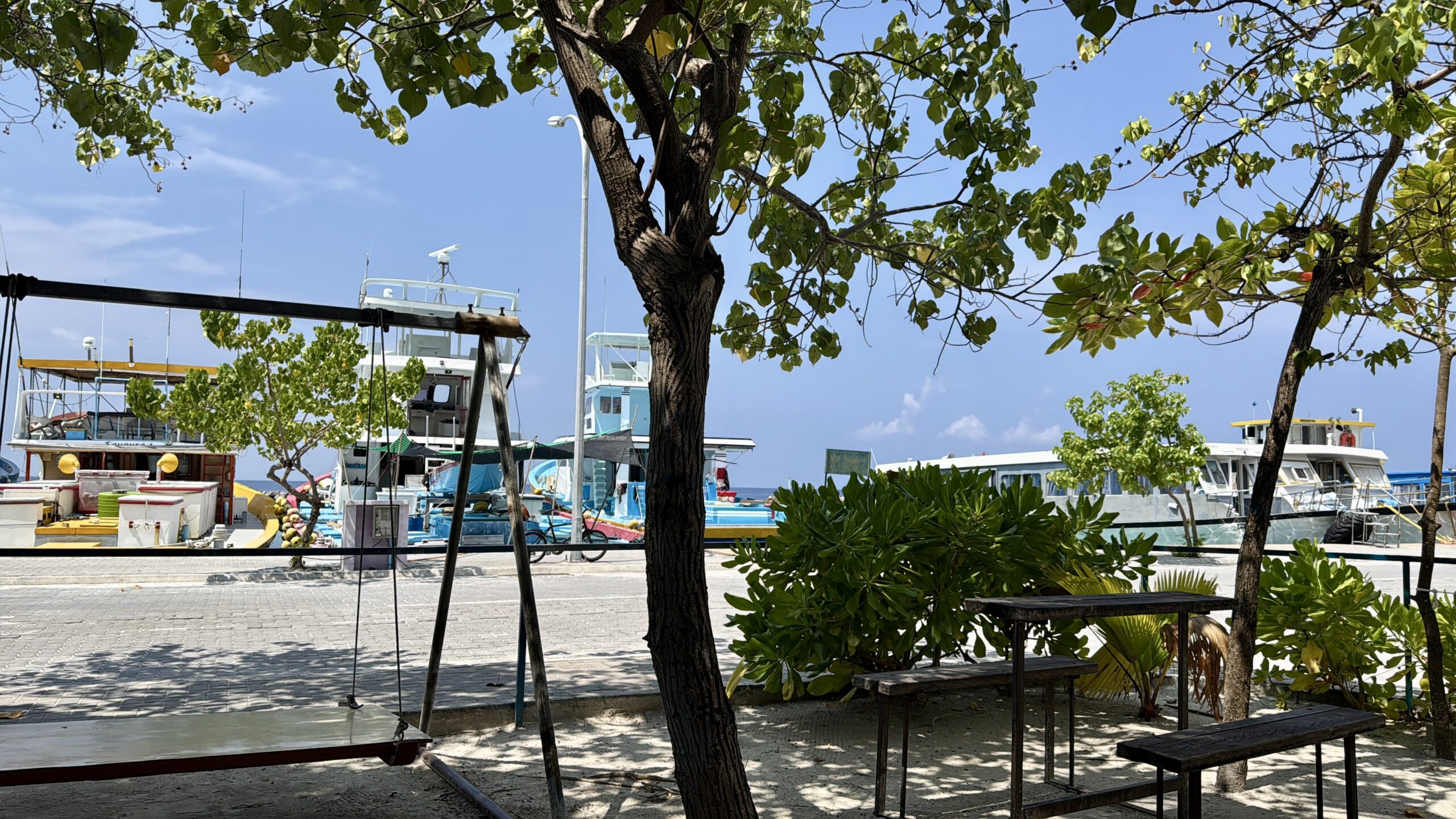 In 15 Minuten ging es wieder zur Hauptinsel Mahibadhoo vom Atoll. Hier hieß es dann, 3 Stunden Zeit überbrücken, bis die nächste Fähre ablegt. Bei 29° im Schatten ist das eine kleine Herausforderung, besonders weil es nicht gerne gesehen wird, wenn du dann trinkst, während alle anderen um einen herum fasten. Die Restaurants direkt am Hafen waren geschlossen und Sascha und ich suchten uns eine kleine Bank in der Nähe der Anlegestelle.