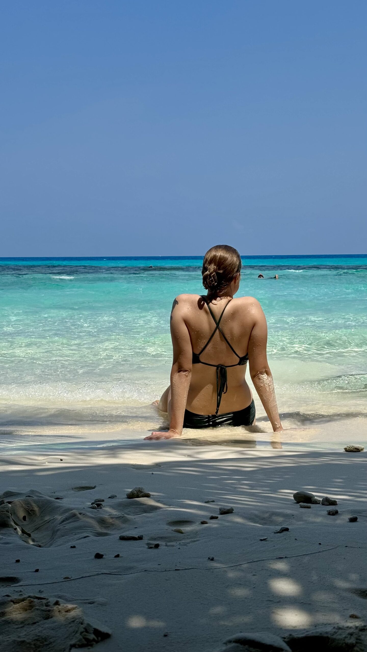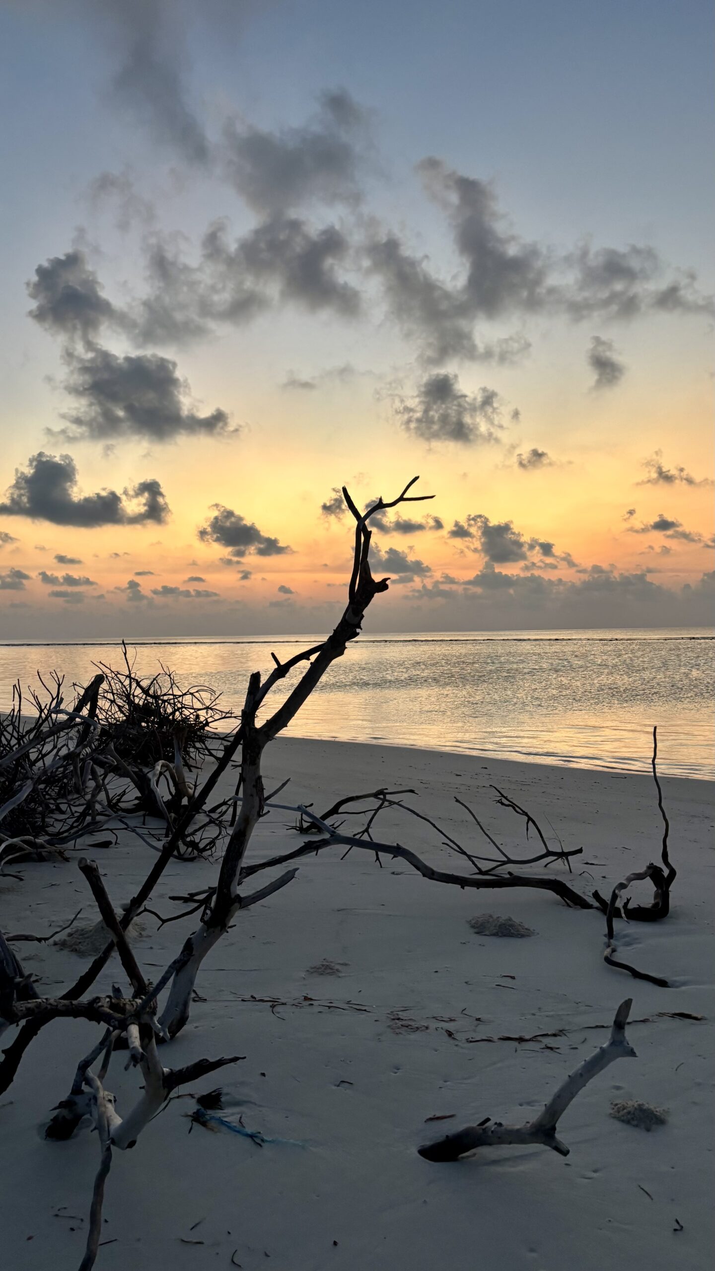 An der absoluten Spitze der Insel (wir kamen dort gegen 6 Uhr an) sieht man auf die nächste Insel, die jedoch für uns nicht zugänglich ist. Man kann bei Ebbe zwar zu ihr rüberlaufen, aber da es sich um eine private Resortinsel handelt, sind Nicht-Gäste dort ungern gesehen. Online hatten wir zudem gelesen, dass an manchen Morgenden in den flachen Wassern Mantas zu sehen sind, die über die Sandbank hinweg schwimmen. Leider begegnete uns nur ein kleiner Babyhai, der im seichten Wasser seine Kreise zog.