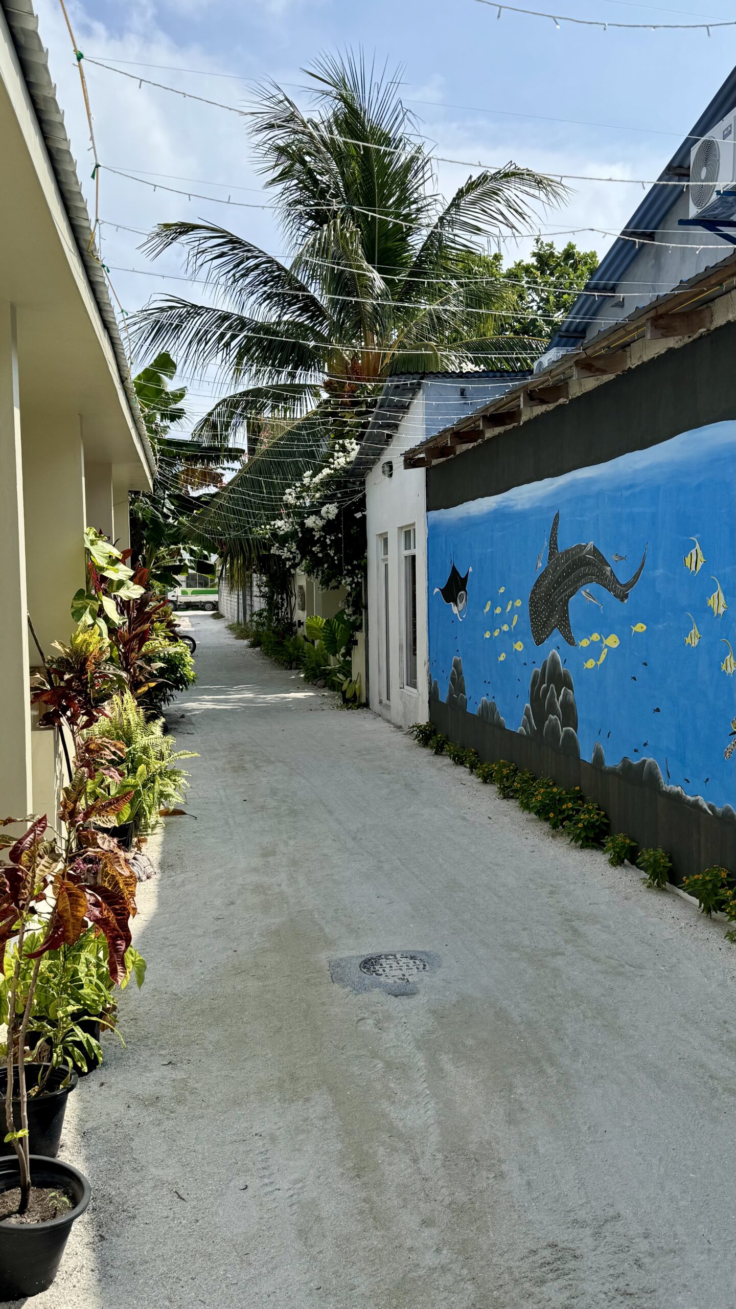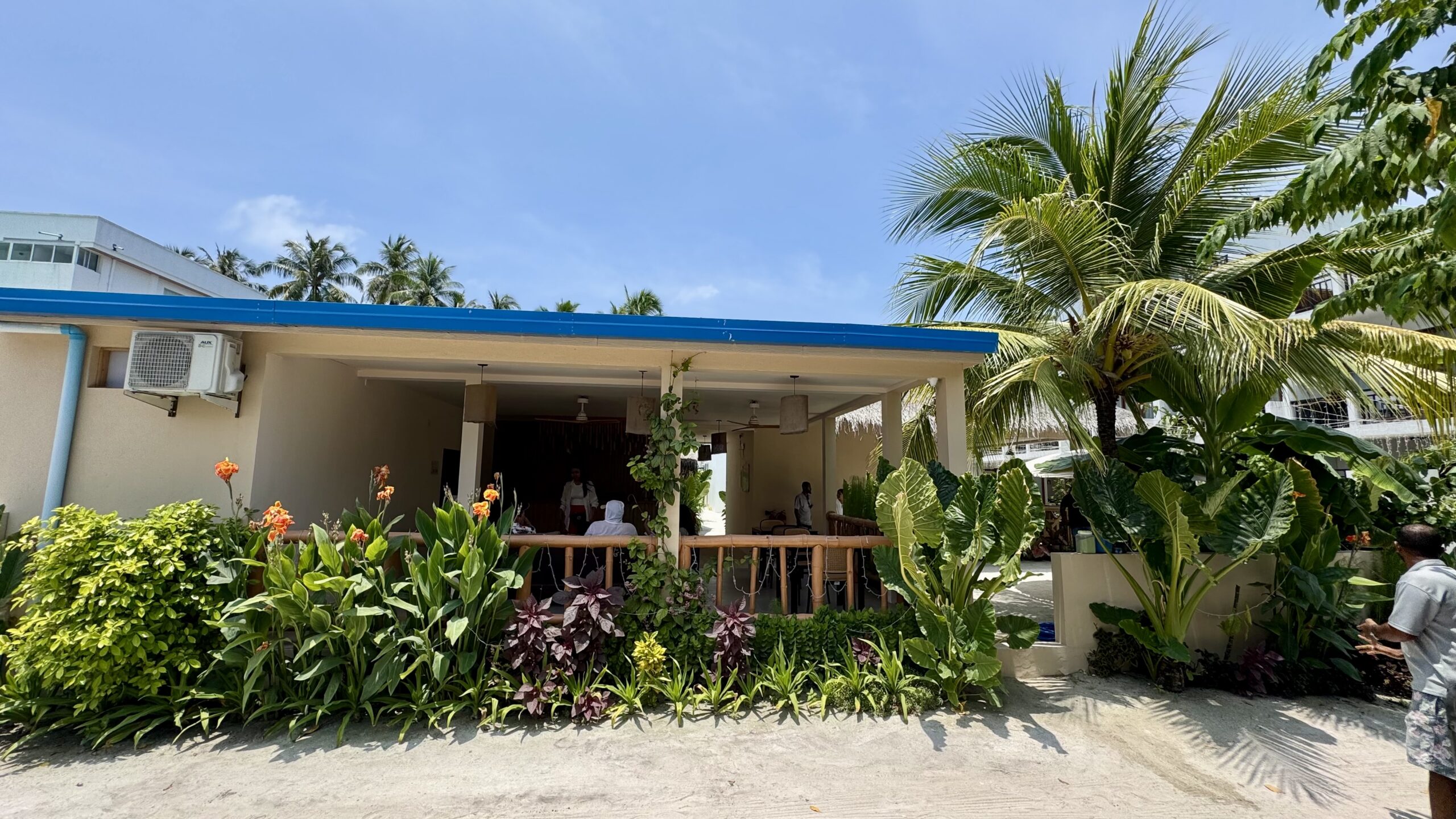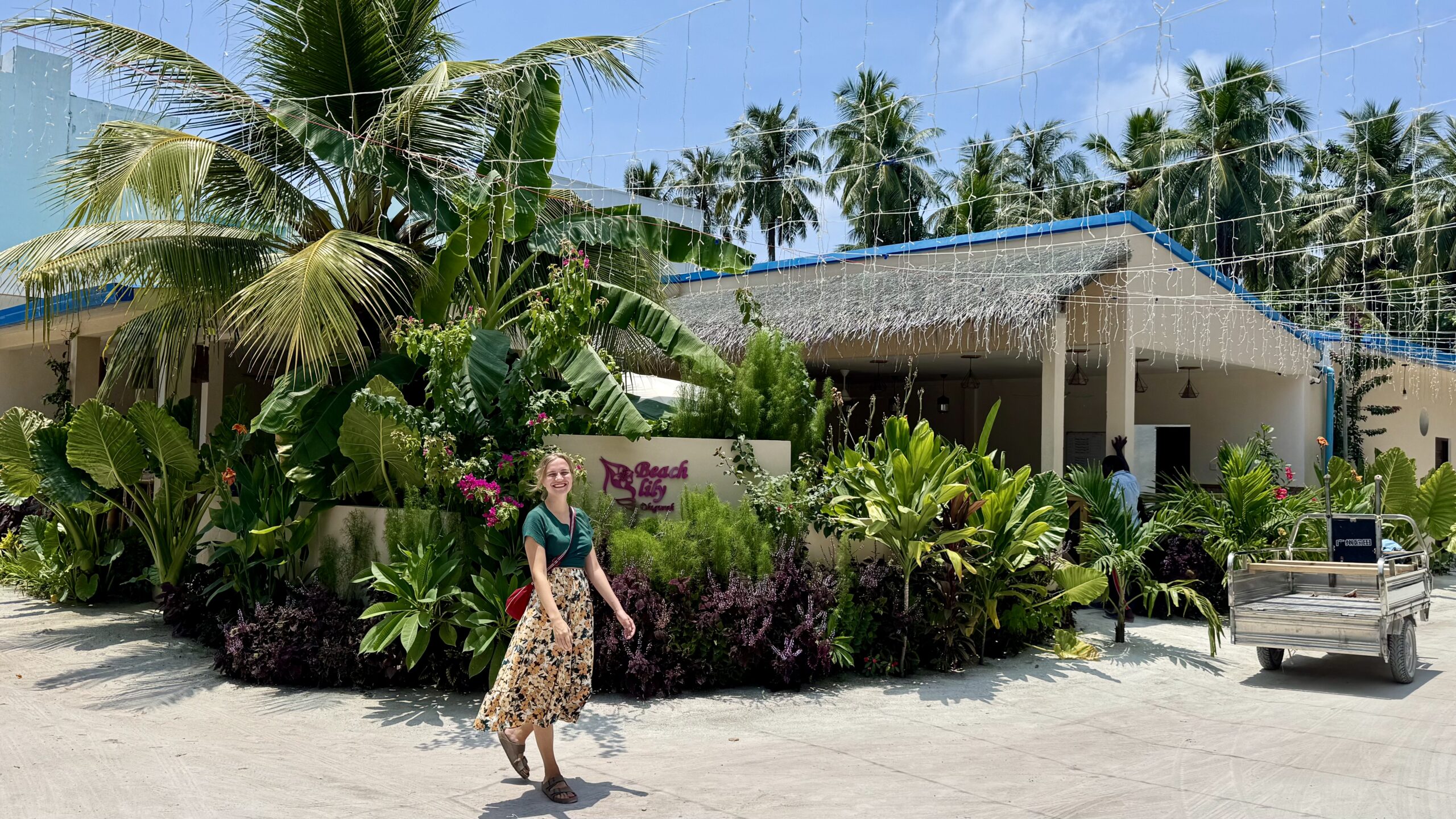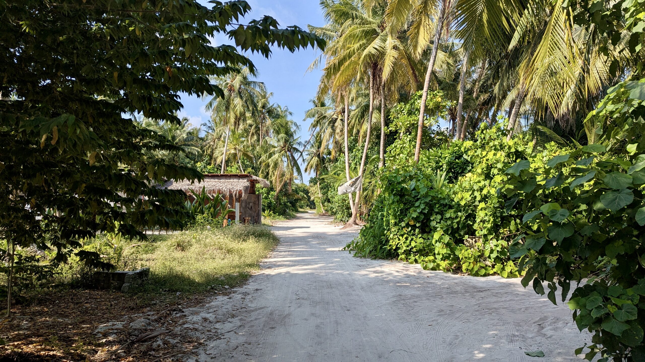 Und dann kamen wir auf Dhigurah an. Mit 3 km Länge auf 275 m Breite ist sie definitiv mehr lang als breit. Und mit 610 Einwohnern weniger dicht besiedelt als Omadhoo, aber deutlich touristischer ausgebaut. Hier reiht sich Hotel an Hotel, an Restaurant, an Hotel. Zudem ist nur ca. 1 km der unteren Spitze richtig besiedelt – je weiter man läuft, desto dschungelartiger wird es und eine lange Sandbank zieht sich nach vorne.