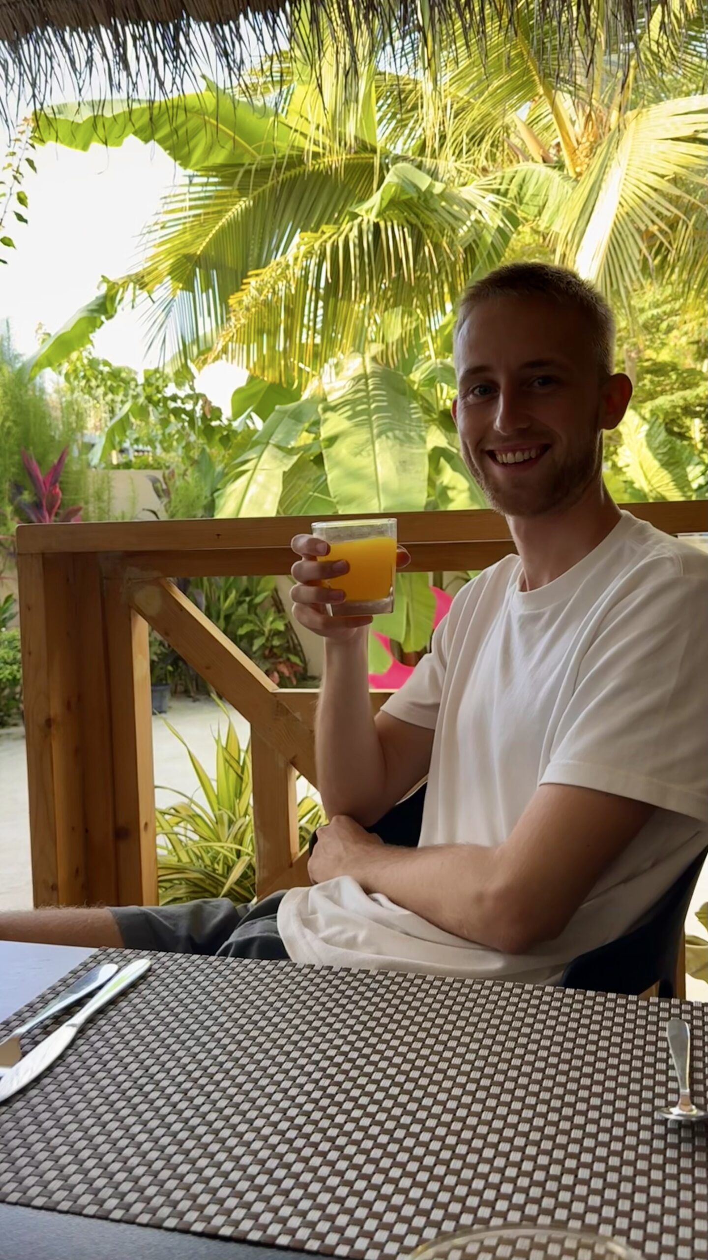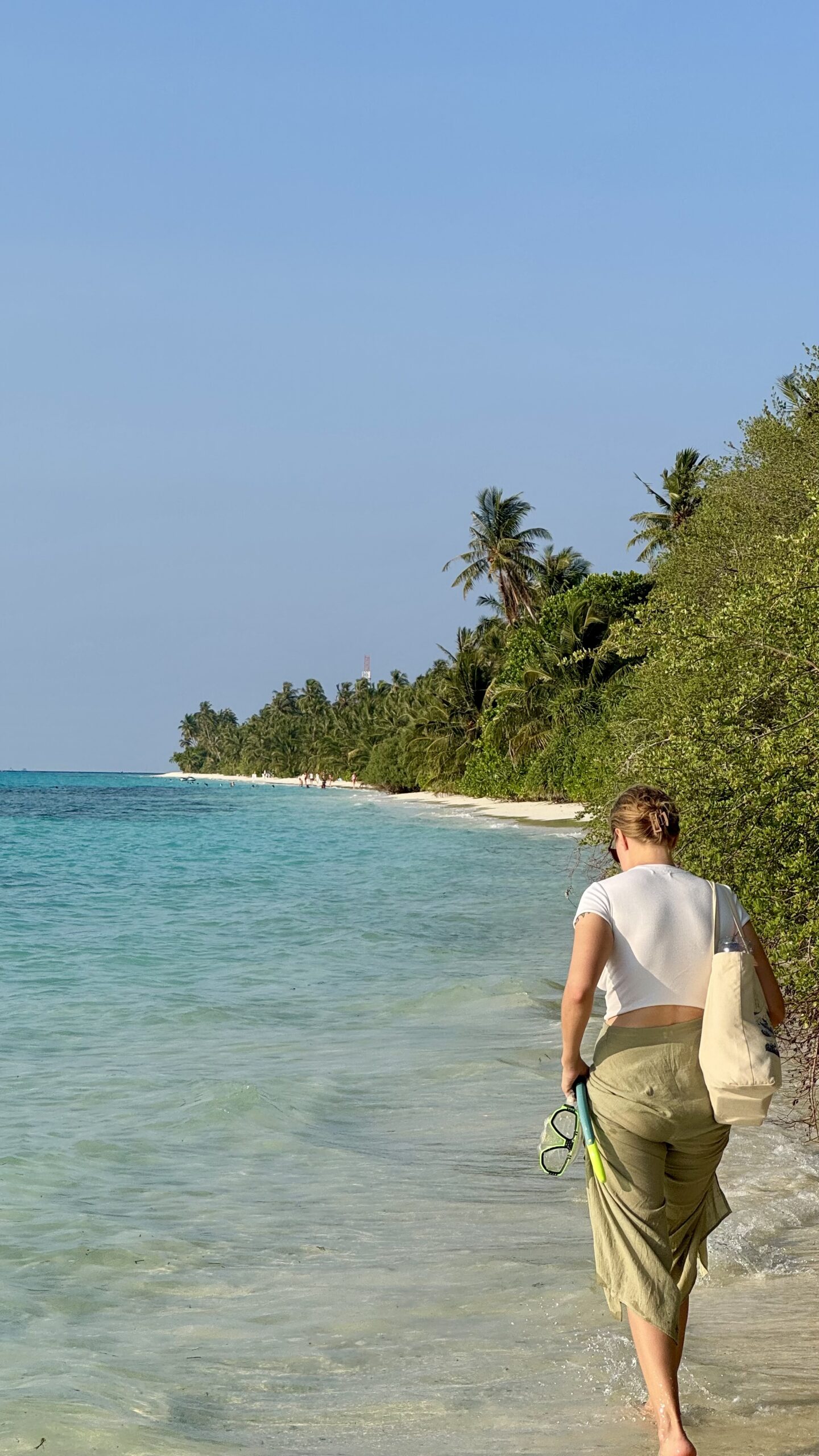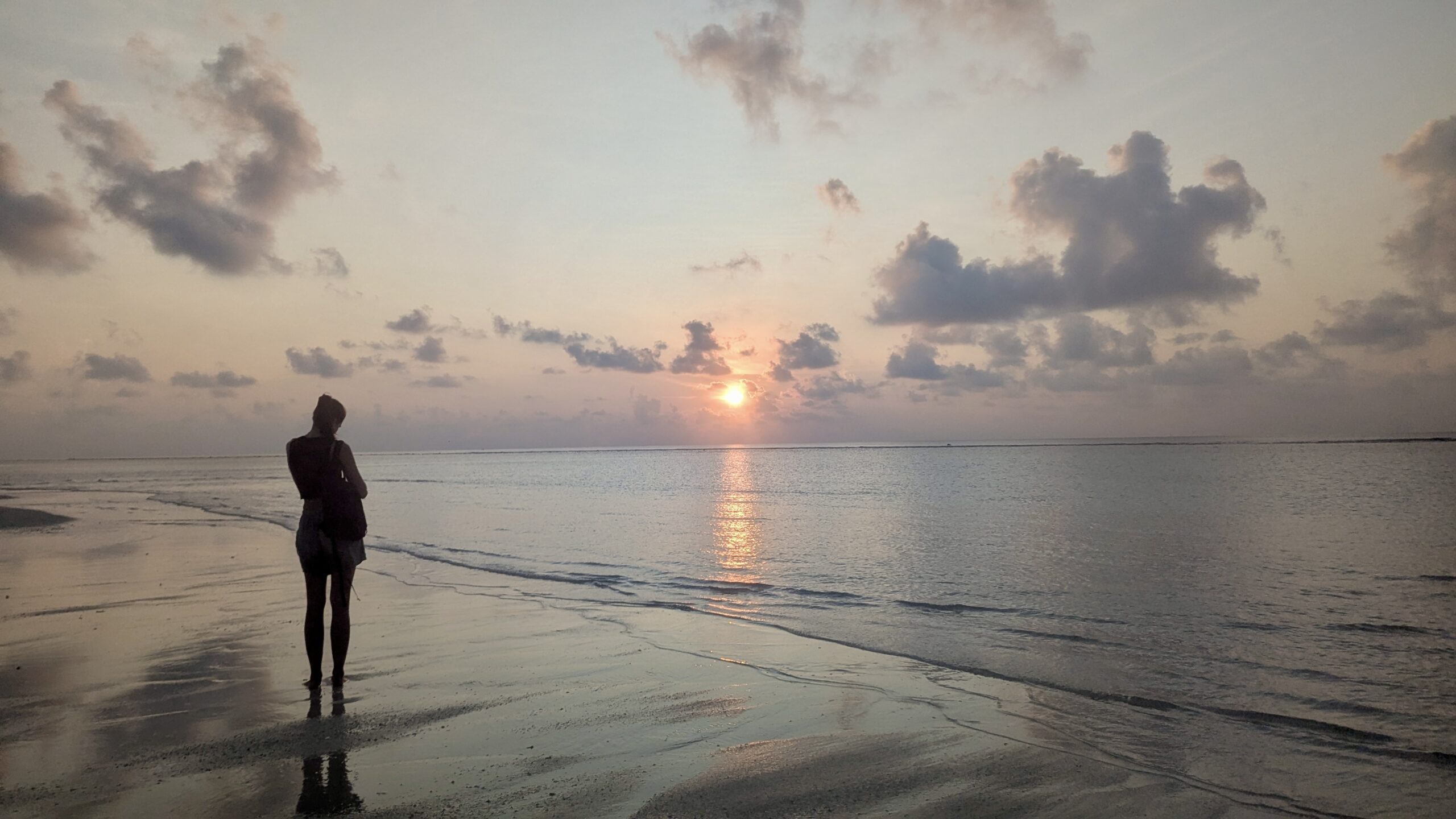 Der Sonnenaufgang war etwas bewölkt, und Sascha schaffte es gerade noch so pünktlich dazu – joggend, mit dem Schnorchel! Ich hätte wohl nur noch ein paar Meter weiterlaufen müssen, um ihn zu finden. Aber gut – zum Glück hatte Sascha ihn entdeckt. Das Schnorcheln lohnte sich an der Stelle des Strands leider nicht. Die Strömung war unglaublich stark und zog einen sehr schnell raus. Selbst ich als geübte Schwimmerin kämpfte mit meinen Flossen gegen den starken Zug und entschied mich nach fünf Minuten, dass ich das lieber lassen sollte.
