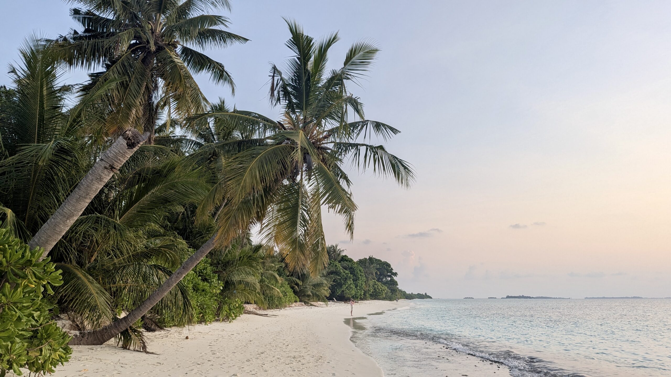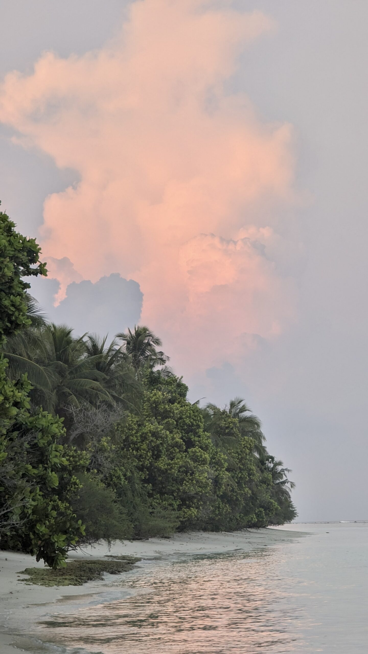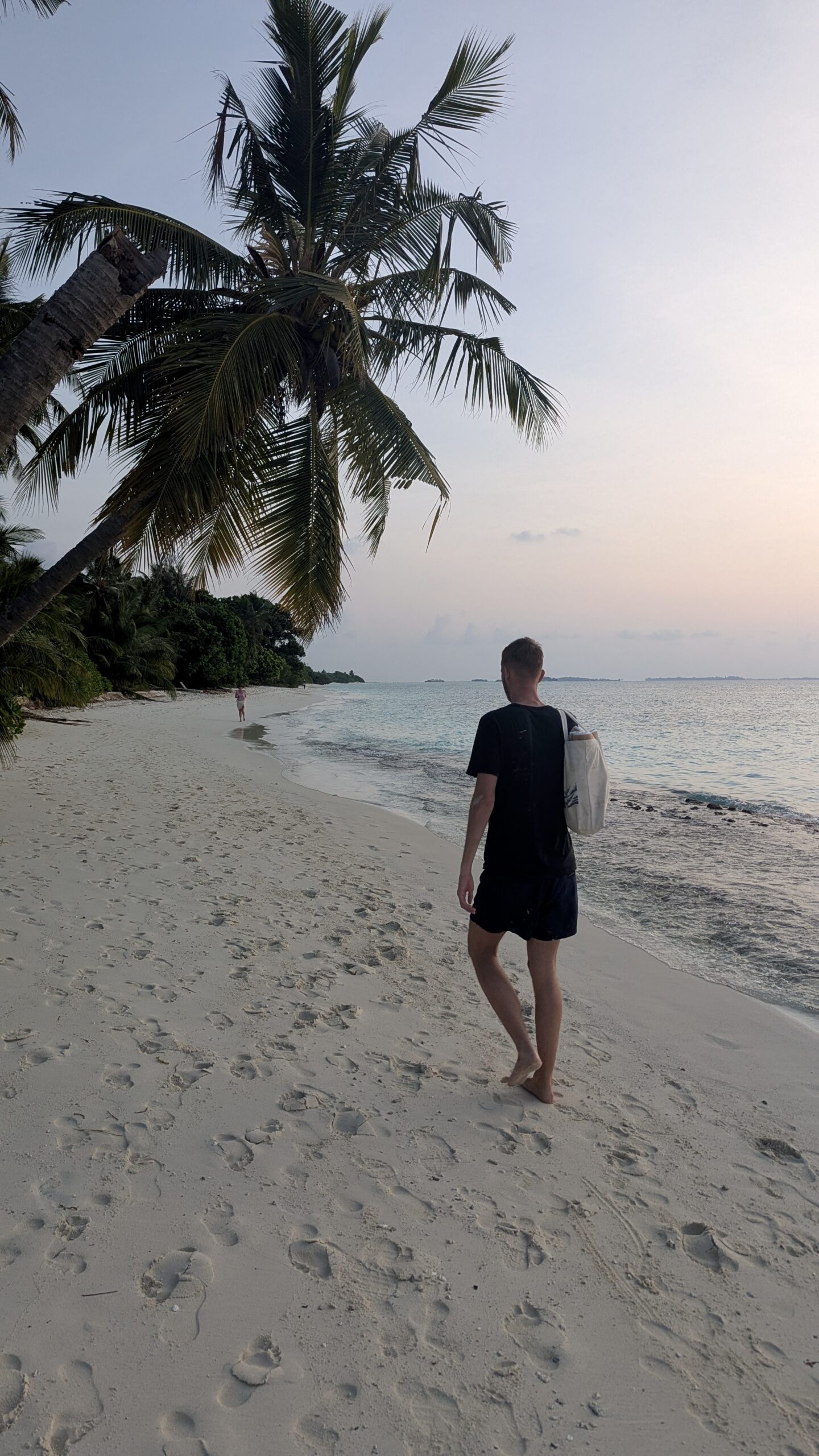 An der absoluten Spitze der Insel (wir kamen dort gegen 6 Uhr an) sieht man auf die nächste Insel, die jedoch für uns nicht zugänglich ist. Man kann bei Ebbe zwar zu ihr rüberlaufen, aber da es sich um eine private Resortinsel handelt, sind Nicht-Gäste dort ungern gesehen. Online hatten wir zudem gelesen, dass an manchen Morgenden in den flachen Wassern Mantas zu sehen sind, die über die Sandbank hinweg schwimmen. Leider begegnete uns nur ein kleiner Babyhai, der im seichten Wasser seine Kreise zog.