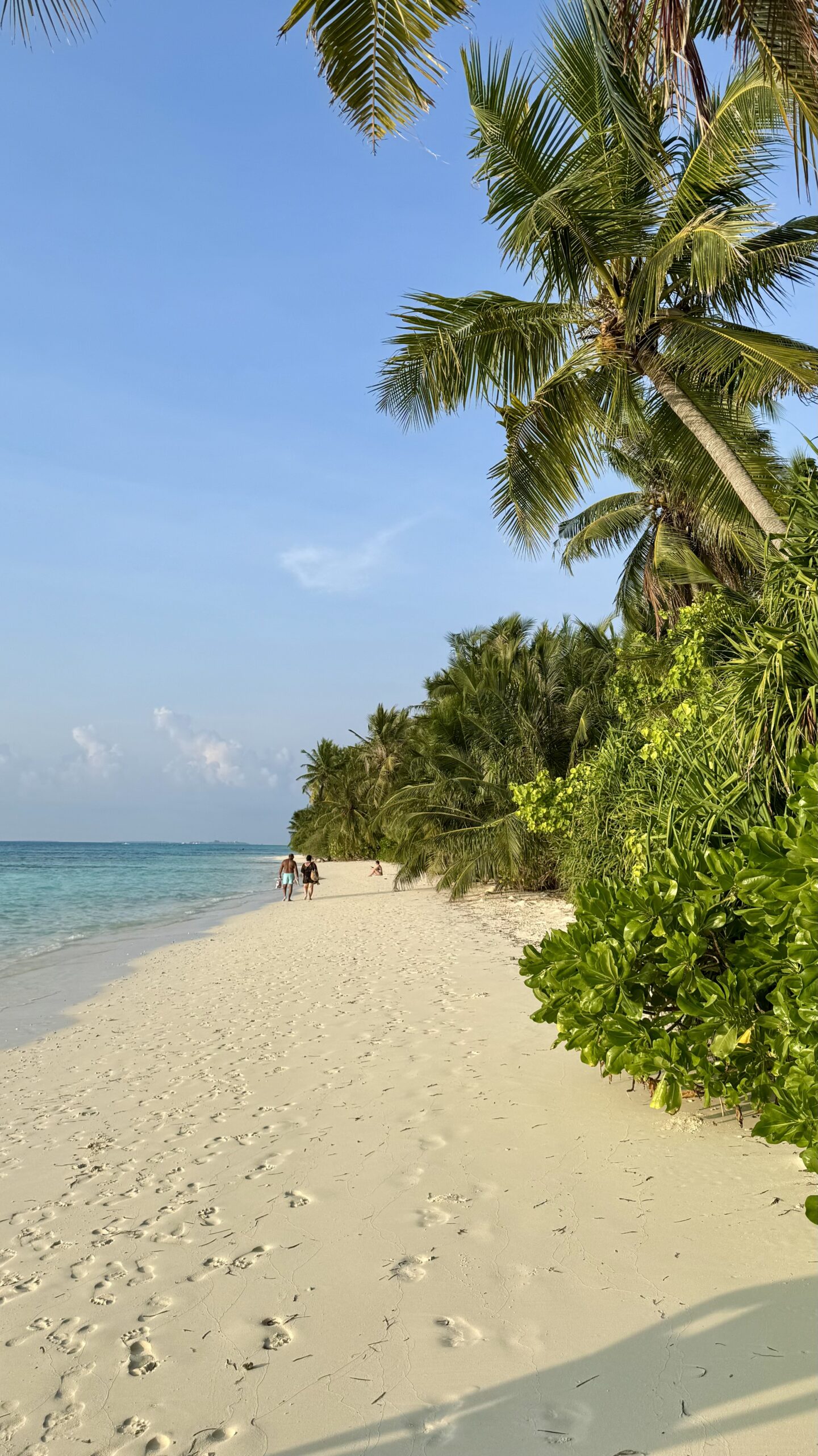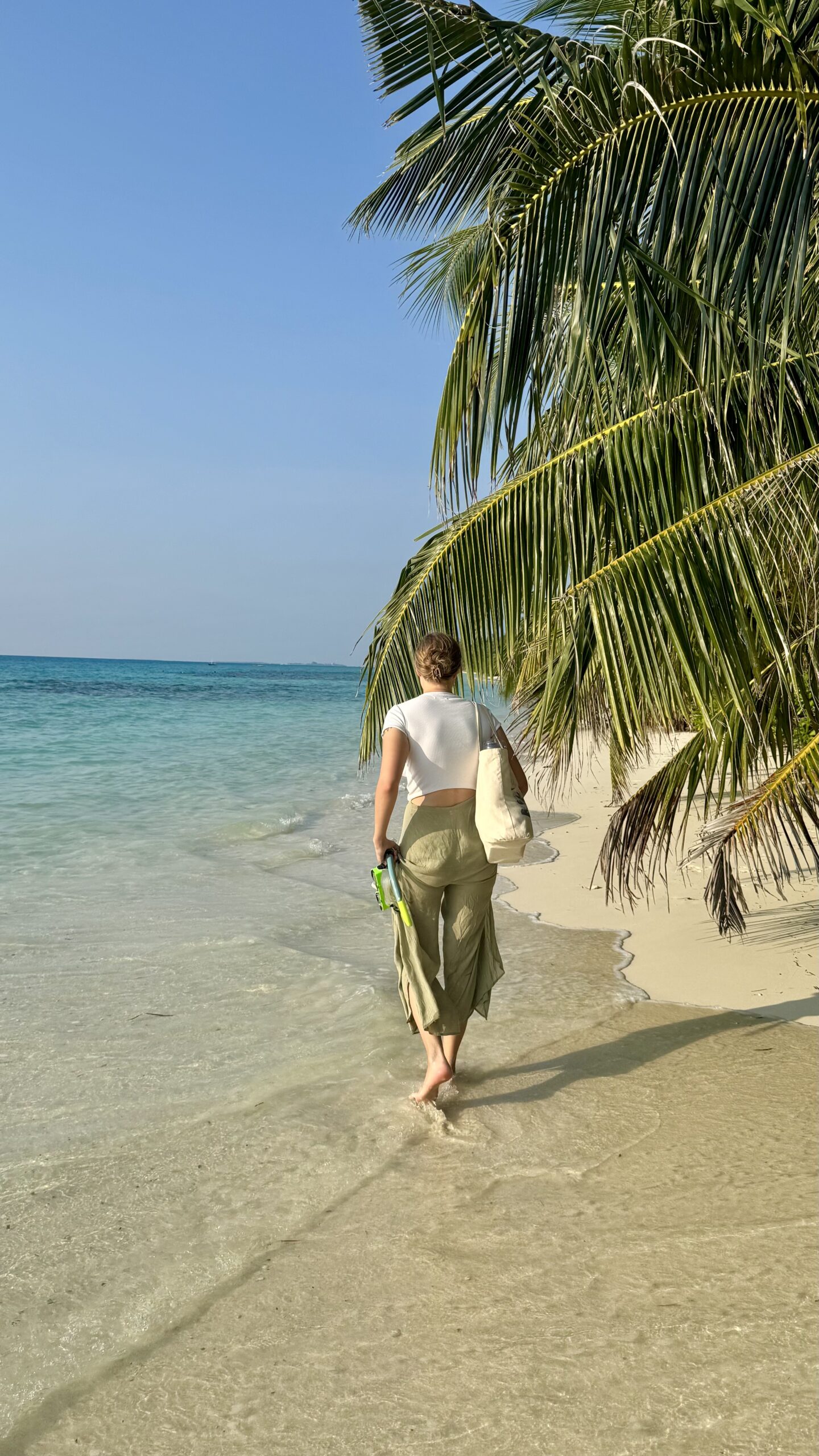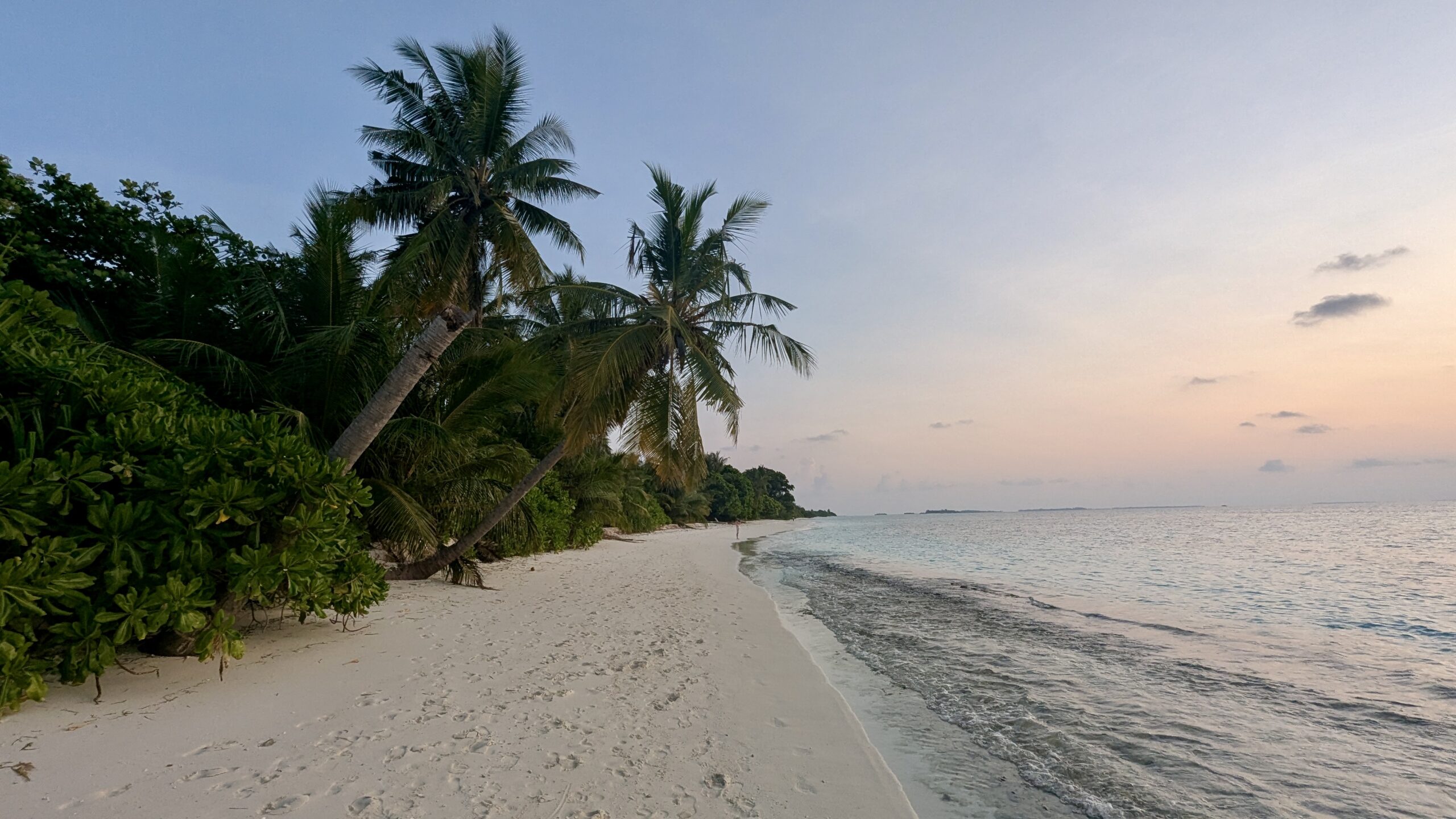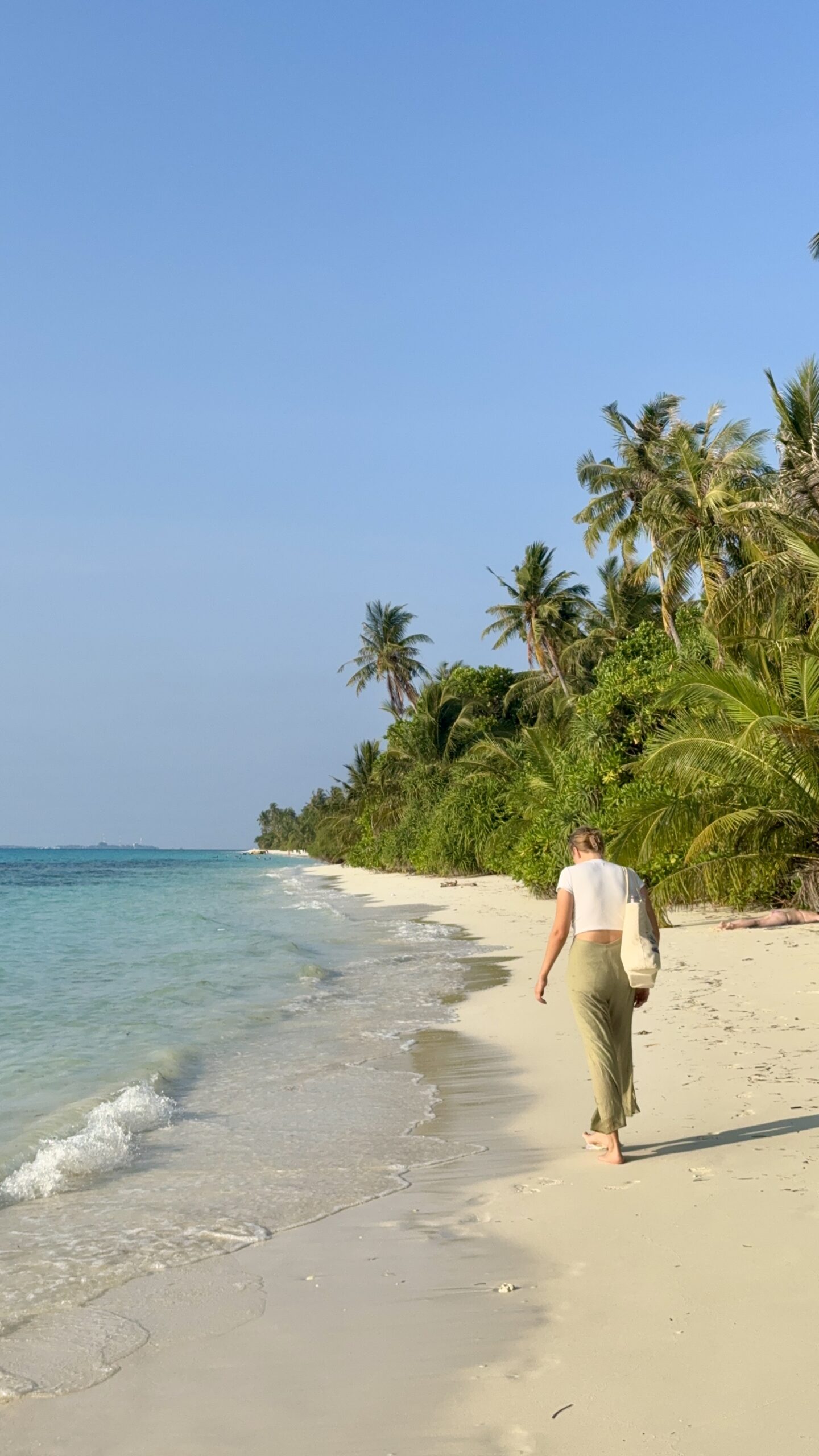 An der absoluten Spitze der Insel (wir kamen dort gegen 6 Uhr an) sieht man auf die nächste Insel, die jedoch für uns nicht zugänglich ist. Man kann bei Ebbe zwar zu ihr rüberlaufen, aber da es sich um eine private Resortinsel handelt, sind Nicht-Gäste dort ungern gesehen. Online hatten wir zudem gelesen, dass an manchen Morgenden in den flachen Wassern Mantas zu sehen sind, die über die Sandbank hinweg schwimmen. Leider begegnete uns nur ein kleiner Babyhai, der im seichten Wasser seine Kreise zog.
